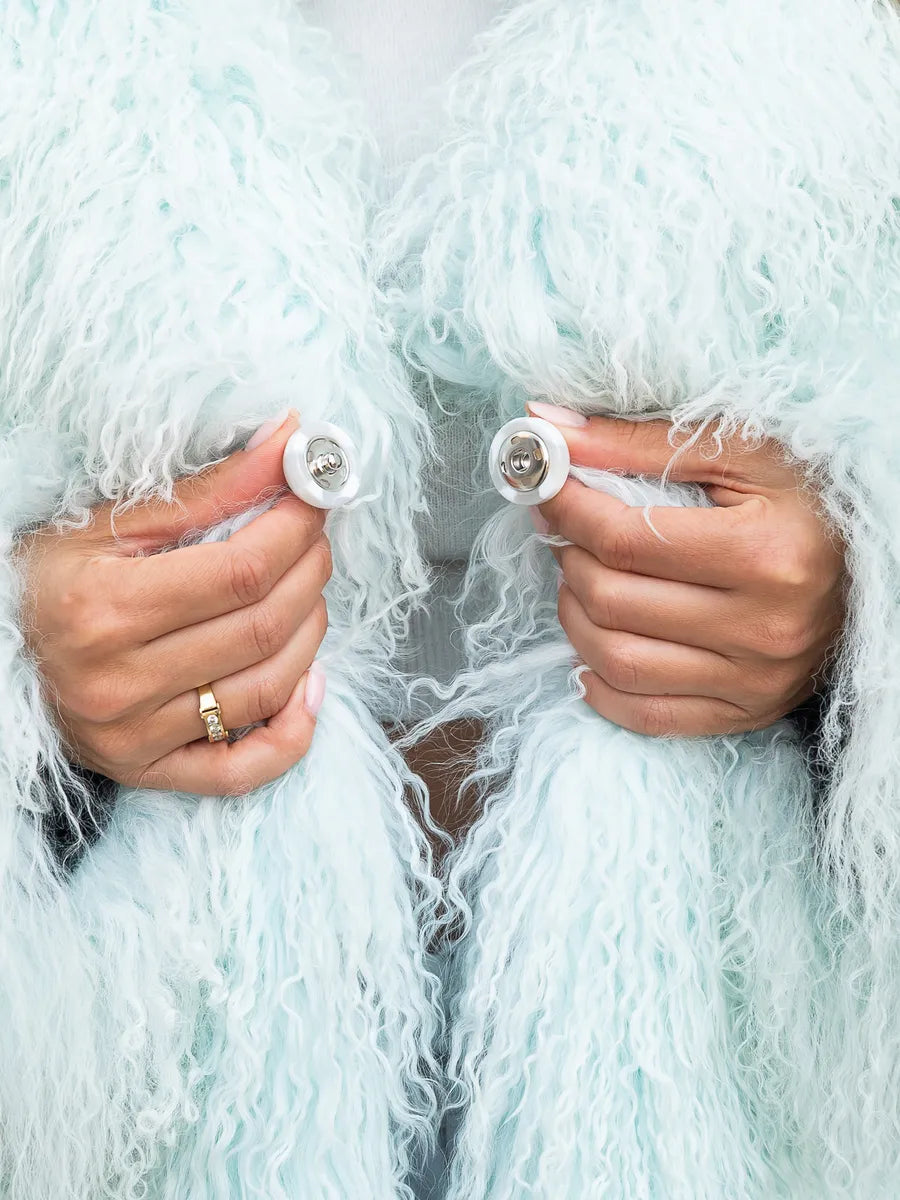 Nadia is a coat that reinterprets classic elegance in a modern and refined manner. Made entirely of natural llama fur, this piece stands out for its soft, long-pile texture and delicate pastel blue hue, perfect for the woman who dares to bring light and style even on the coldest days.