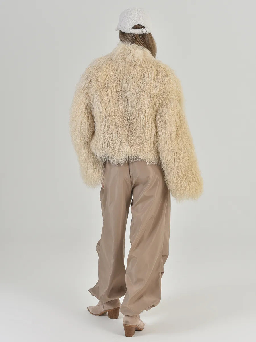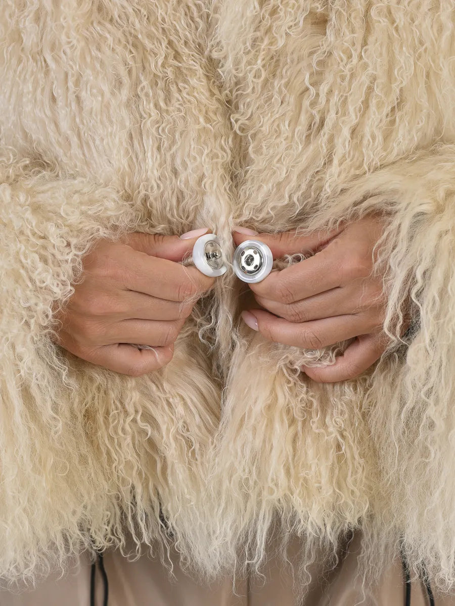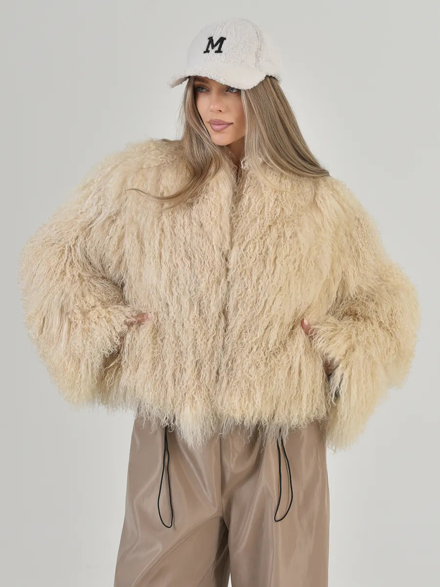 Eliza is a coat that exudes natural refinement and effortless elegance. Crafted from natural Mongolian sheepskin, it impresses with its soft, fluffy texture and sophisticated look, perfect for a modern yet comfortable look. The warm shade of light beige adds finesse and versatility, making it easy to integrate into any wardrobe.