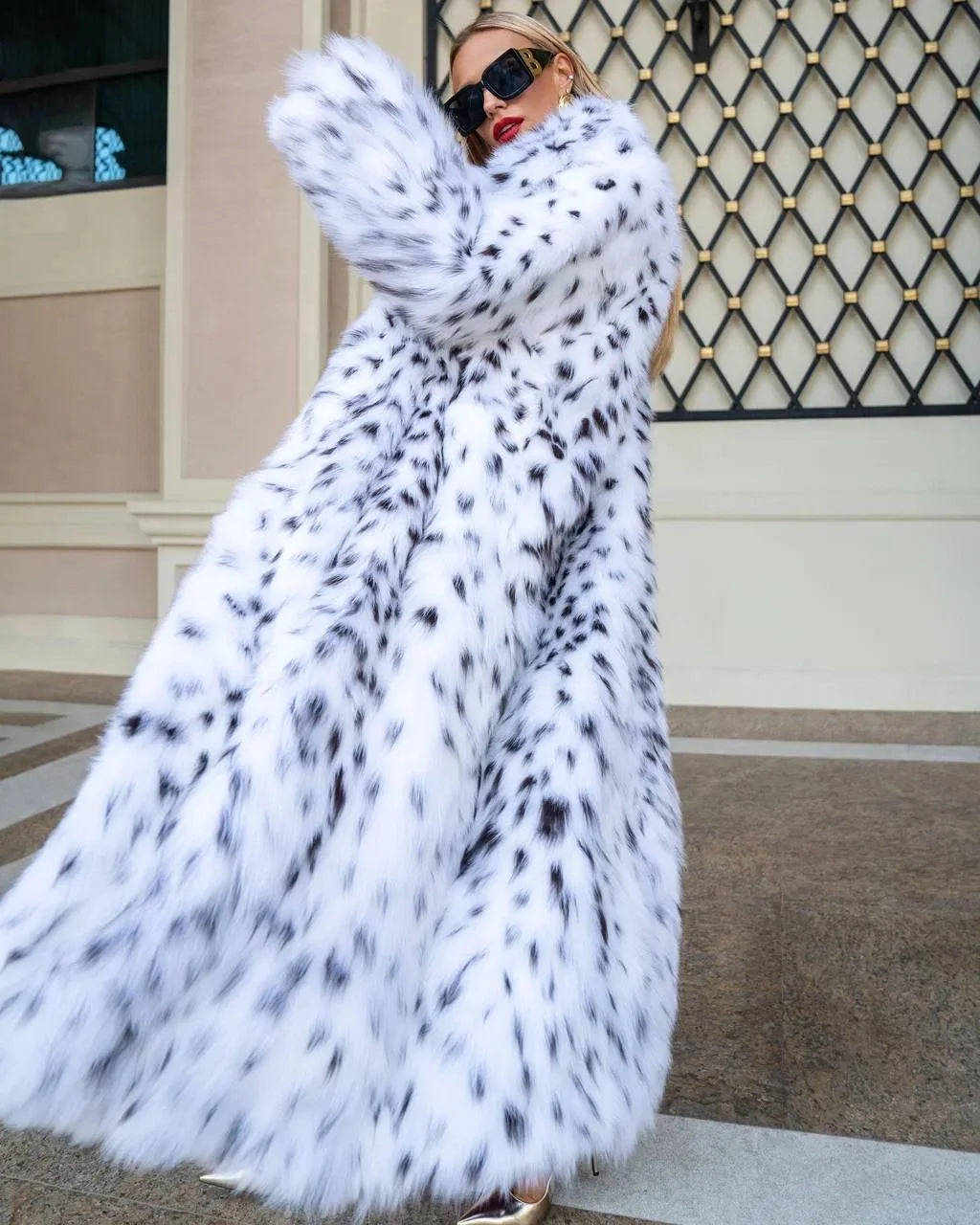 Aria is a spectacular eco-friendly coat, made of high-quality faux fur, created to faithfully reproduce the luxurious texture of lynx fur with accents inspired by lynx fur. The predominantly white shade, sprinkled with black and gray inserts, creates a sophisticated and extremely refined visual effect. The long cut and generous volume transform this piece into a perfect statement for elegant and modern appearances.