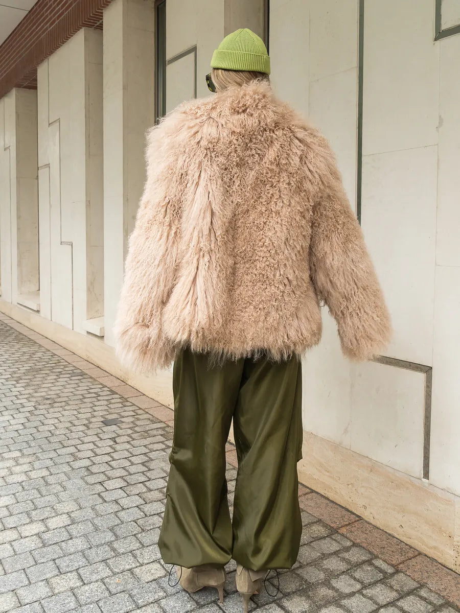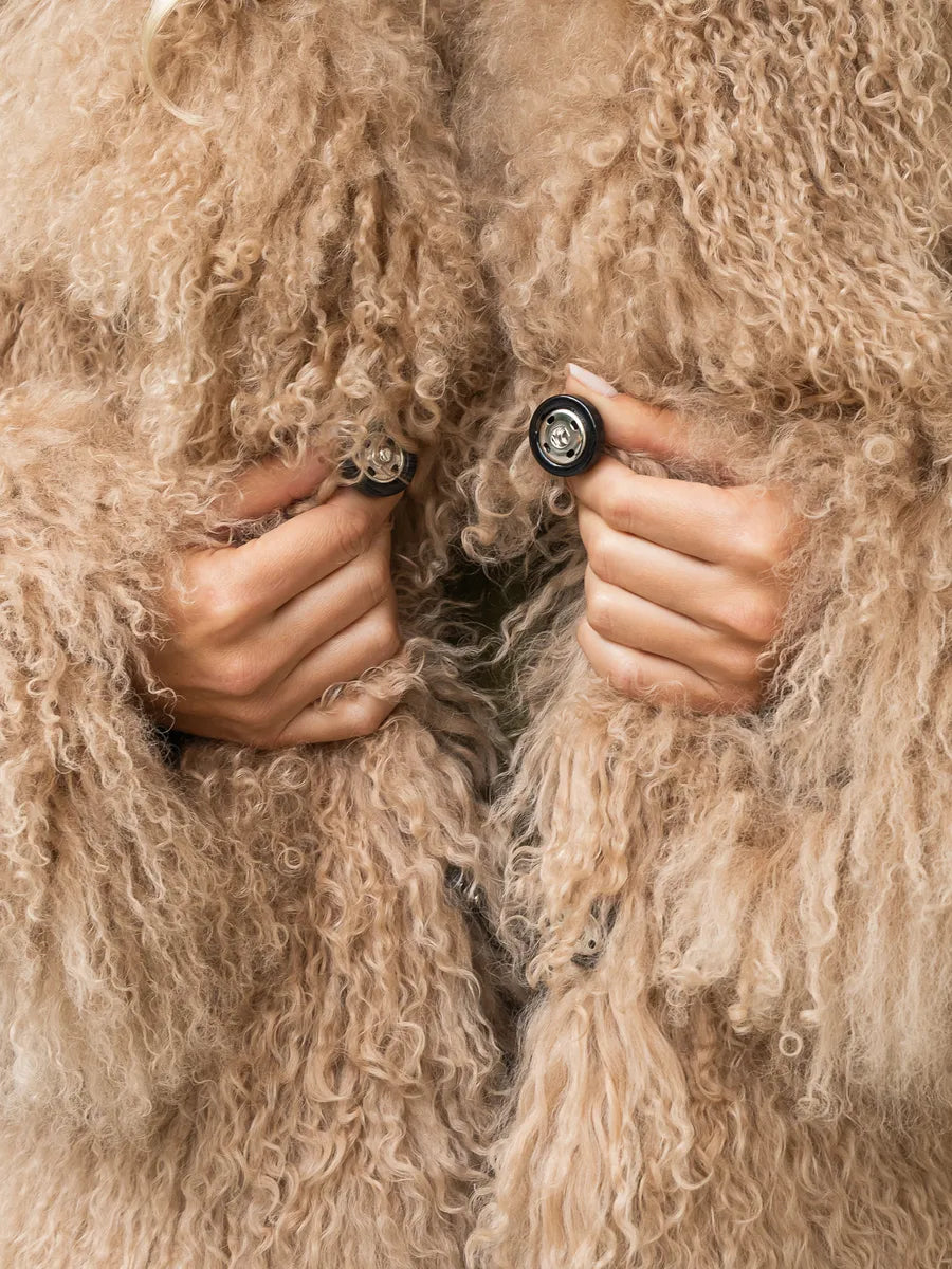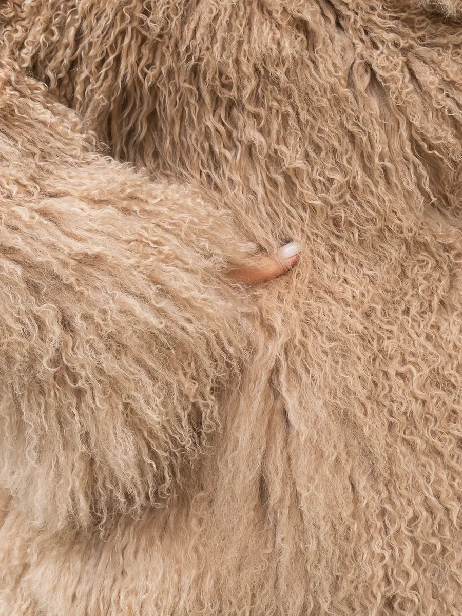 Amira is a piece that exudes style, comfort and authenticity. Made from natural Mongolian sheepskin, the coat combines the soft and voluminous texture of natural fibers with a modern and elegant cut. The warm beige shade makes it easy to integrate into any winter wardrobe, adding sophistication to any outfit.