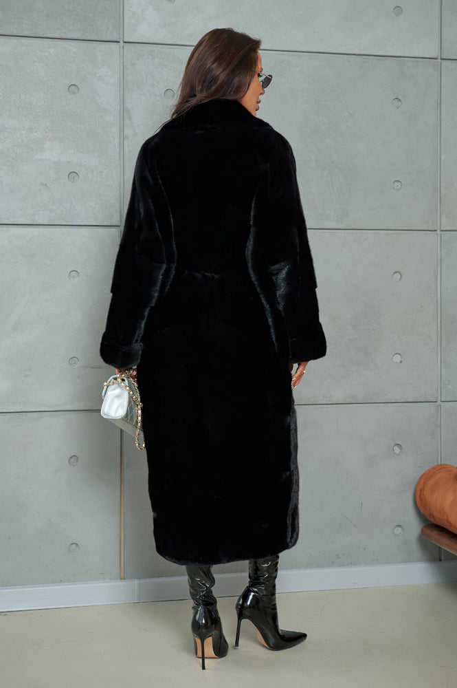 Vera este definiția luxului pur: o jachetă lungă din blană naturală de vizon, cu o textură mătăsoasă și un luciu profund specific nurcii de cea mai înaltă calitate. Croiala lungă și elegantă, alături de gulerul amplu și cordonul din blană, conturează o siluetă feminină, sofisticată și modernă.