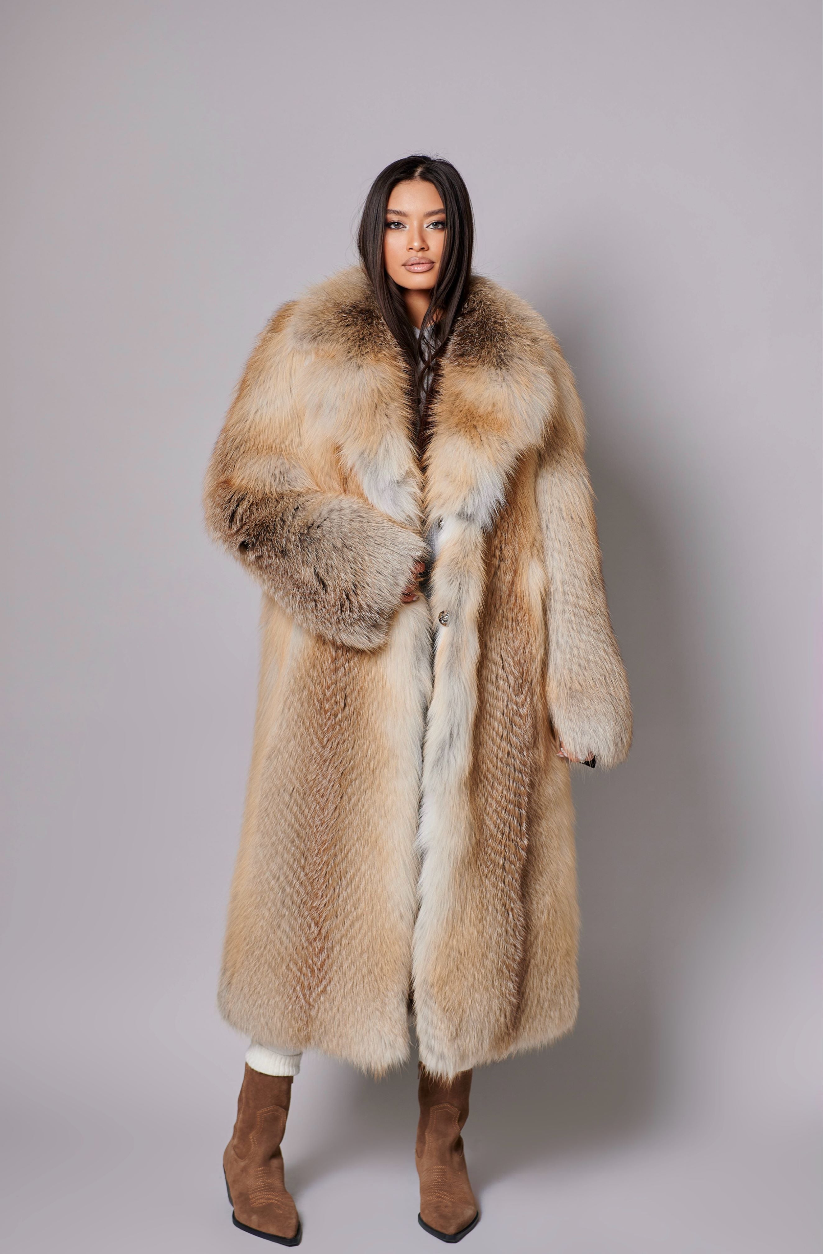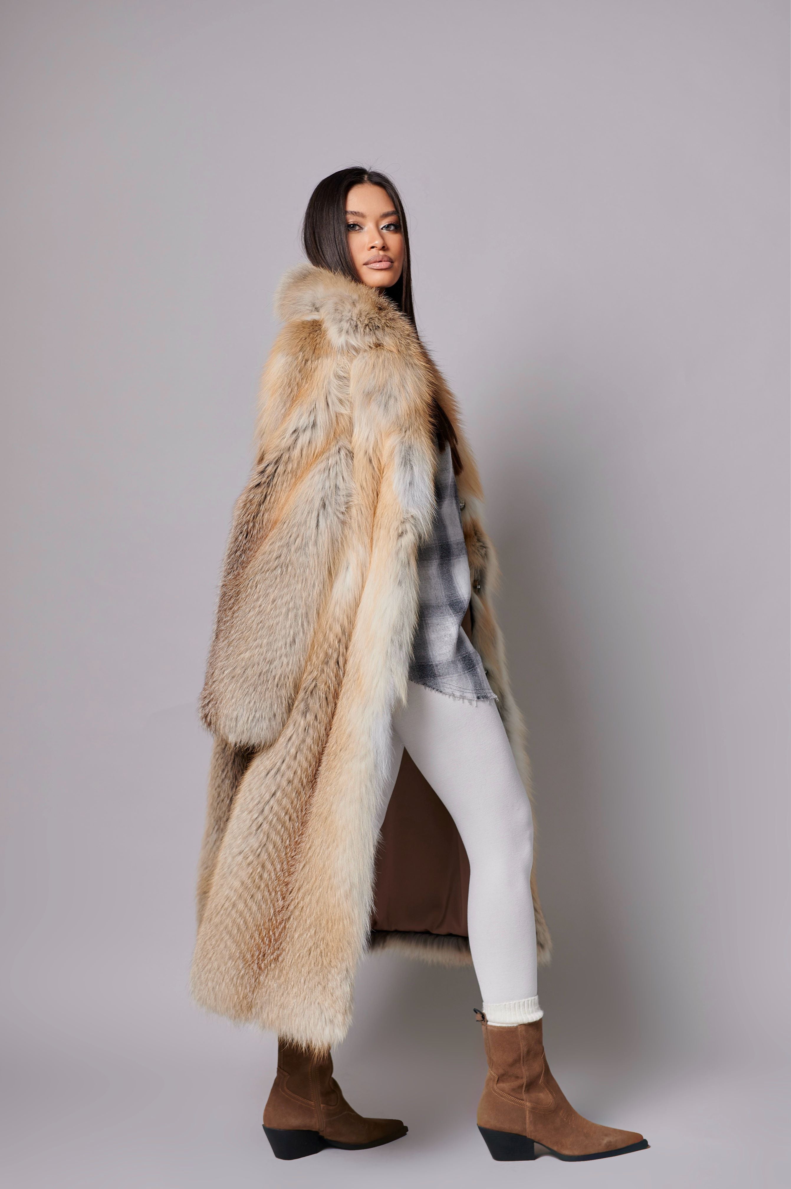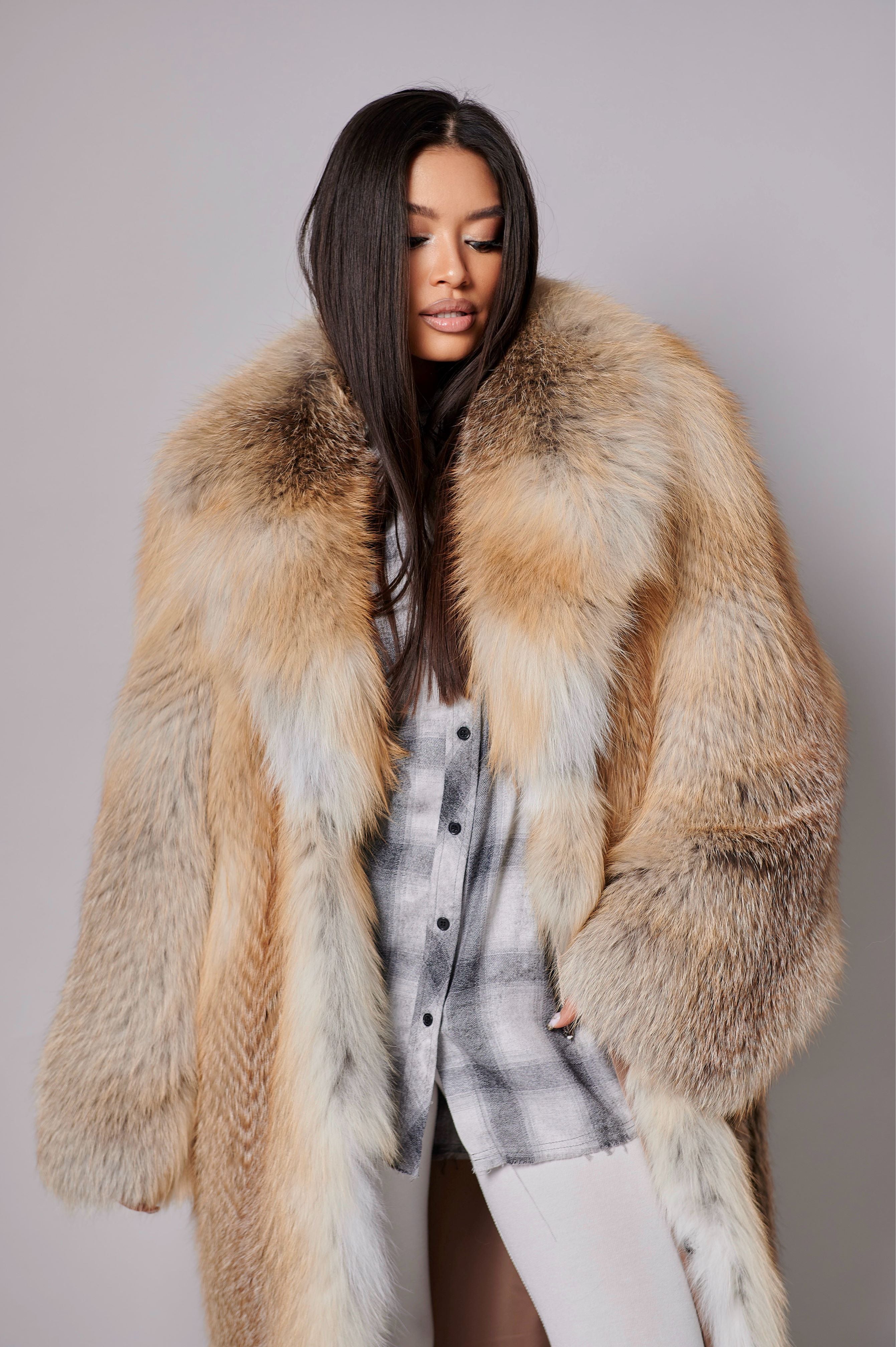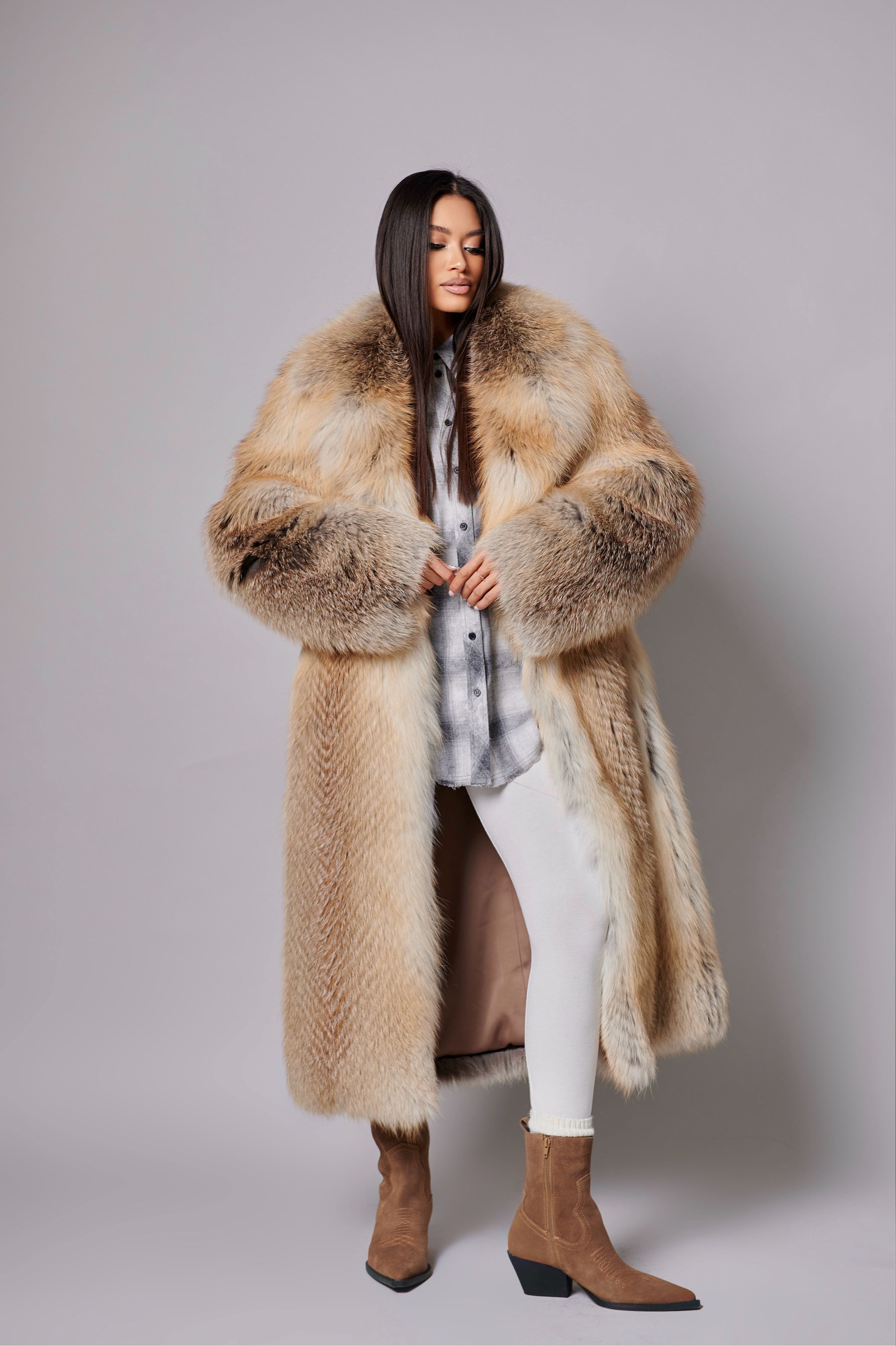 Joanna este o piesă statement creată pentru femeile care apreciază luxul autentic și eleganța fără timp. Realizată din blană naturală de vulpe Gold, această jachetă lungă impresionează prin volumul său spectaculos, textura moale și reflexiile calde, aurii. Linia amplă a umerilor și manșetele bogate accentuează silueta, oferind un look opulent, dar perfect echilibrat.