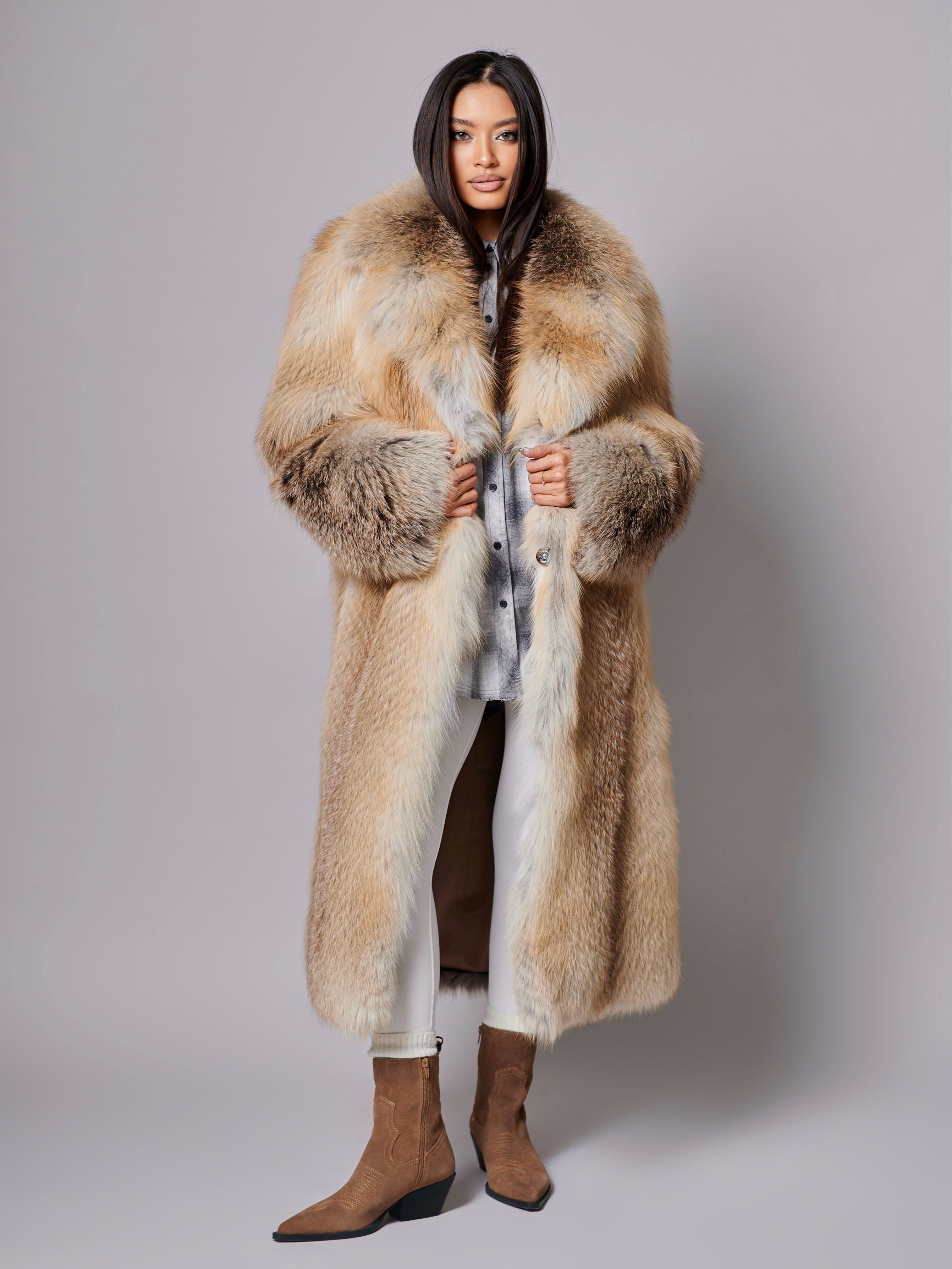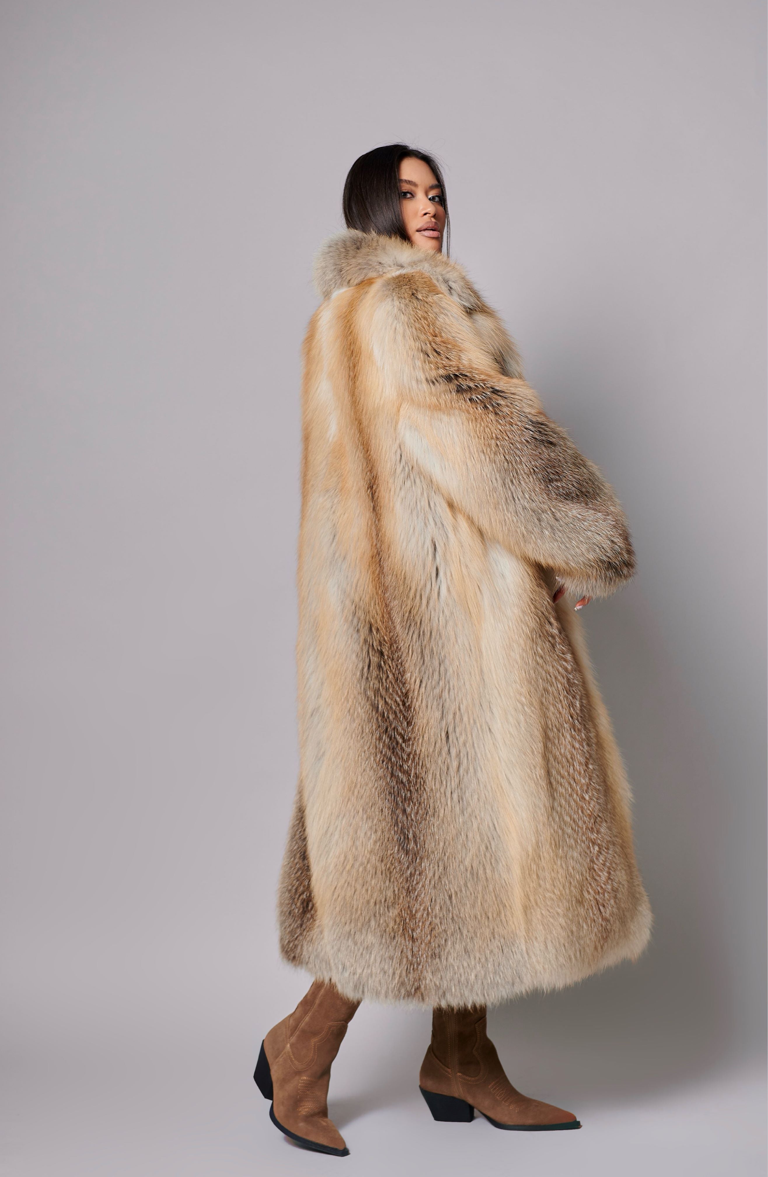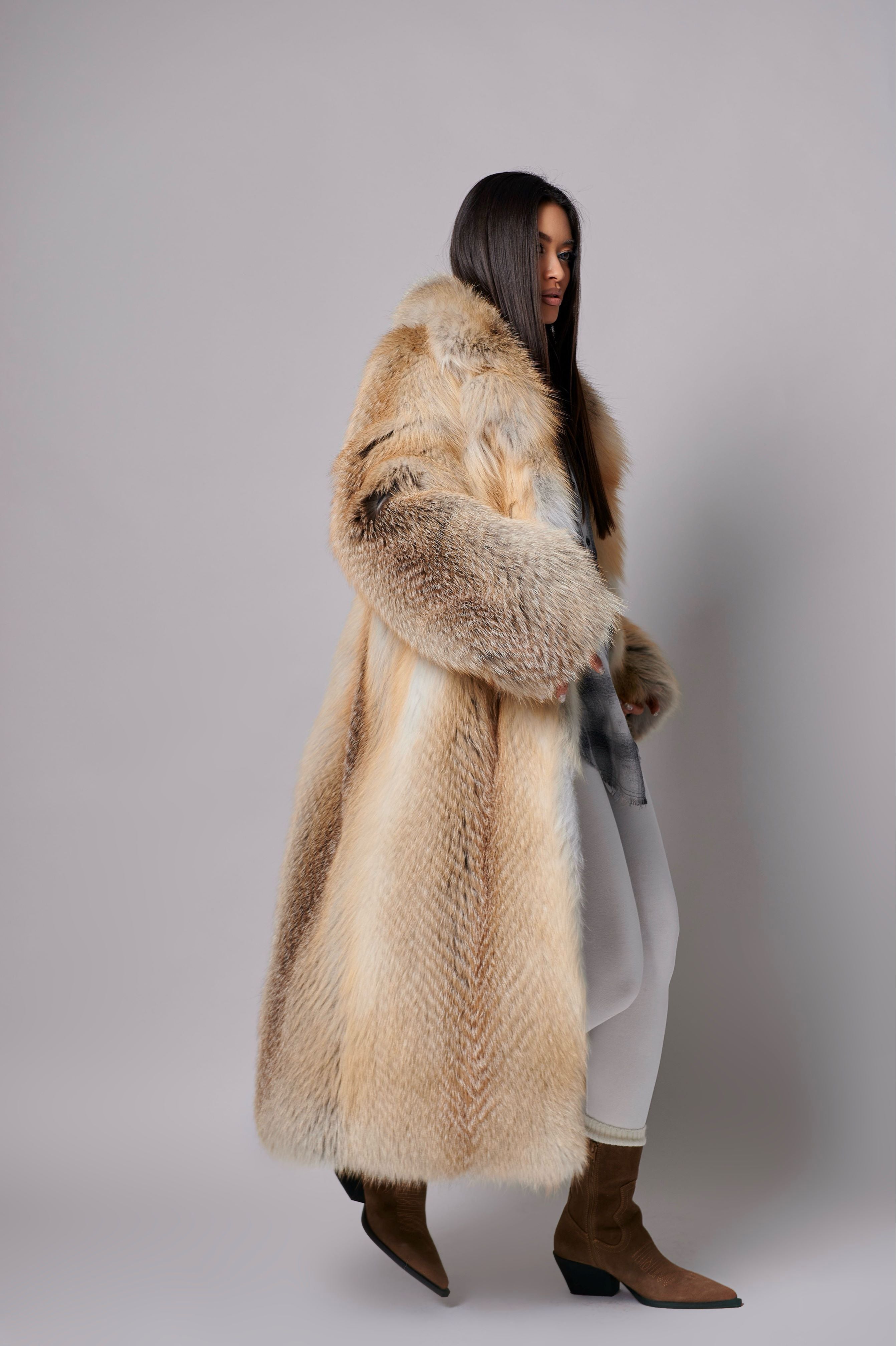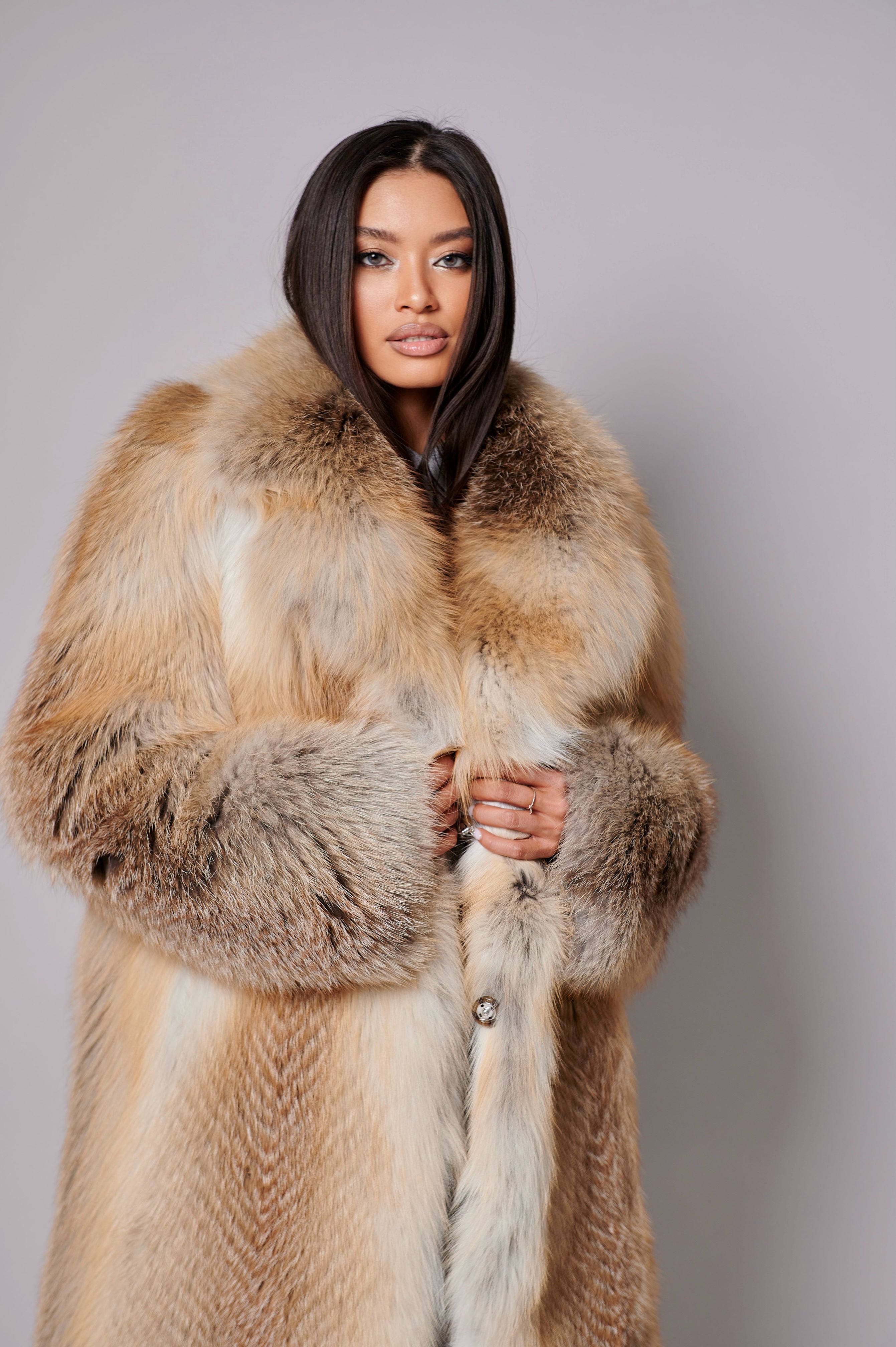 Joanna este o piesă statement creată pentru femeile care apreciază luxul autentic și eleganța fără timp. Realizată din blană naturală de vulpe Gold, această jachetă lungă impresionează prin volumul său spectaculos, textura moale și reflexiile calde, aurii. Linia amplă a umerilor și manșetele bogate accentuează silueta, oferind un look opulent, dar perfect echilibrat.