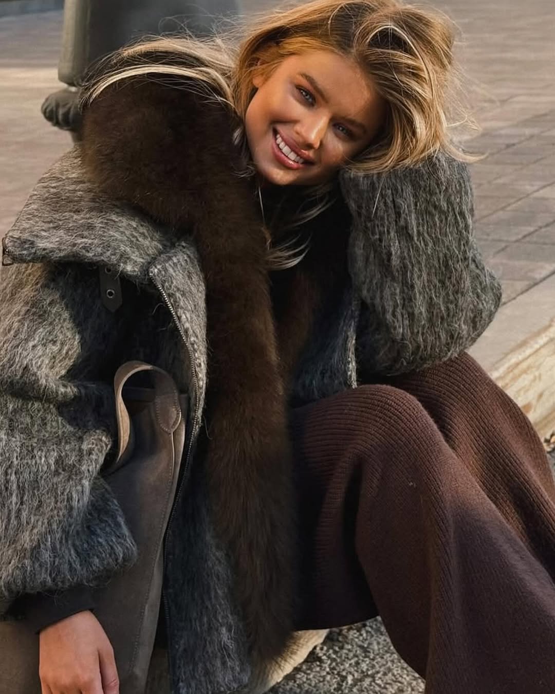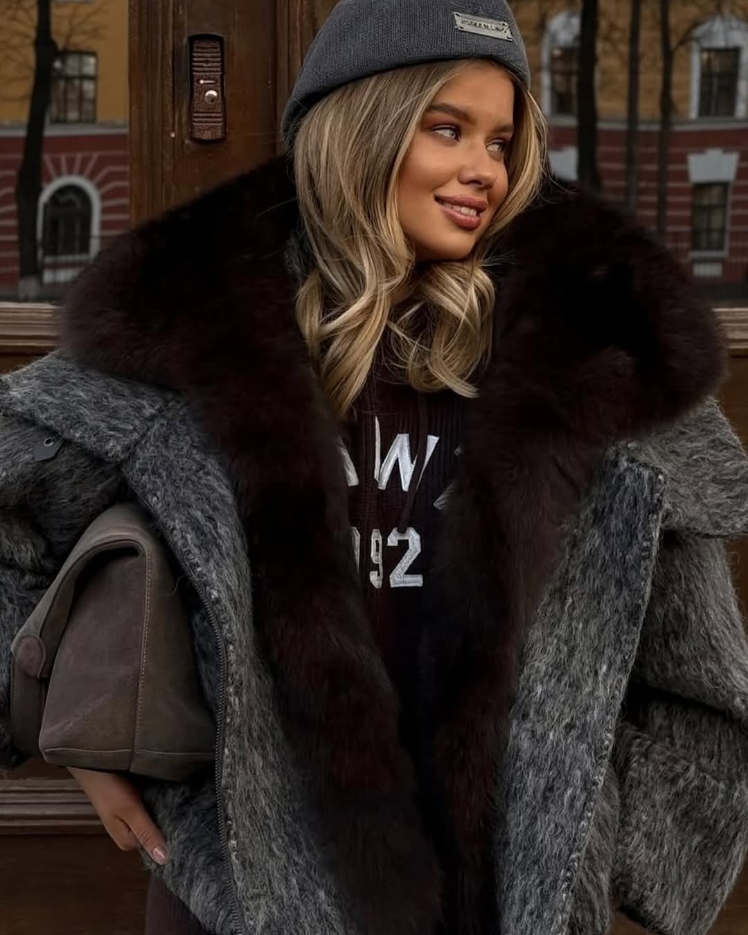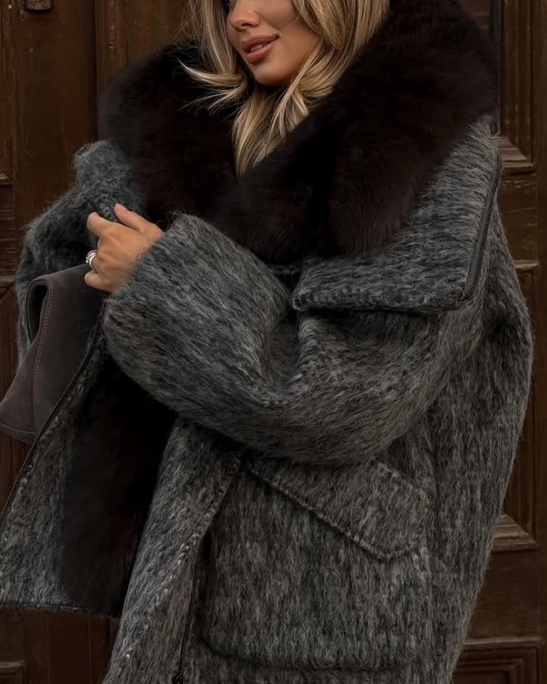 Oversized jacket made of thick premium fabric, with a large natural fox fur collar in warm shades of brown and gray. The voluminous cut offers a modern air, perfectly balanced between elegance and urban attitude.