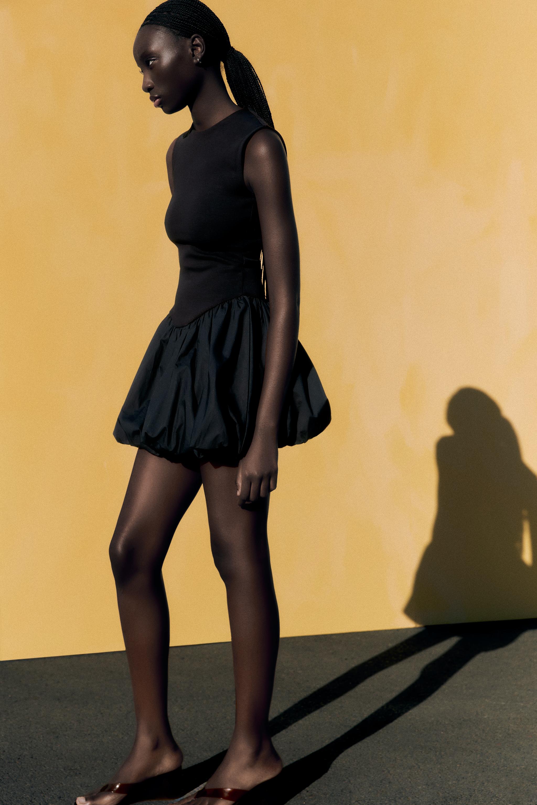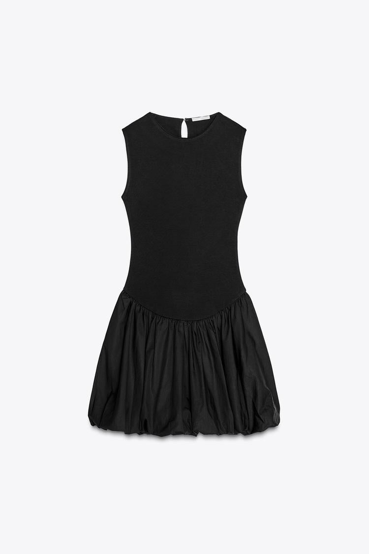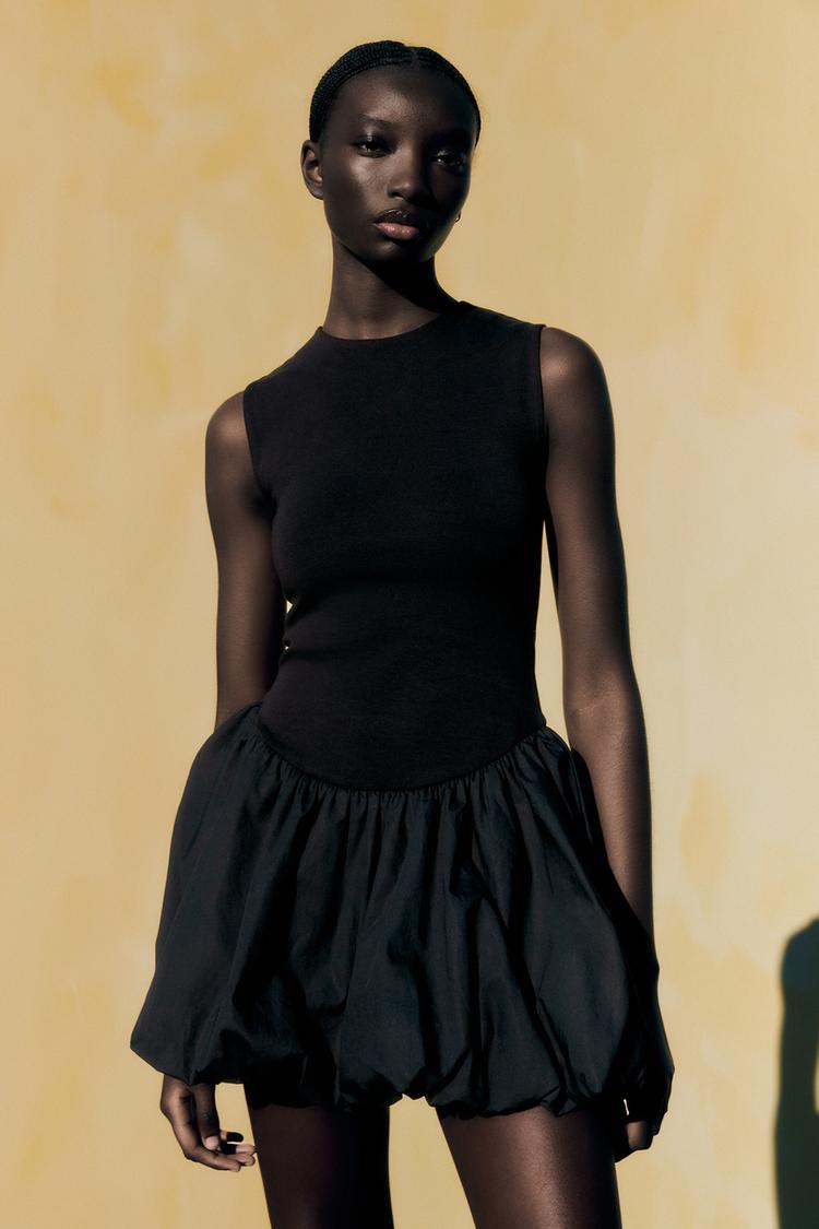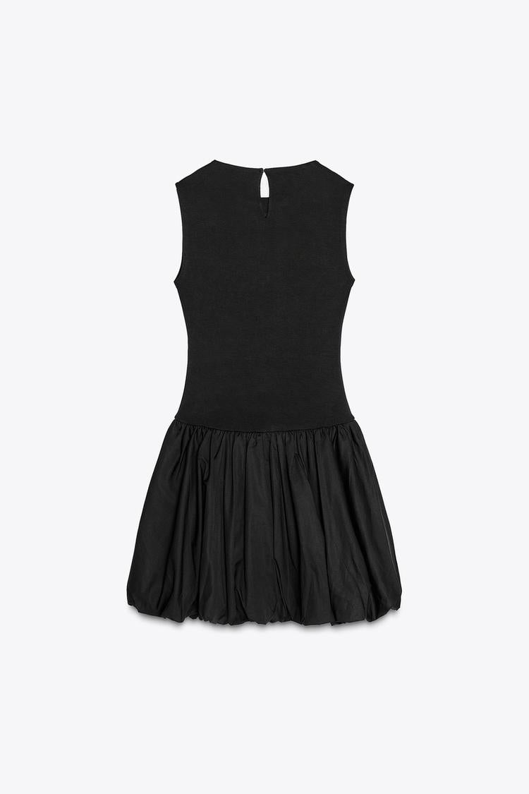 This elegant mini dress in classic black combines a minimalist design with a playful touch. The top is made of a slightly stretchy, sleeveless material that highlights the figure, while the puffy skirt in a flowing material adds volume and movement. The round neckline and discreet back closure complete the modern and versatile design.