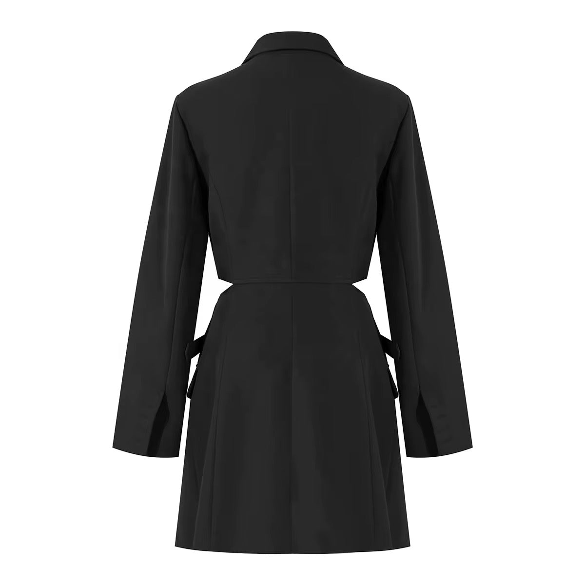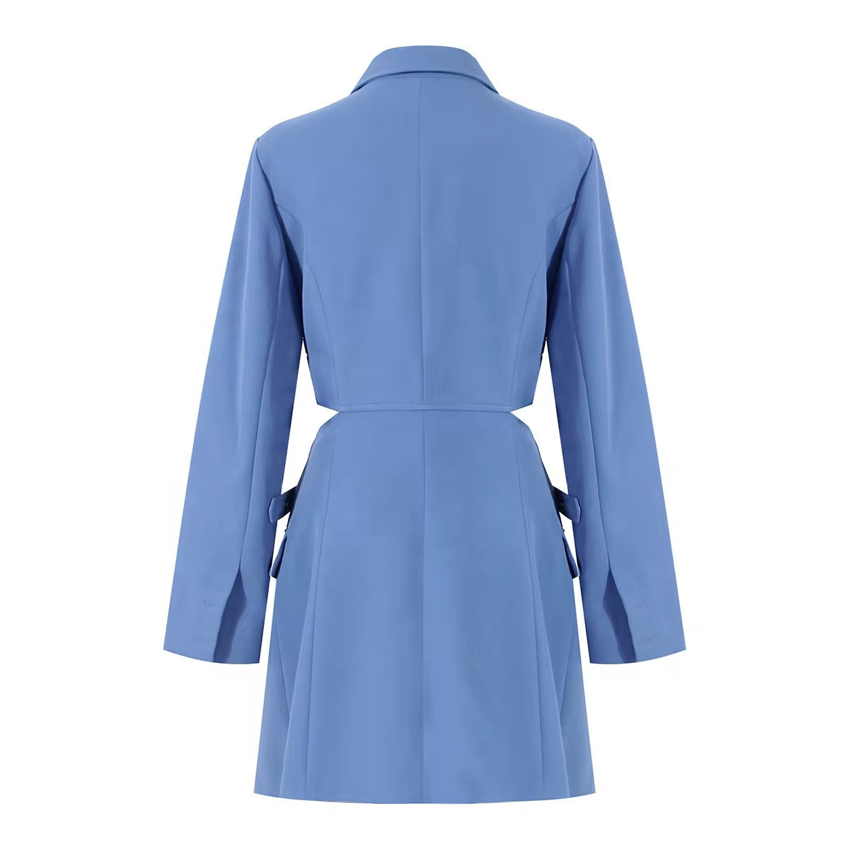 Set consisting of a cropped jacket with straps and a wrap mini skirt with metallic details. Available in two colors: black and blue.
