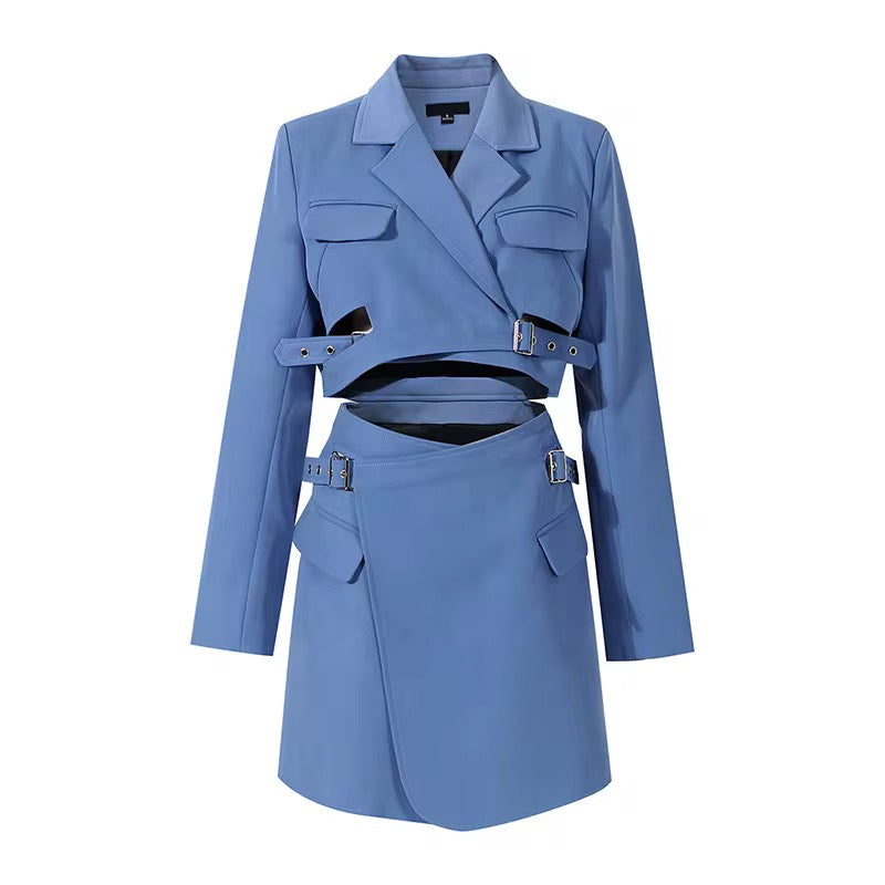 Cropped Jacket & Mini Skirt Set with Belts – Available in Black and Blue