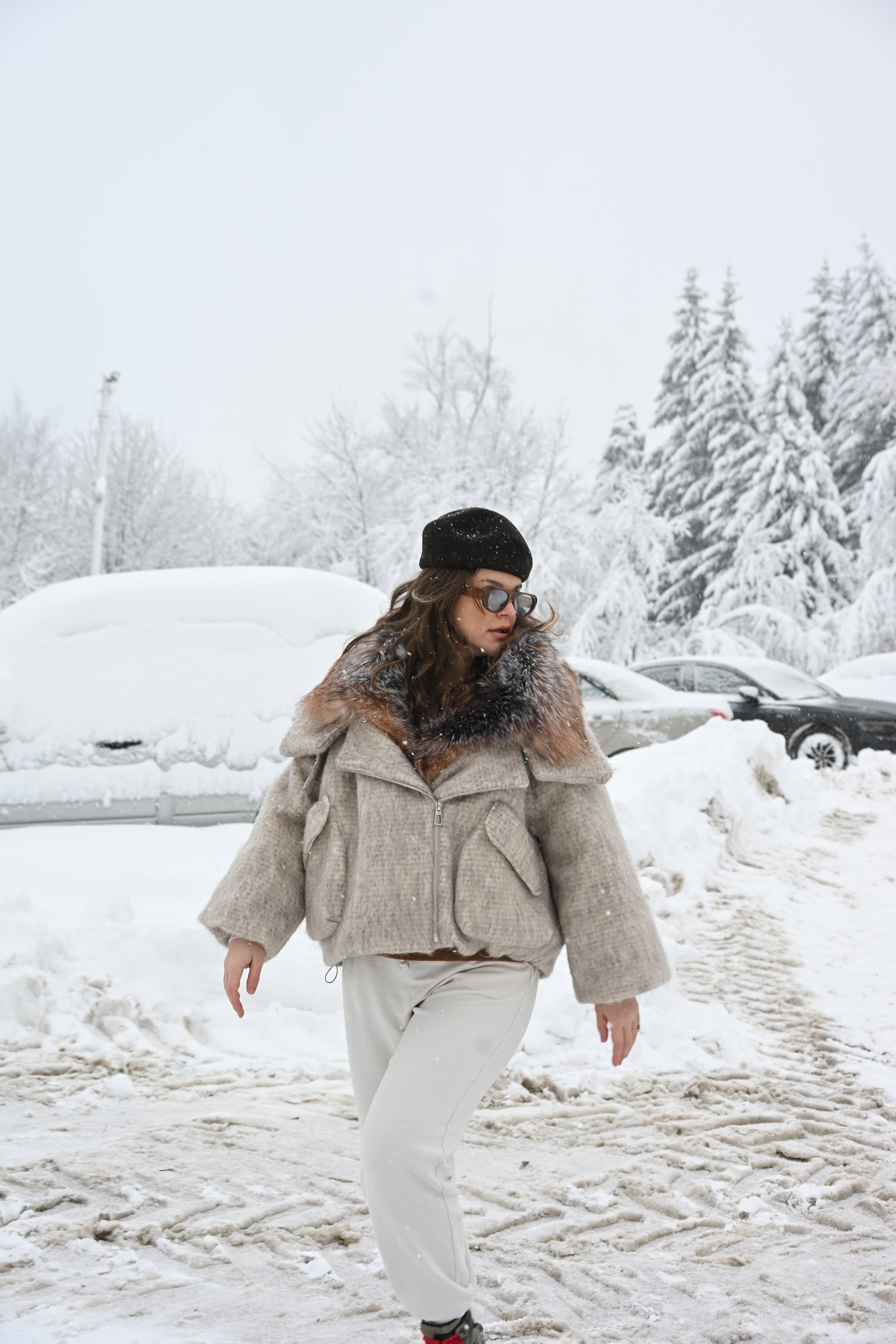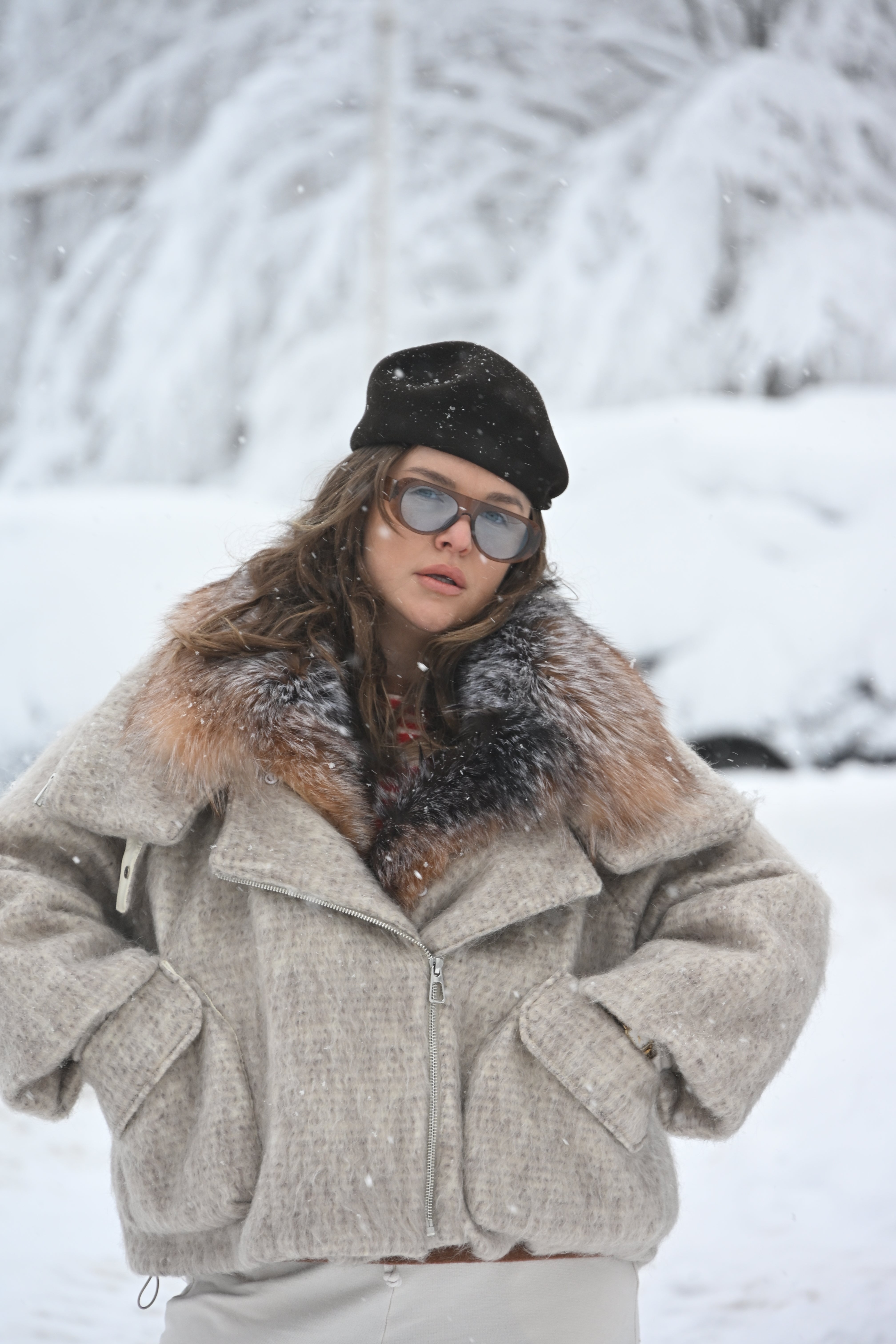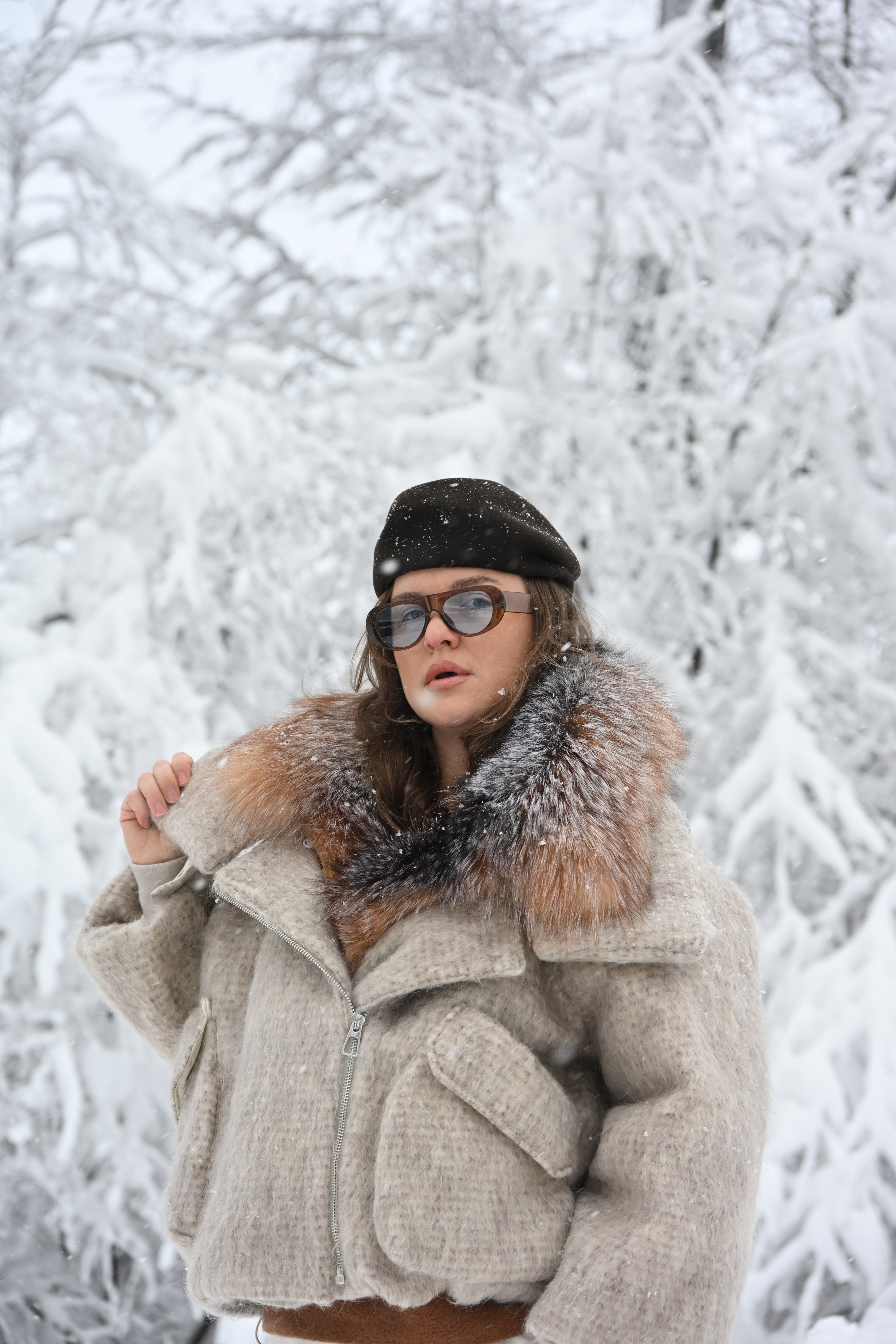 Jachetă oversize confecționată din stofă groasă premium, cu guler amplu din blană naturală de vulpe în nuanțe calde de maro și gri. Croiala voluminoasă oferă un aer modern, perfect echilibrat între eleganță și atitudine urbană.