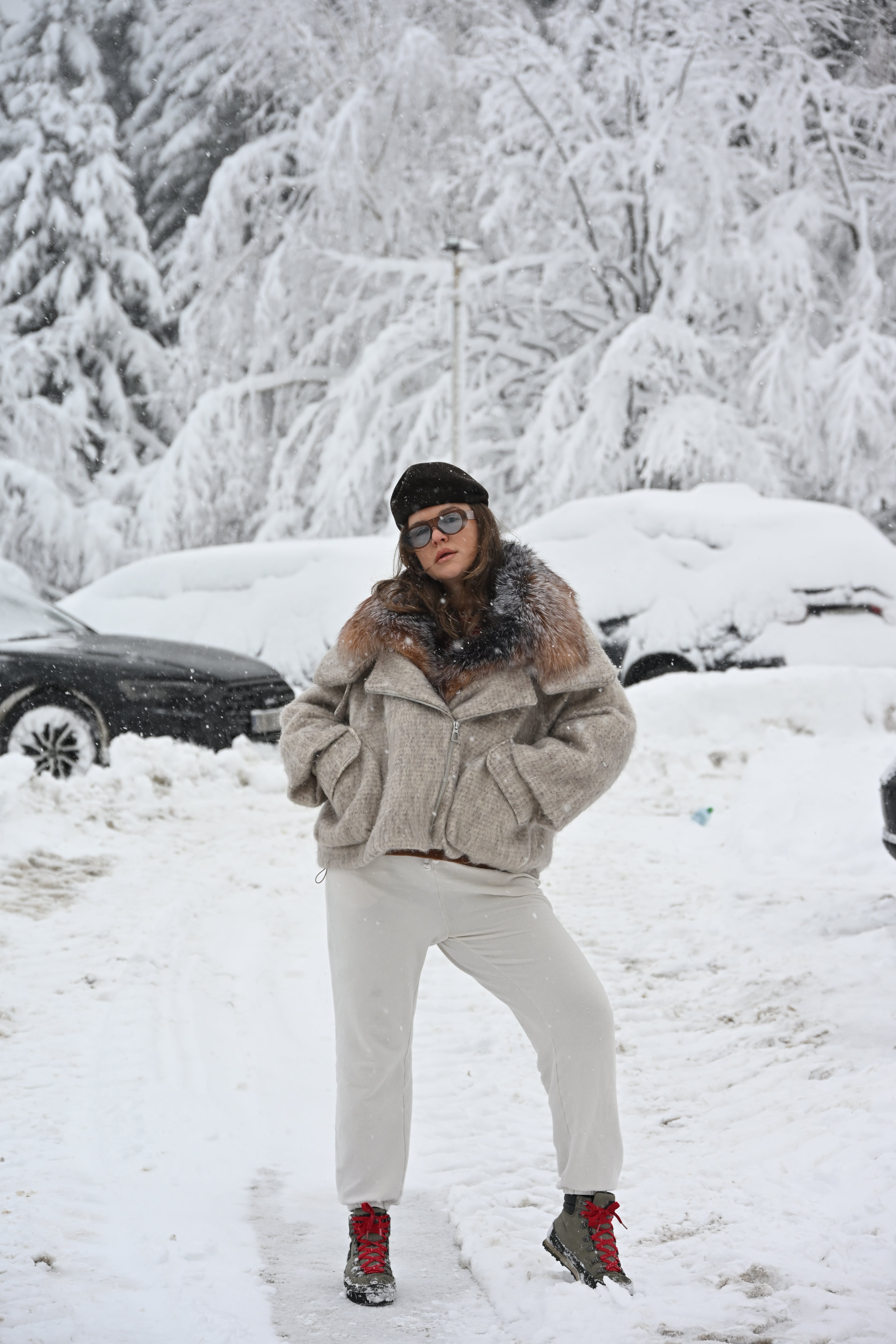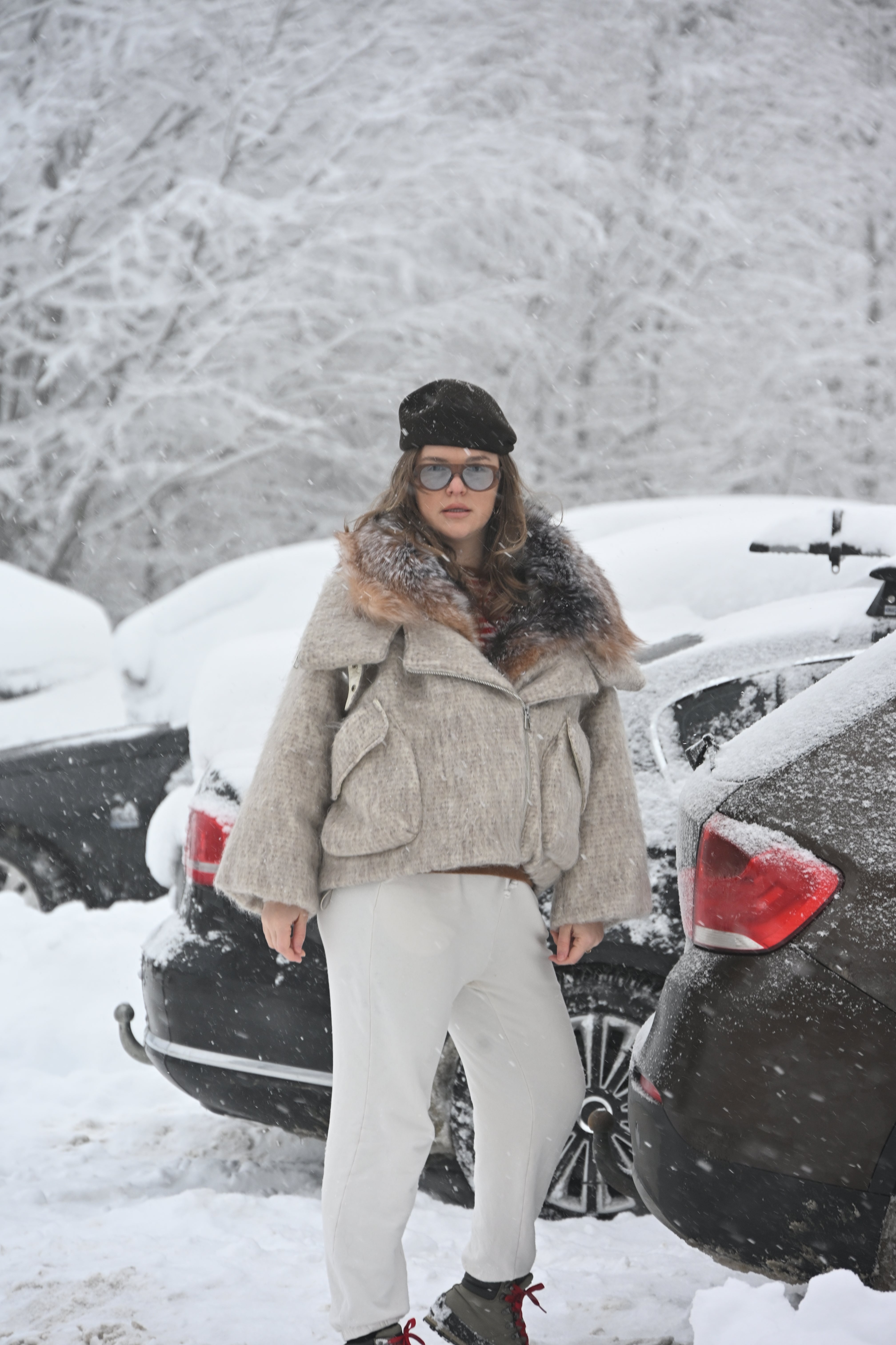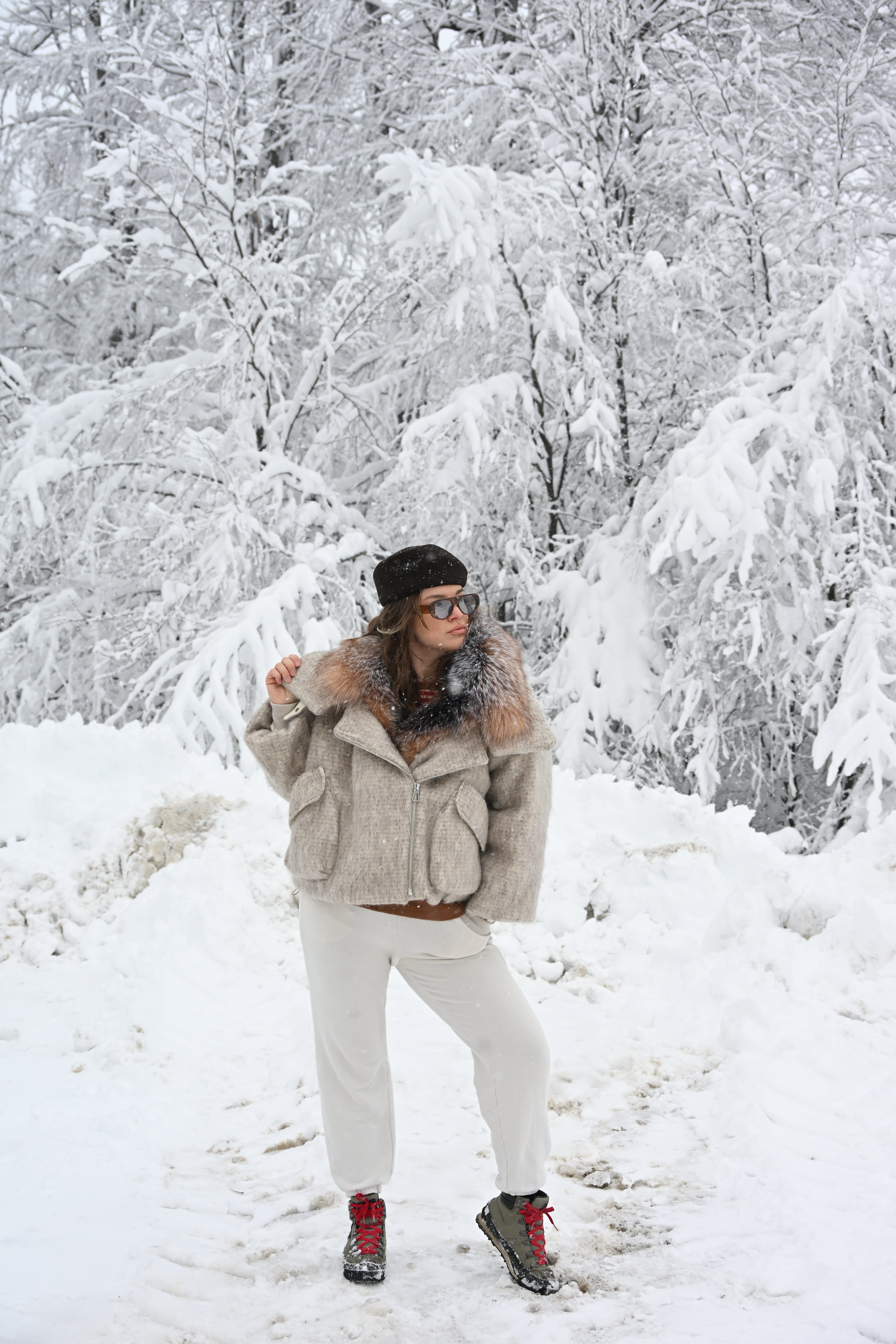 Jachetă oversize confecționată din stofă groasă premium, cu guler amplu din blană naturală de vulpe în nuanțe calde de maro și gri. Croiala voluminoasă oferă un aer modern, perfect echilibrat între eleganță și atitudine urbană.