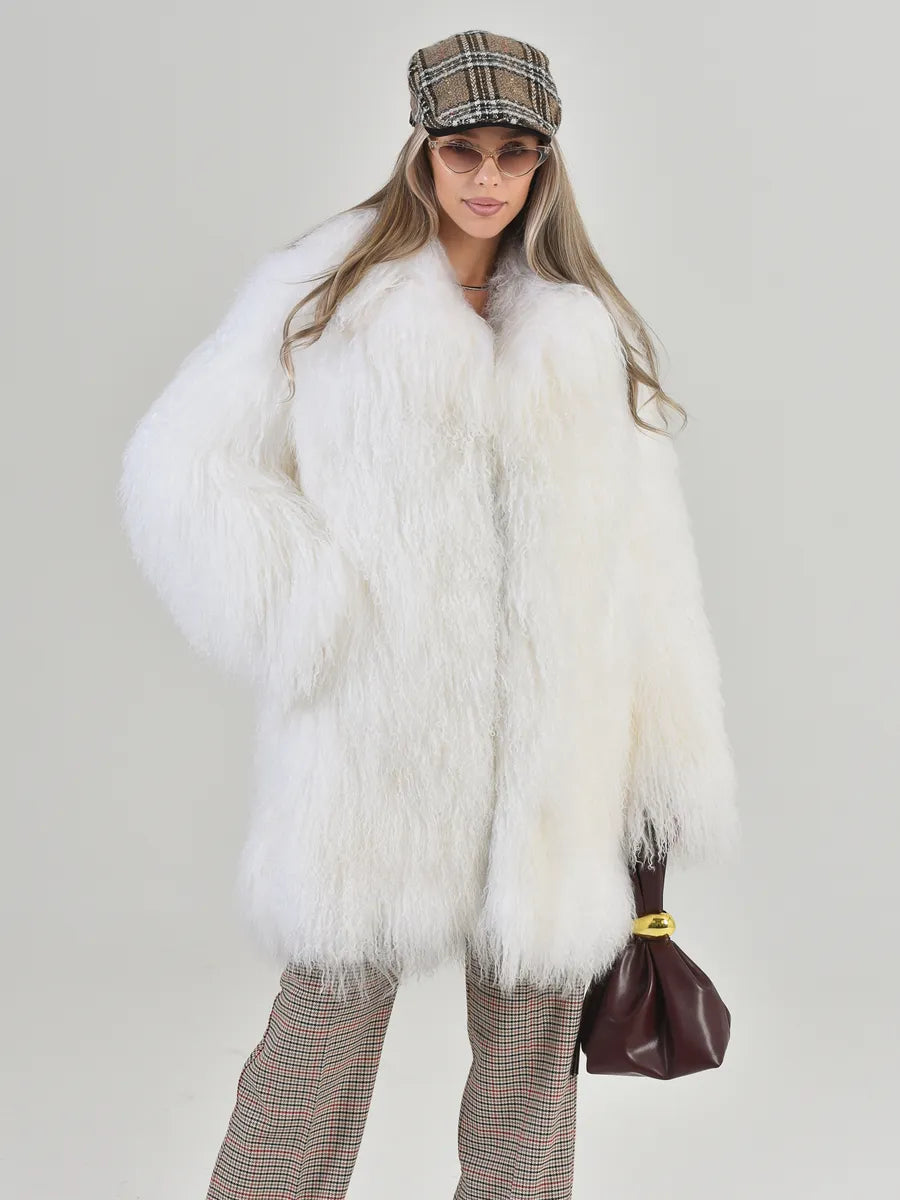 Clara is a coat that defines pure elegance, bringing an air of refinement and delicacy. Made of natural Mongolian sheepskin fur, it impresses with its silky, rich texture and immaculate shade of white, ideal for the woman who loves subtle and timeless luxury. The wide English collar perfectly complements the classic cut, offering an extra touch of presence.