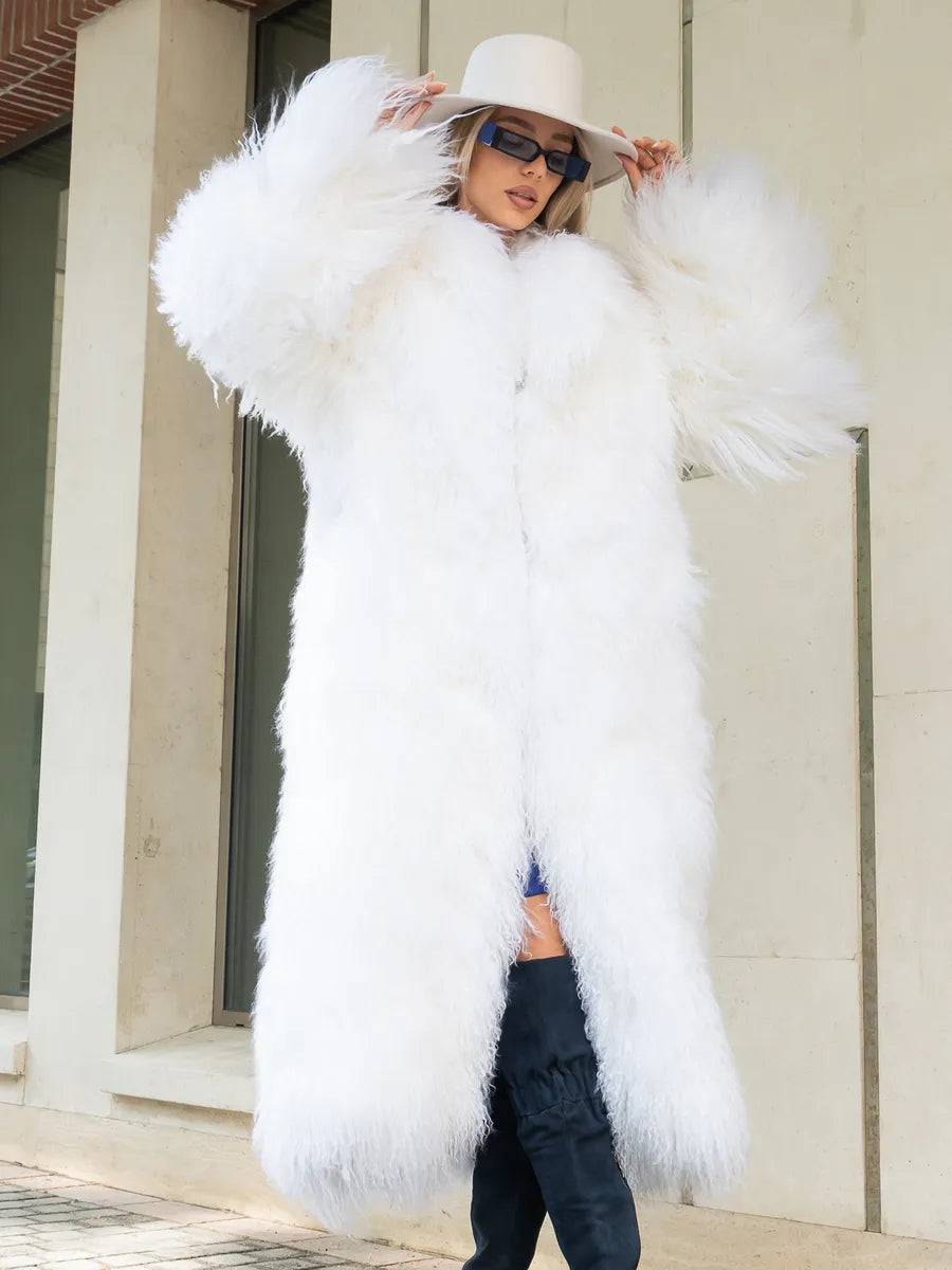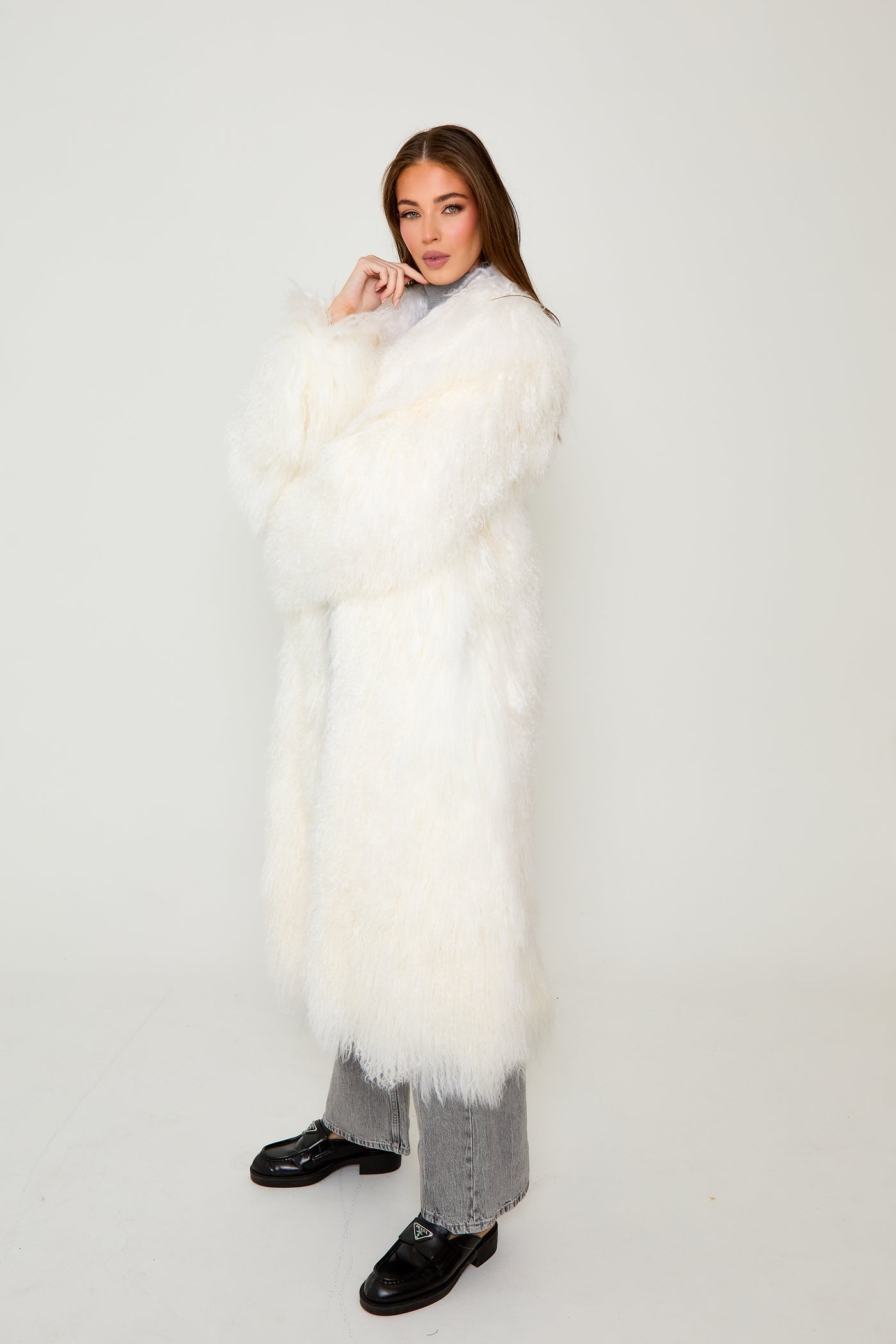 Isabella incarne le luxe moderne : un manteau spectaculaire qui captive tous les regards par son volume imposant et la texture raffinée de sa fourrure de mouton mongol naturelle. Avec sa coupe allongée et son large col anglais, cette pièce sublime toute tenue et lui confère une élégance absolue.