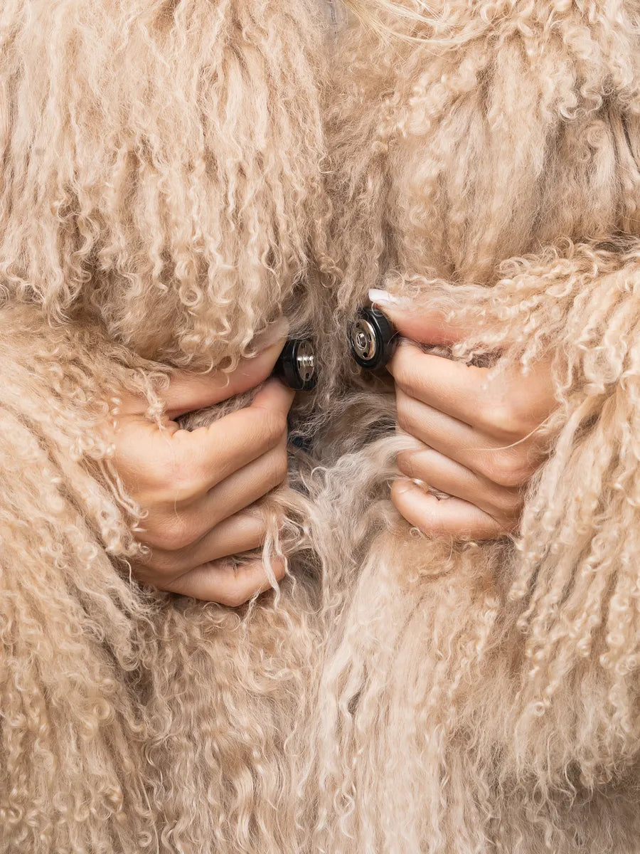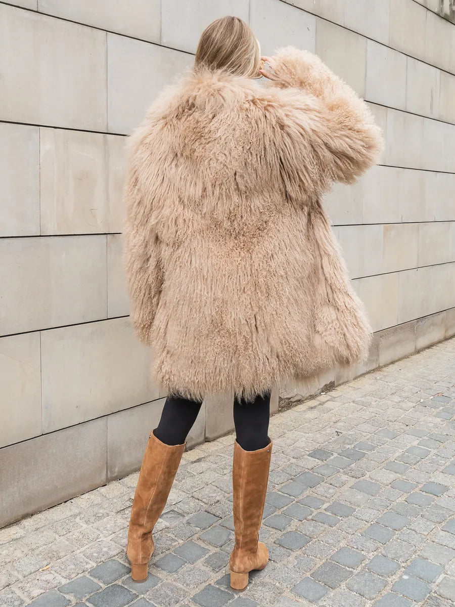 Elena est un manteau élégant et polyvalent, créé pour les femmes qui apprécient le raffinement discret et le confort absolu. Confectionné en fourrure naturelle de mouton mongol, il se distingue par sa texture douce, dense et bouclée, dans une teinte beige caramel chaleureuse qui respire le naturel et l'élégance.