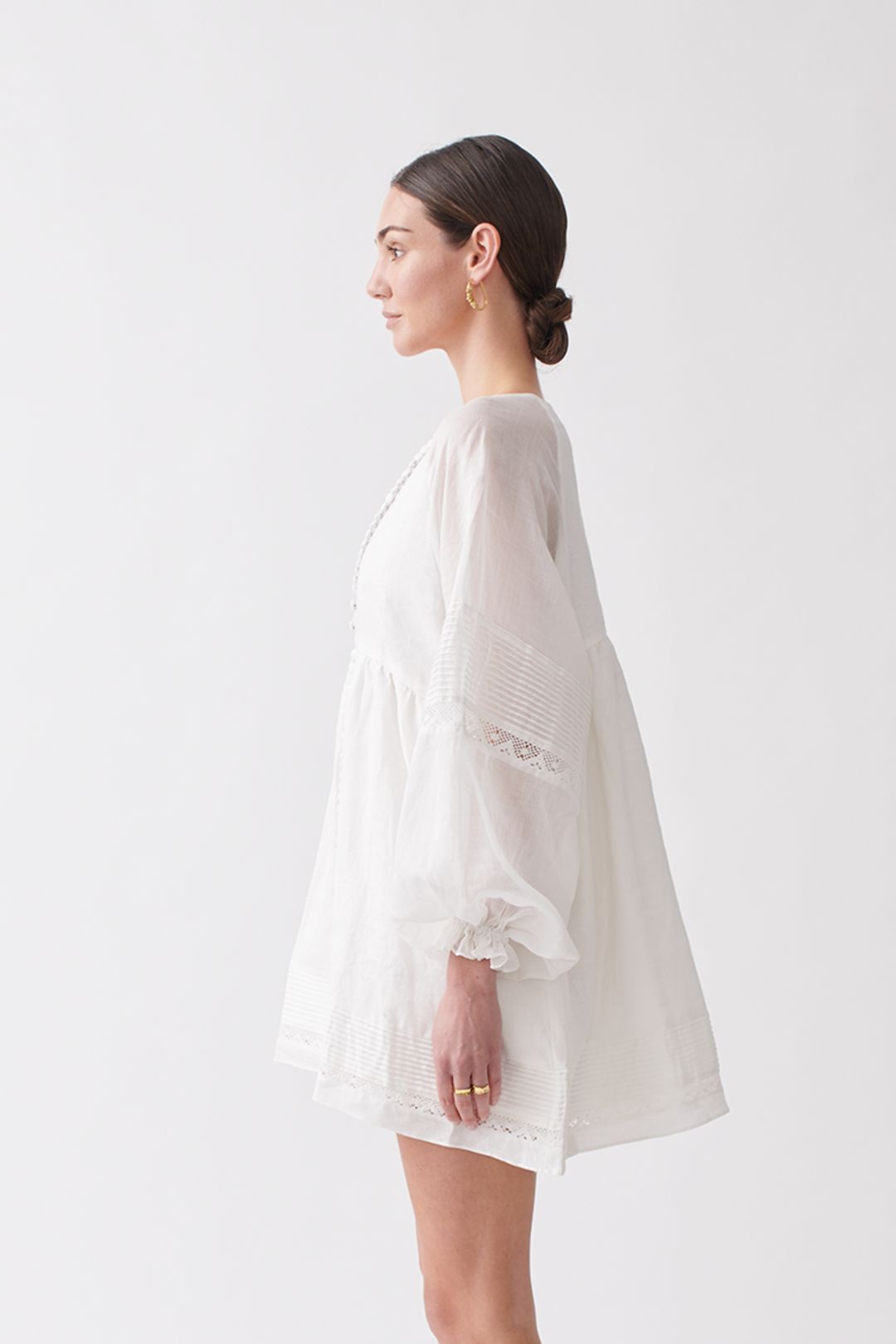 Robe d'été courte et légère, confectionnée dans une matière légère et aérée, de couleur blanche.