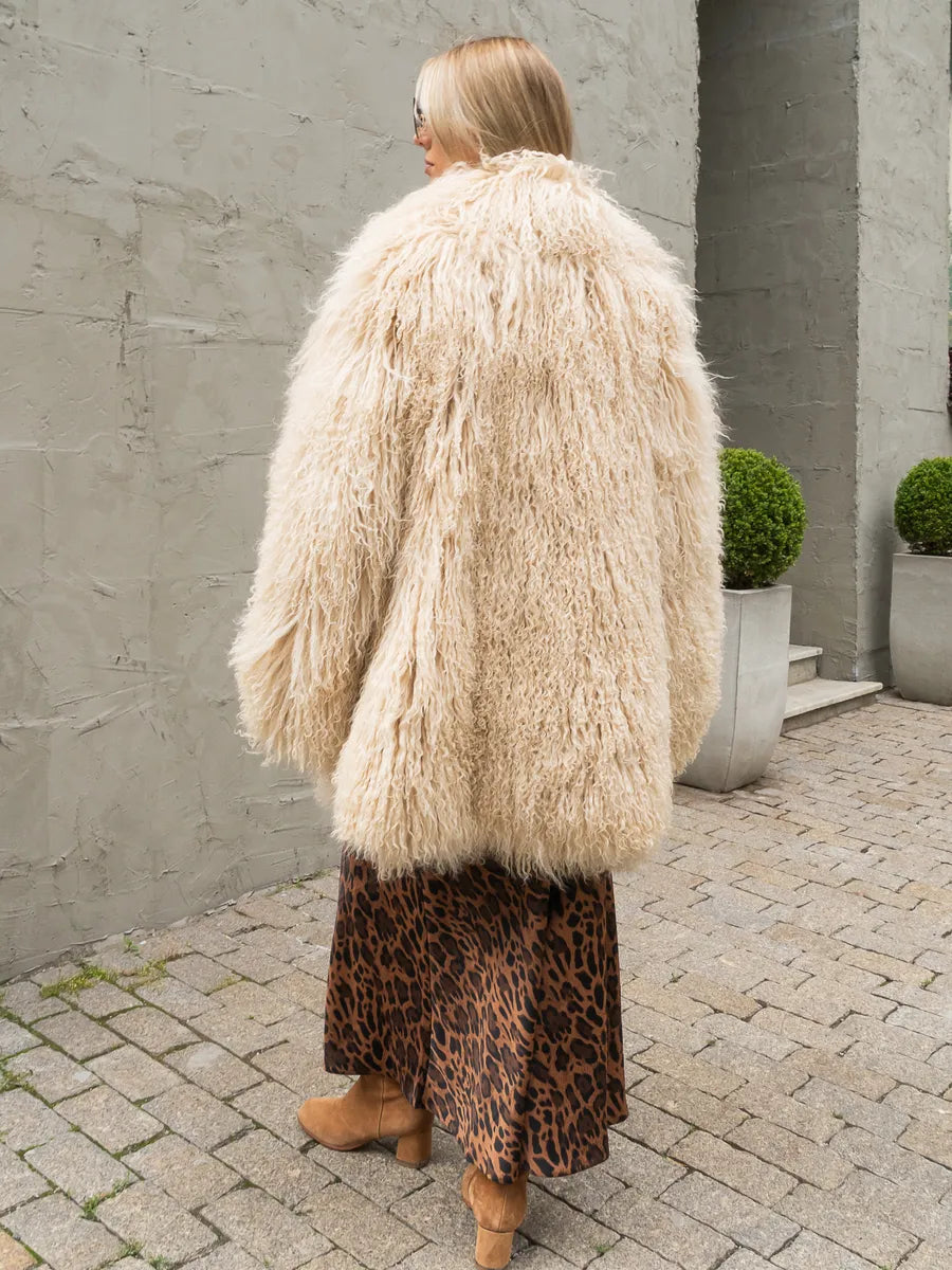 Elora est une pièce forte, dédiée aux femmes qui apprécient le luxe authentique et l'élégance naturelle. Confectionné en peau de mouton mongole naturelle, ce long manteau séduit par sa texture riche et volumineuse et sa teinte beige naturelle chaleureuse. Avec sa coupe fluide et son large col anglais, Elora est le choix idéal pour un look spectaculaire, sophistiqué et moderne.