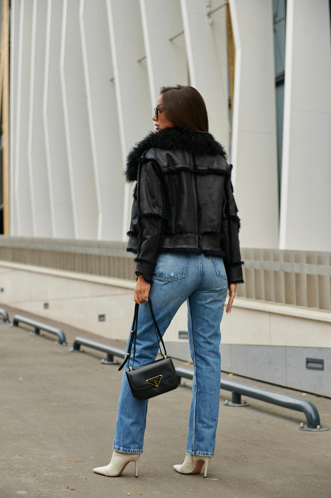 Sa coupe, inspirée des modèles aviateur classiques, se marie à merveille avec des détails contemporains : fermeture éclair métallique apparente, large col en fourrure et finitions en peau lainée naturelle. Un modèle polyvalent, idéal pour les tenues urbaines, avec un jean ample ou un pantalon en cuir.