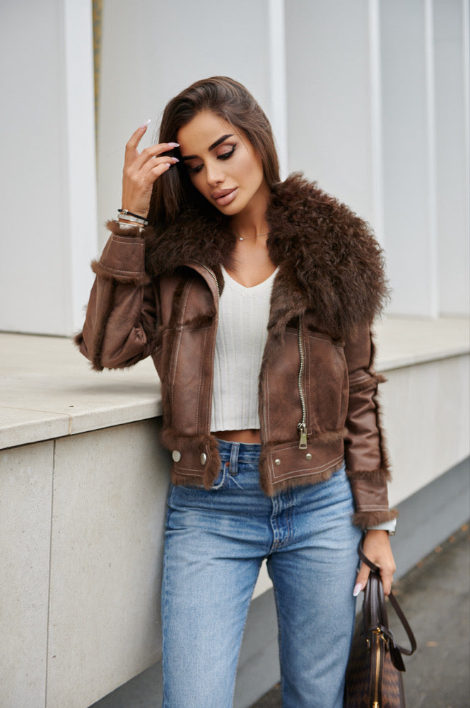Veste statement en cuir véritable doublée de peau lainée, revisitée dans une coupe moderne et légèrement oversize. Ses tons bruns chauds lui confèrent une allure raffinée et intemporelle, tandis que sa texture douce apporte confort et style supplémentaires.