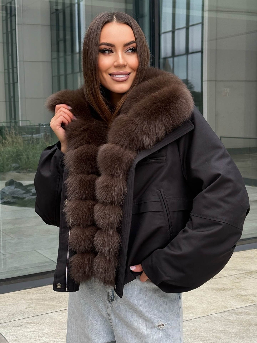 Croiala scurtă, lejeră și ușor oversized conferă un aer contemporan, fiind ușor de integrat atât în ținutele casual, cât și în cele stylish de oraș. Materialul exterior protejează excelent împotriva vântului și temperaturilor scăzute, iar blana naturală completează perfect aspectul luxuriant al jachetei.