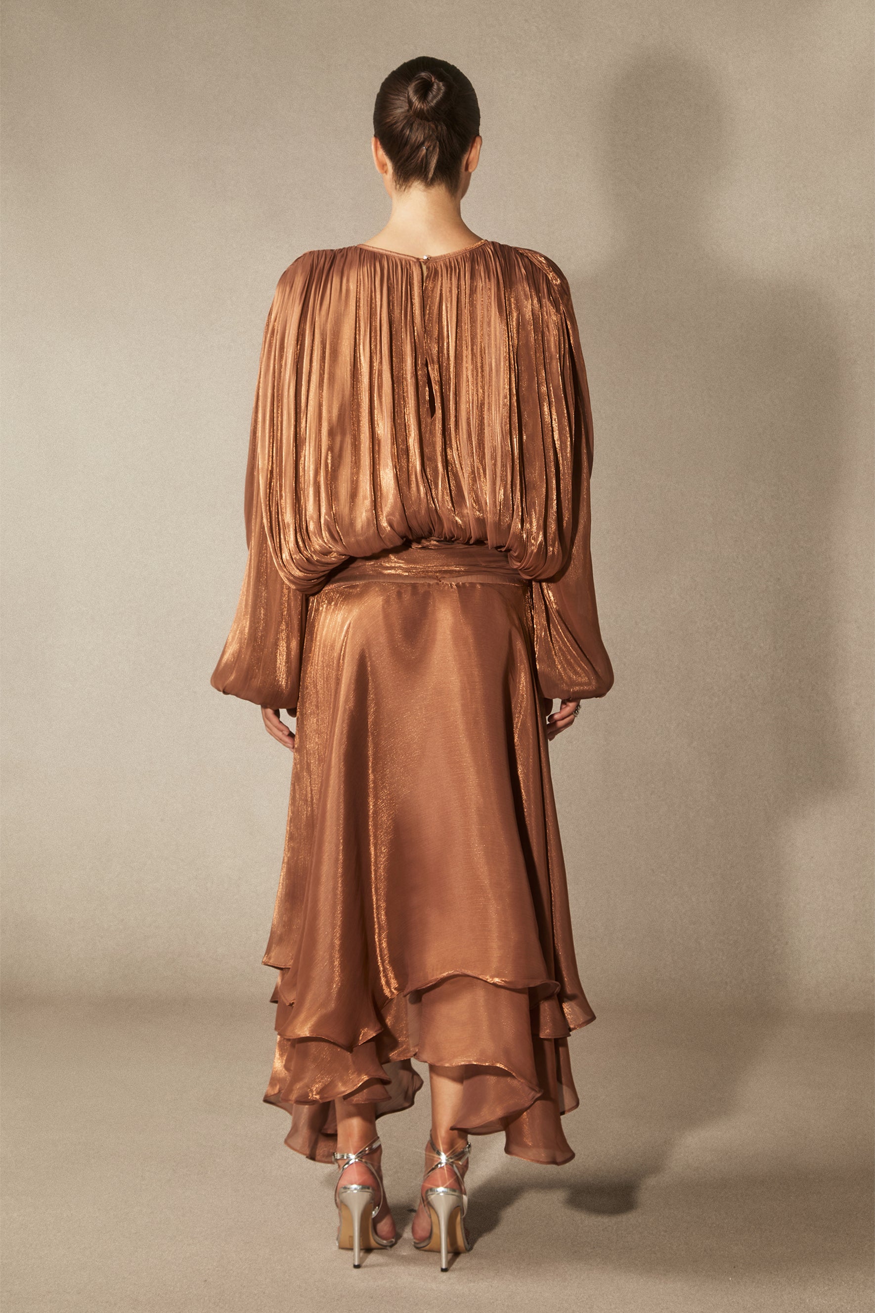 Rochia Alma este o piesă elegantă și sofisticată, realizată dintr-un material fluid, cu un luciu satinat într-o nuanță de bronz metalic. Designul său are un aer luxos și rafinat, perfect pentru evenimente de seară sau ocazii speciale.