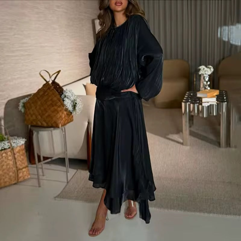 • Material: Satin metalic, cu o textură moale și cădere elegantă.