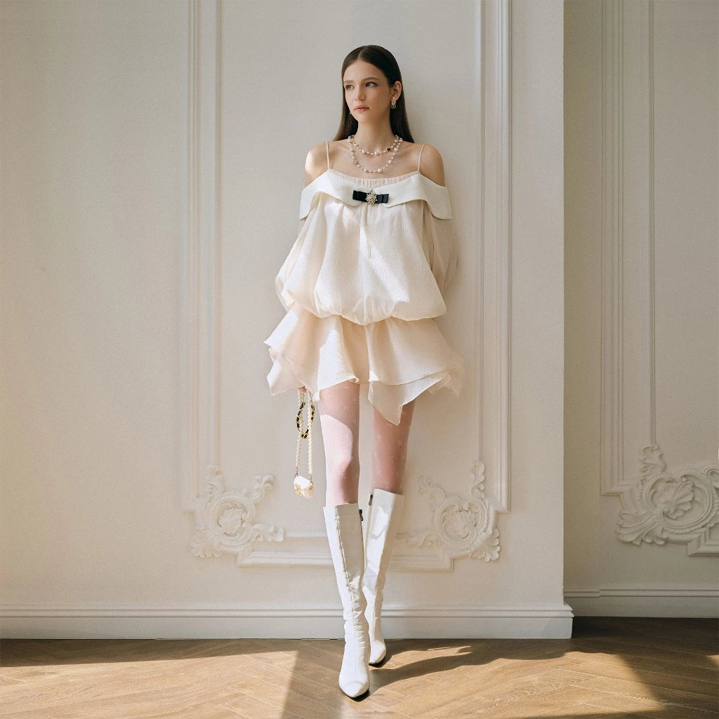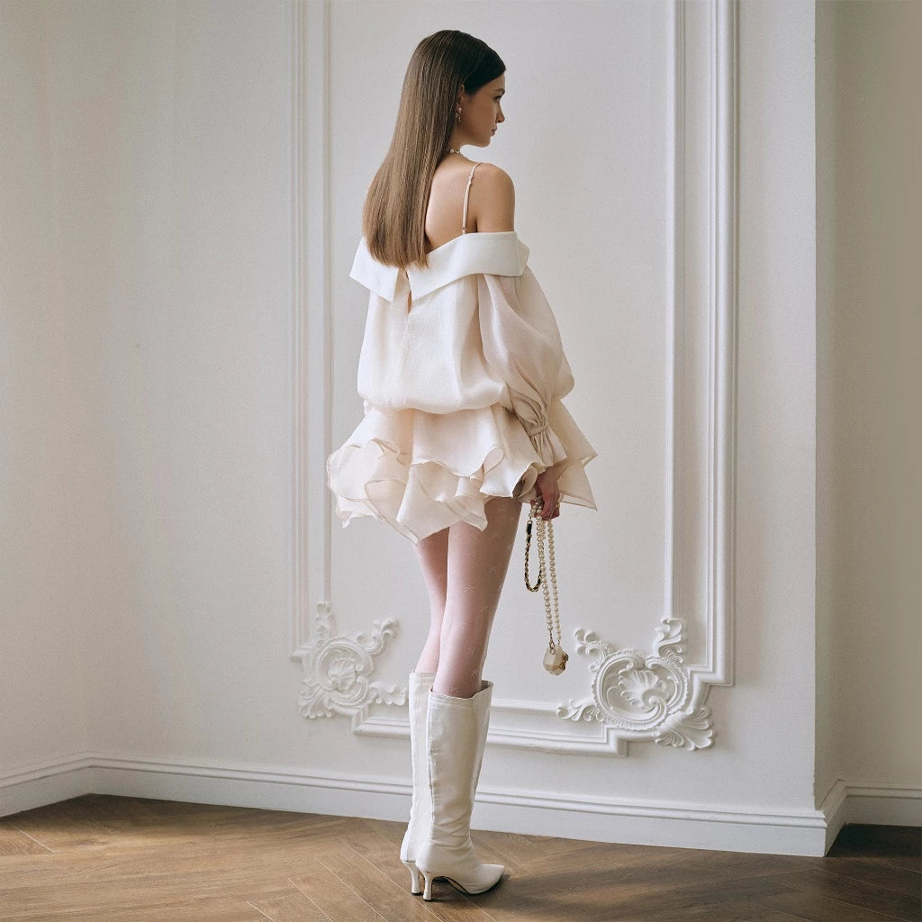 Completează lookul cu cizme albe lungi și accesorii perlate pentru o apariție inspirată de moda pariziană. Perfectă pentru brunchuri elegante, petreceri de zi sau apariții dreamy pe Instagram.