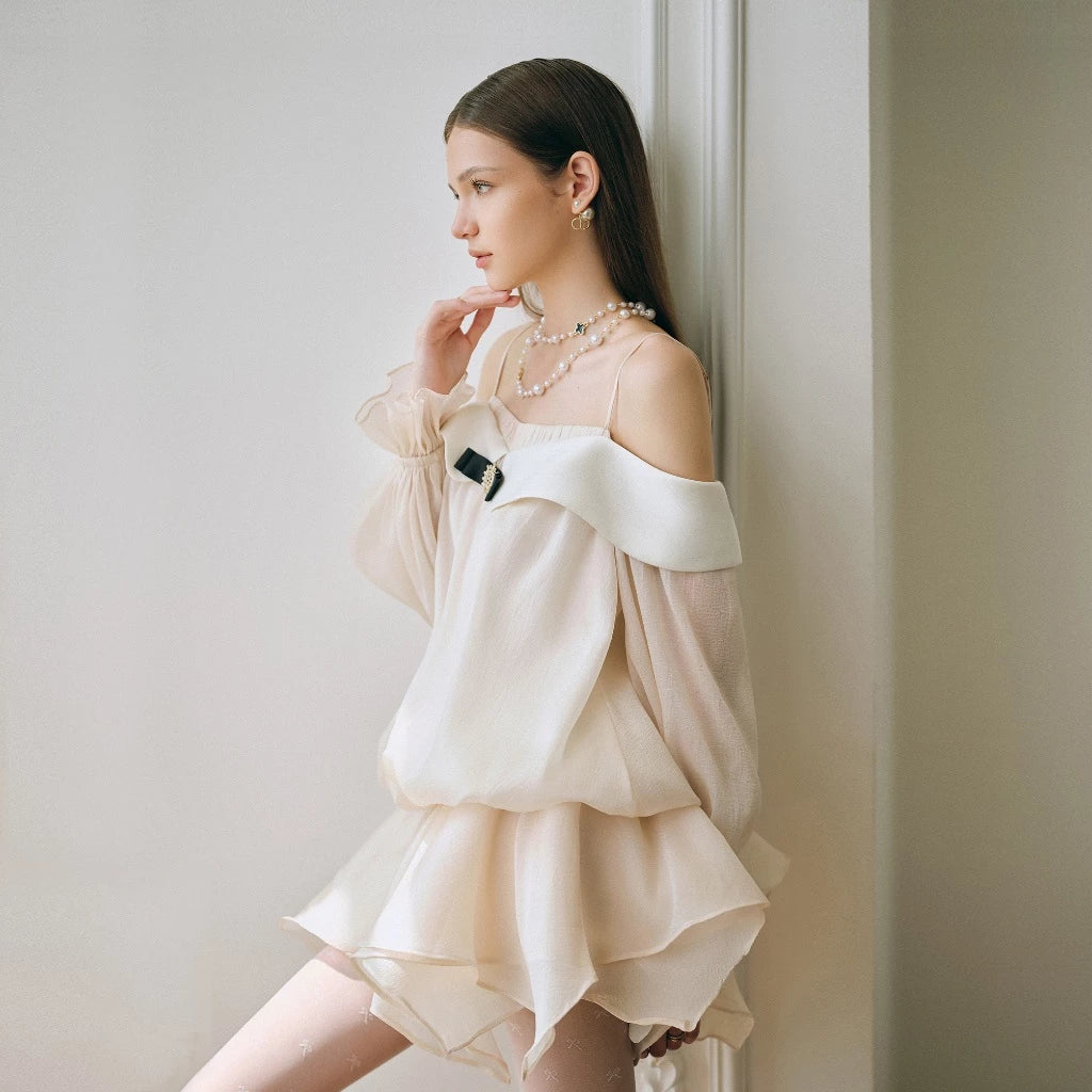 Această rochie mini într-un stil baby-doll este un vis couture devenit realitate – diafană, lejeră și fermecător de feminină. Construită dintr-un voal ușor cu o cădere fluidă, rochia are o croială voluminoasă în partea de sus, accentuată de fusta dublă în straturi asimetrice, ce oferă mișcare și delicatețe.
