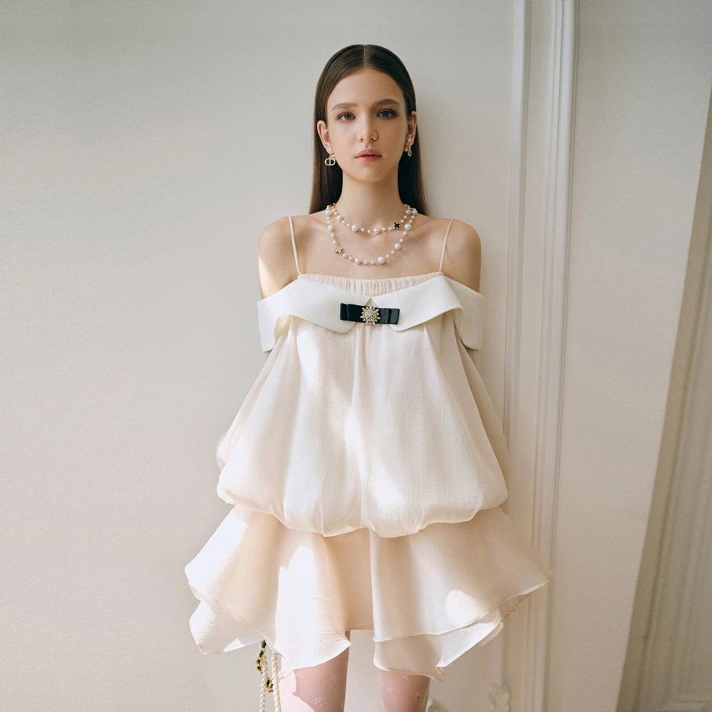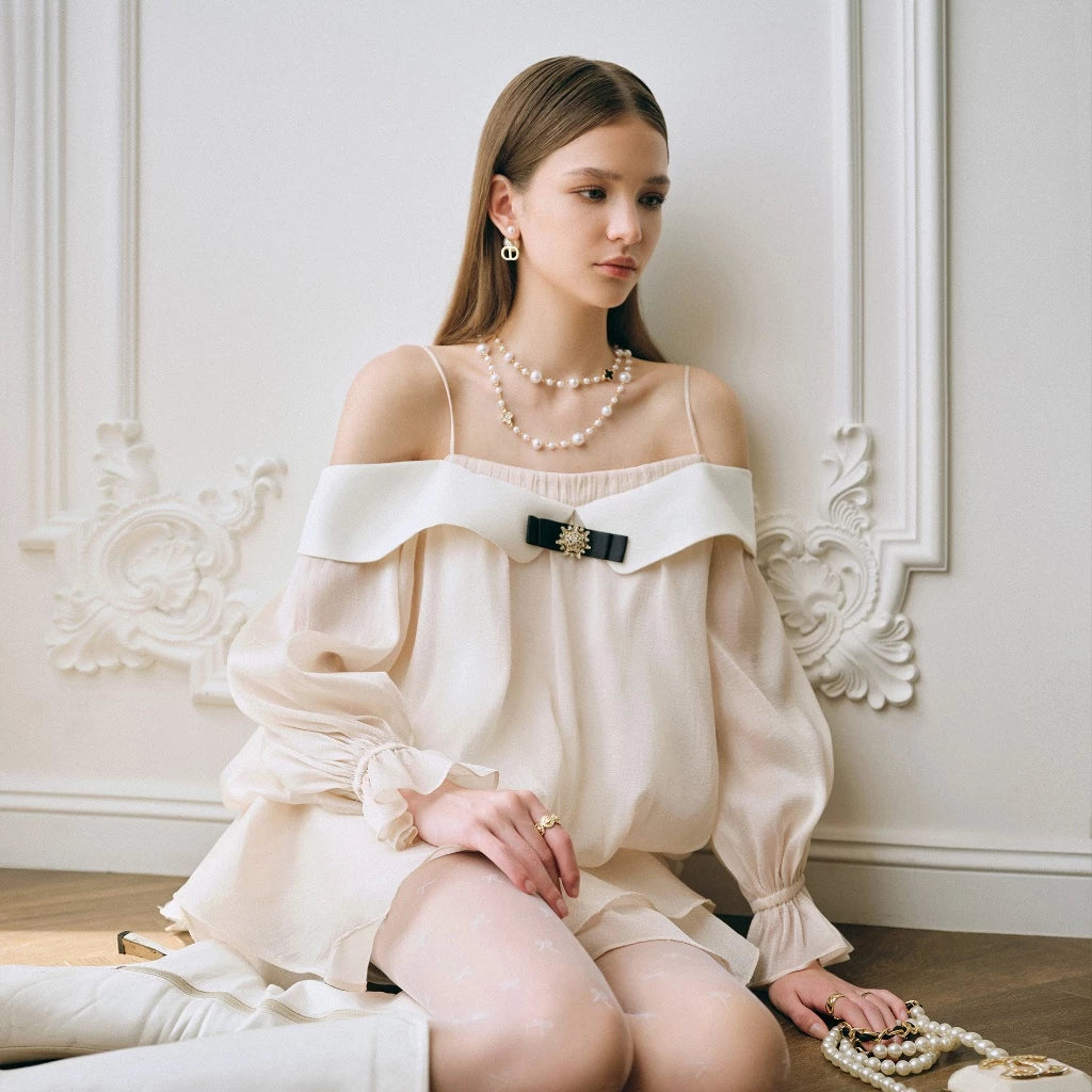 Detaliul deosebit este banda lată pe umeri decorată cu o fundă neagră cu accesoriu bijuterie, care contrastează elegant cu textura delicată a materialului. Bretelele fine și mânecile bufante transparente adaugă o notă sofisticată și poetică.
