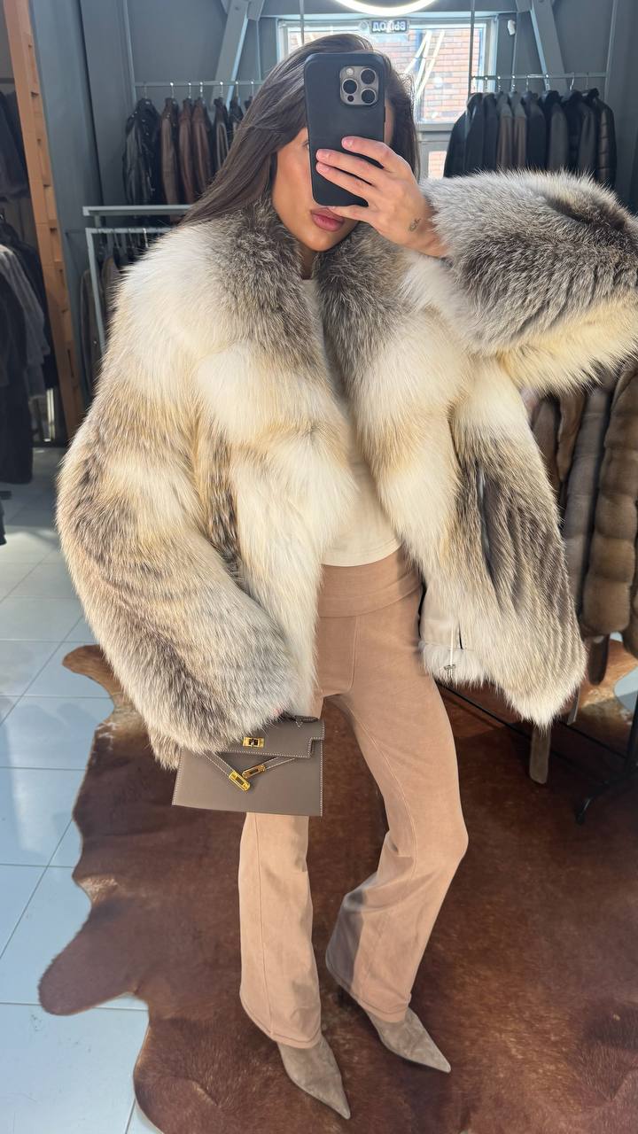 Haina Bridgette este o capodoperă a rafinamentului și eleganței moderne, creată din 100% blană naturală de vulpe canadiană. Piesa impresionează prin nuanțele sale naturale de gri-argintiu și bej auriu, care oferă un efect luxos și sofisticat.