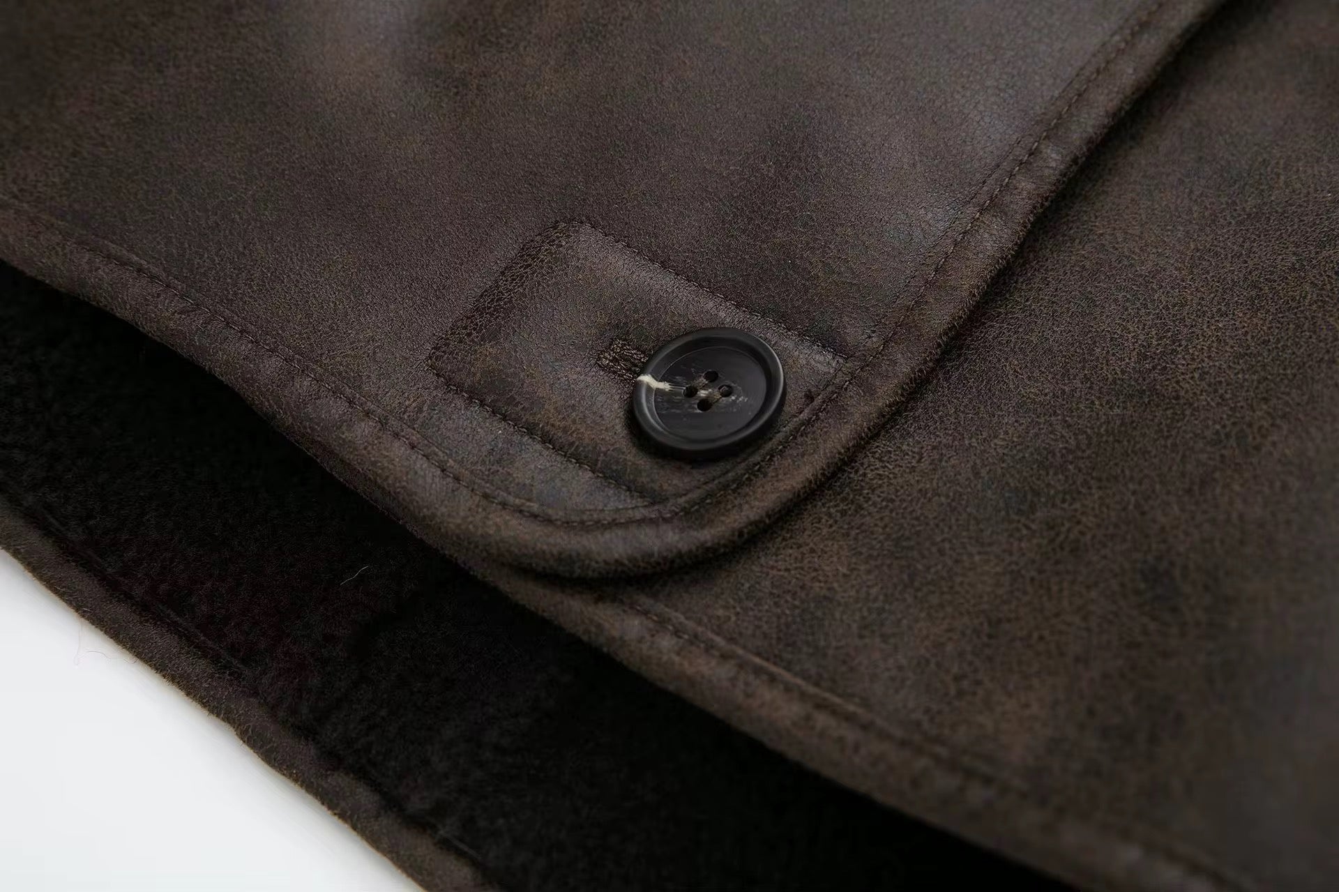 Inspirată de stilul aviator clasic, această jachetă oversized tip shearling combină funcționalitatea cu estetica modernă. Exteriorul din piele maro vintage este completat de o căptușeală teddy moale și călduroasă, ceea ce o face perfectă pentru zilele reci de iarnă.