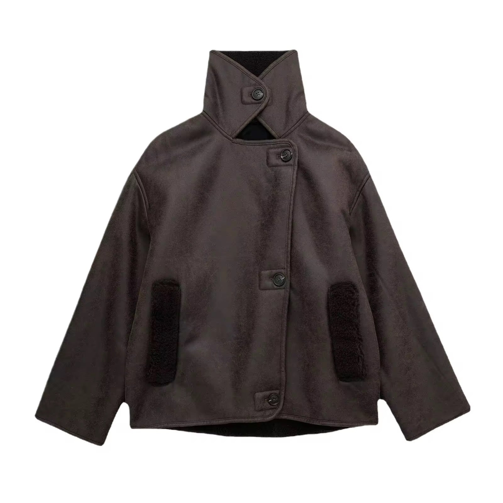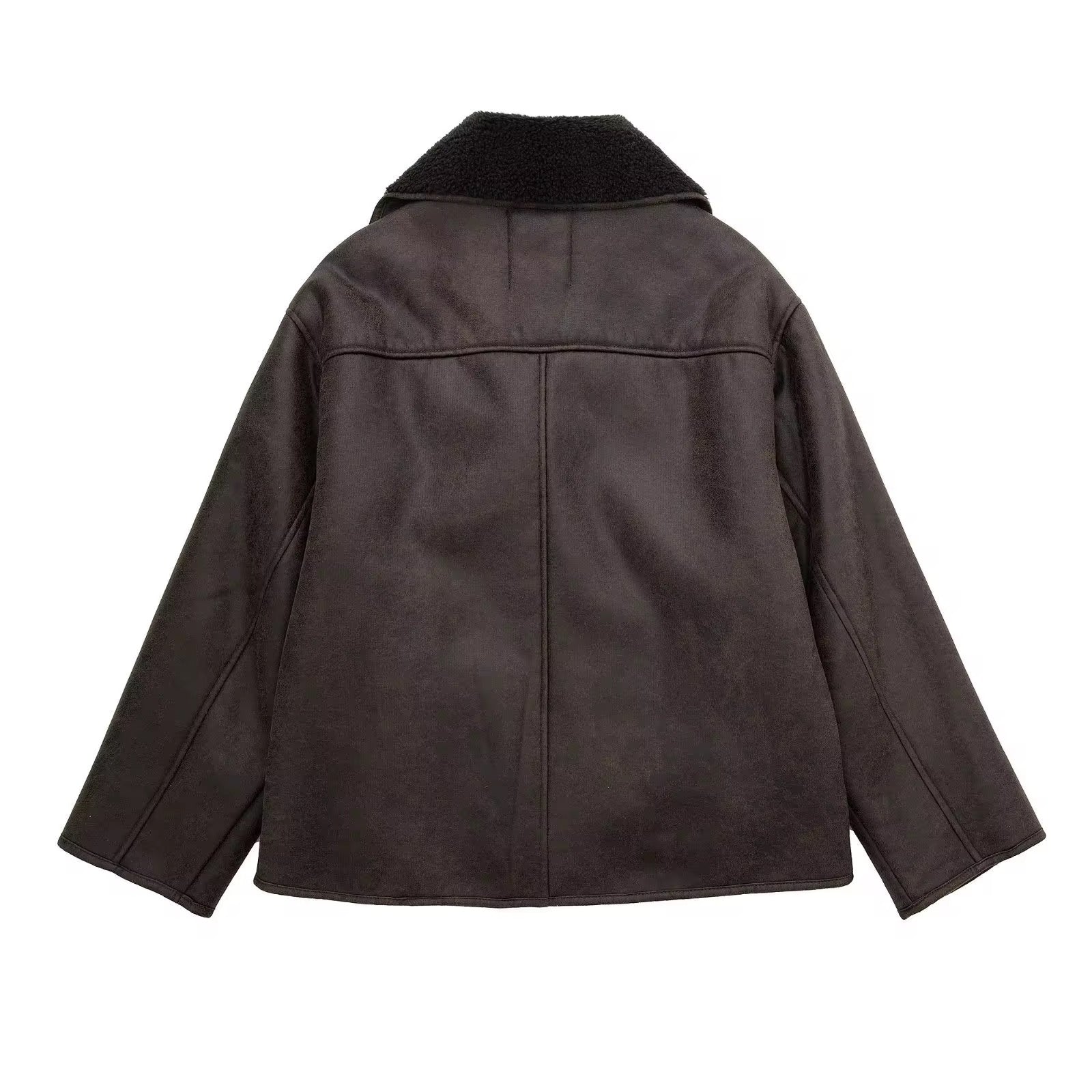 Jachetă oversized shearling din piele ecologica maro, cu interior călduros tip teddy și croială modernă.