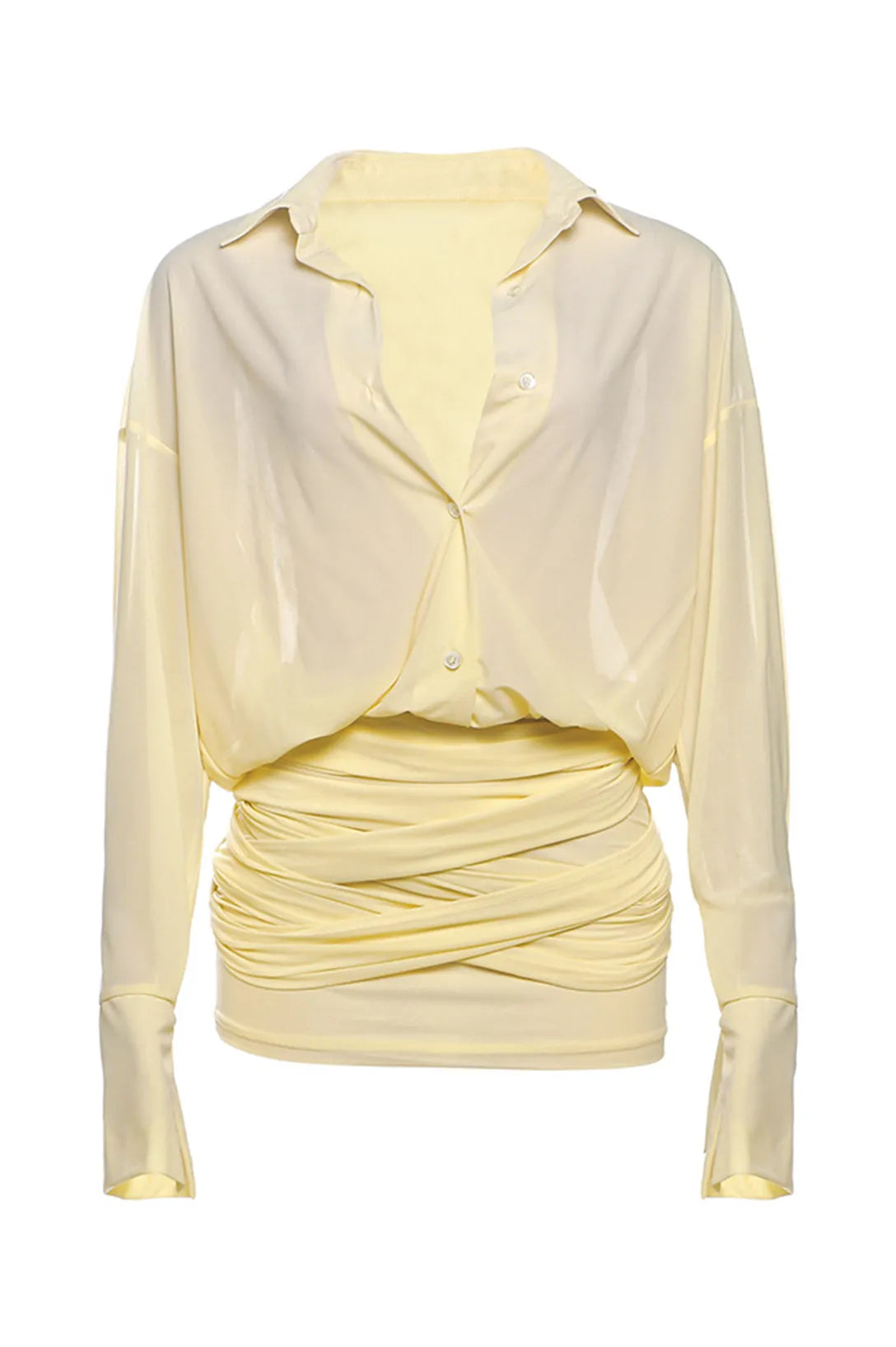 Transformă-ți apariția într-una memorabilă cu acest set modern în nuanță de galben pal, ideal pentru serile de vară sau evenimentele speciale. Setul este compus dintr-o cămașă vaporoasă, cu o croială oversized și un decolteu adânc, care conferă o notă relaxată, dar seducătoare, și o fustă mini mulată, cu detalii drapate ce evidențiază formele într-un mod elegant.