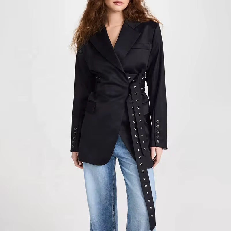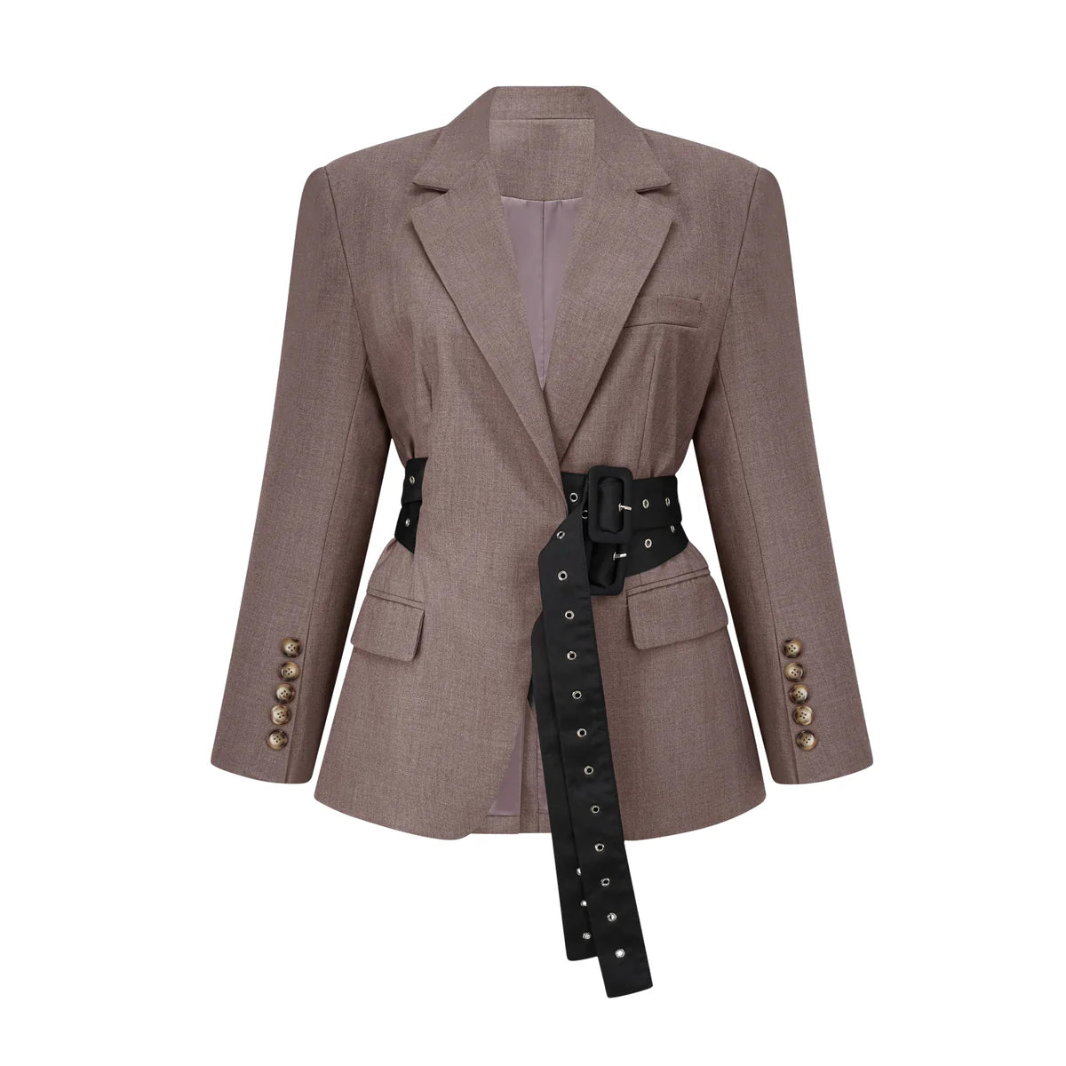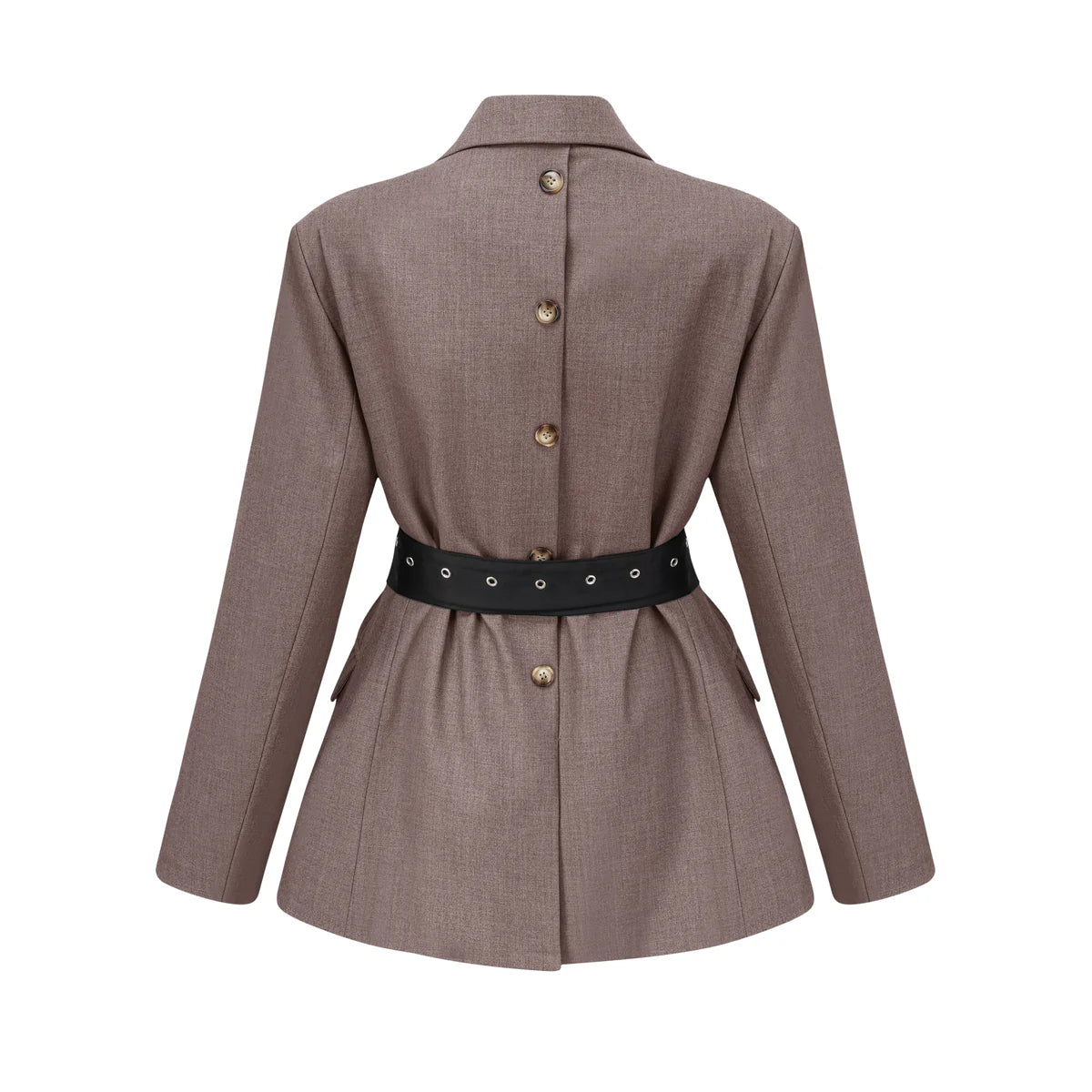 Sacou  oversized cu detalii moderne: centură neagră cu cataramă și capse metalice, umeri structurați și nasturi aurii pe mâneci.Acest sacou  oversized este reinterpretarea modernă a unui clasic. Croiala lejeră este accentuată de o centură neagră reglabilă cu cataramă și capse metalice, care marchează talia și creează o siluetă sofisticată.