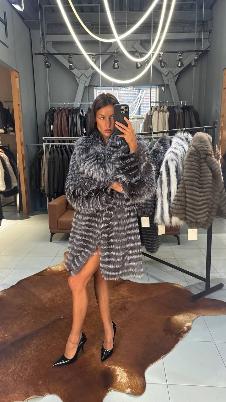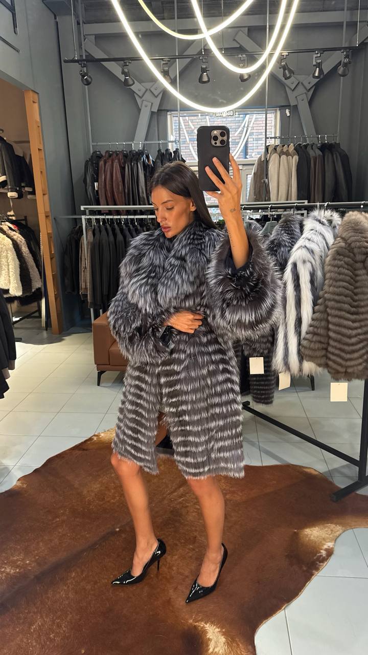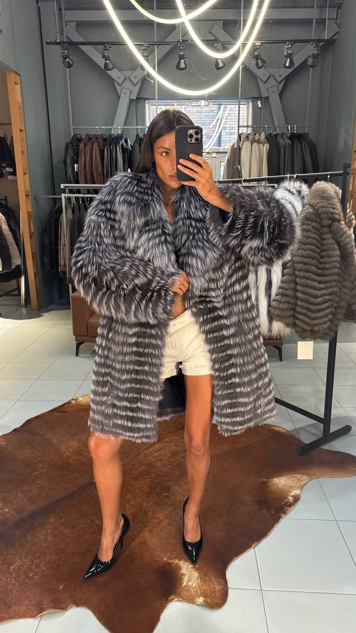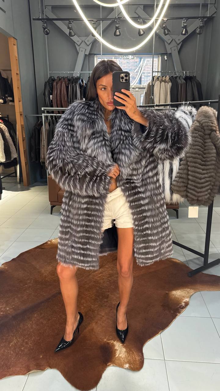 Haina Ella este o declarație de eleganță pură, destinată femeilor care apreciază luxul autentic și rafinamentul atemporal. Confecționată din 100% blană naturală de jder, această piesă spectaculoasă îmbină două nuanțe contrastante – gri-argintiu și negru intens – pentru un efect vizual sofisticat și modern.