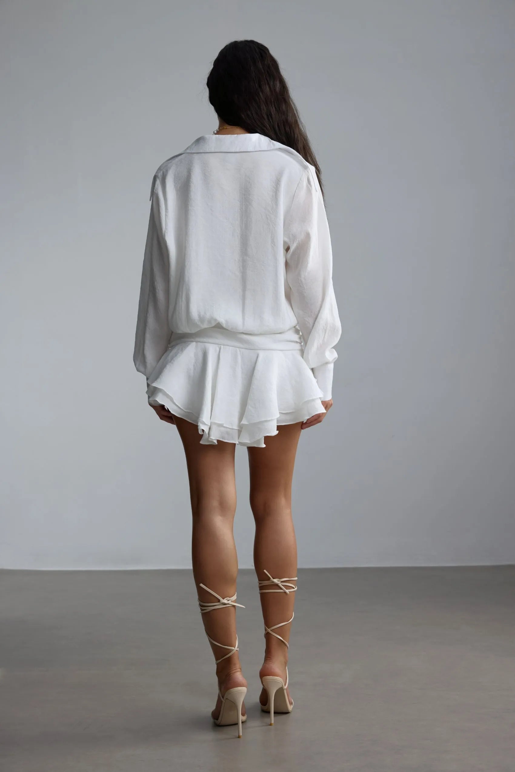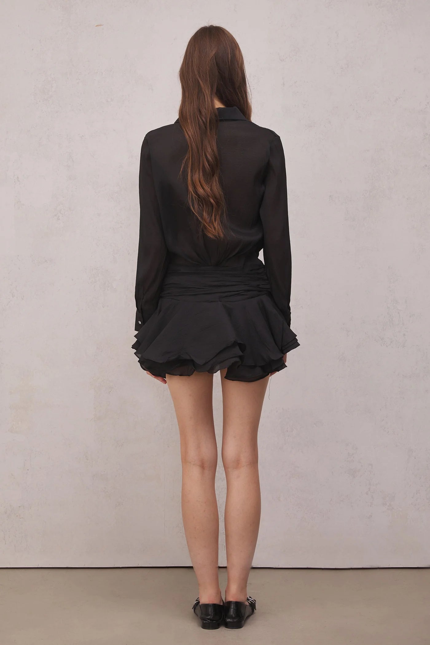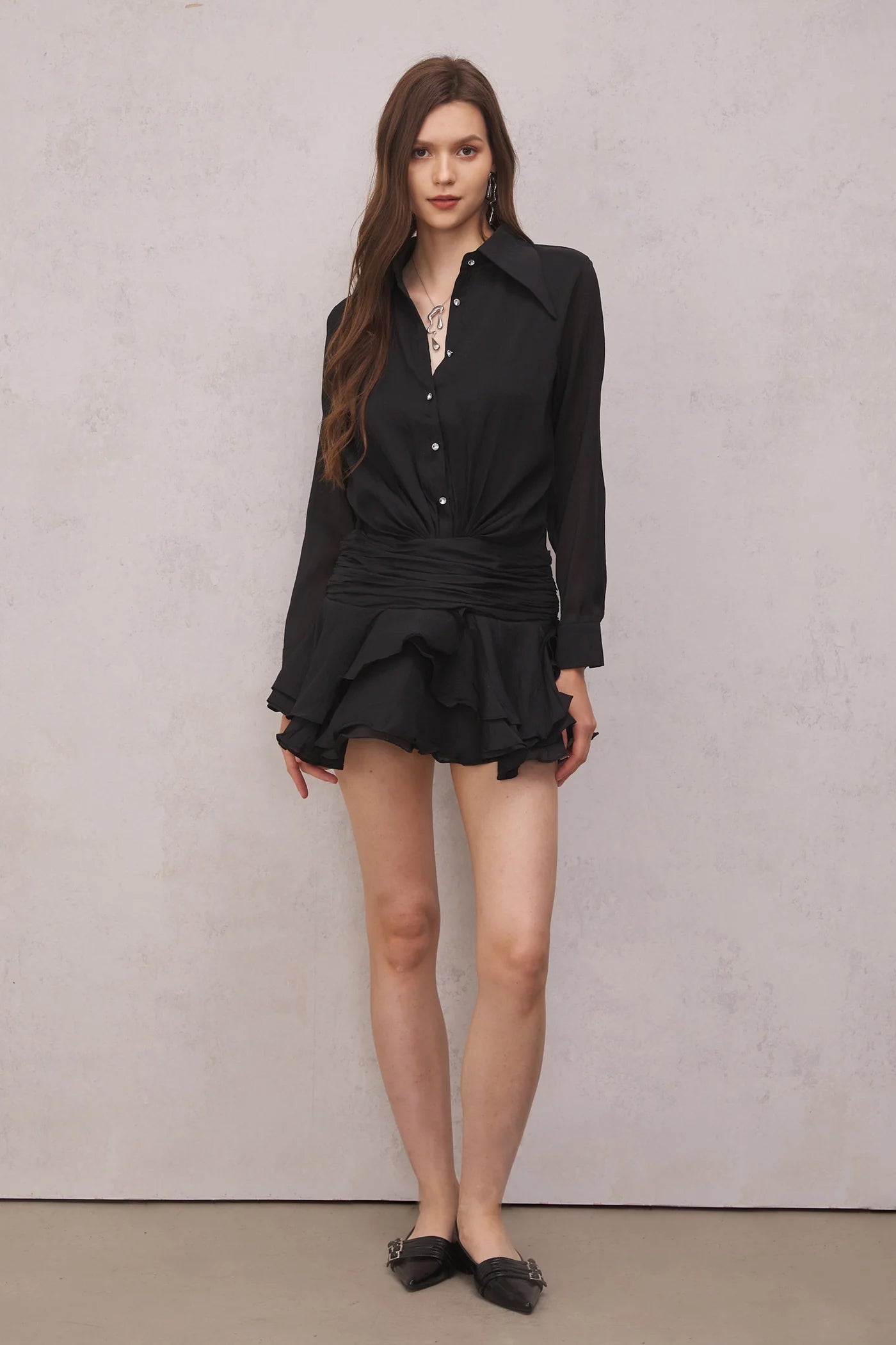 Descoperă o reinterpretare sofisticată a cămășii clasice cu această rochie mini elegantă, disponibilă în variantele negru intens și alb perlat. Cu o croială structurată care pune accent pe talie, închidere frontală cu nasturi și un joc rafinat de drapaje și volane fluide la bază, această piesă aduce echilibrul perfect între eleganță și senzualitate.