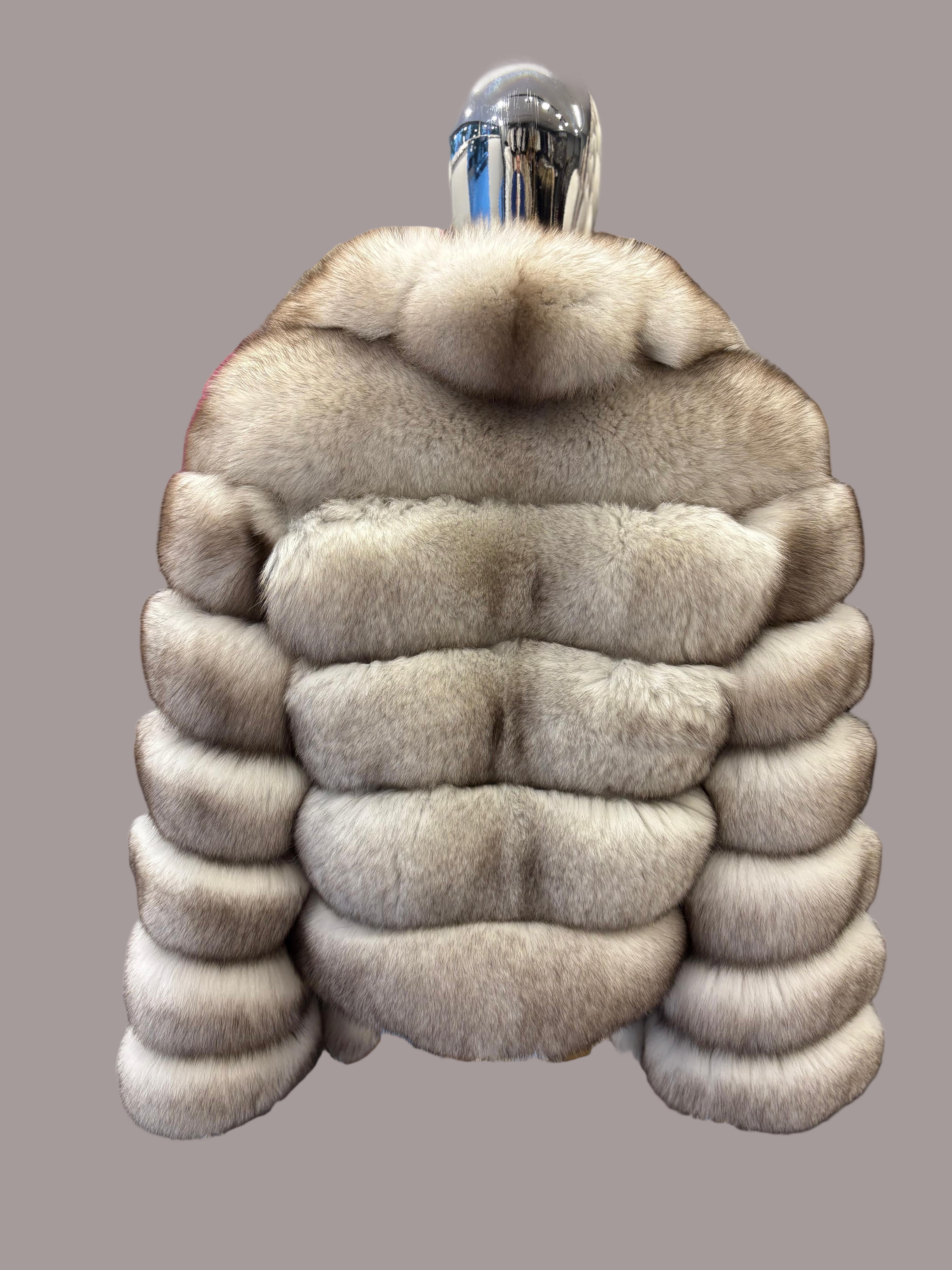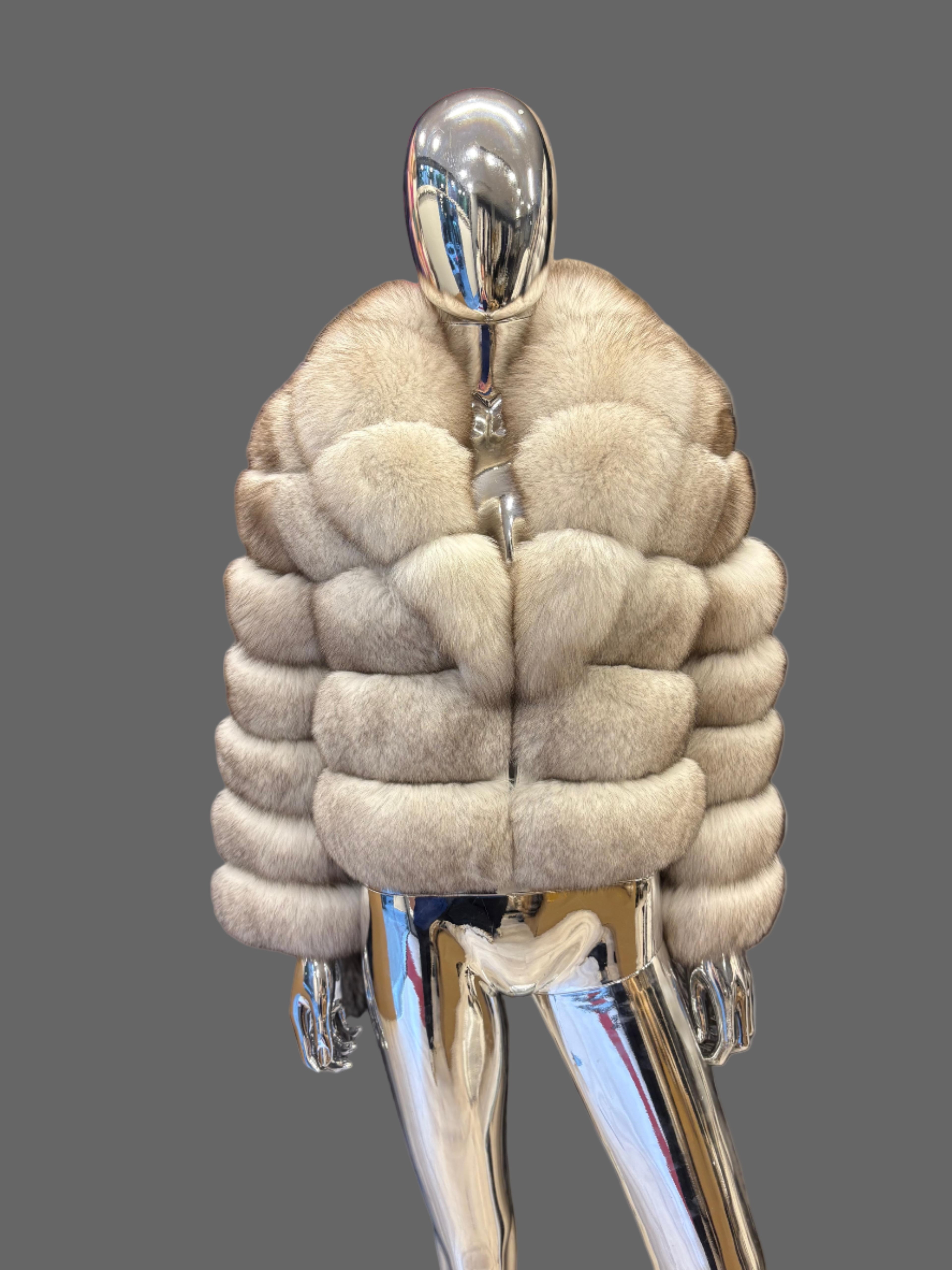 O piesă de lux atemporală, această jachetă din blană naturală de vulpe polară în nuanță ecru impresionează prin rafinamentul discret și croiala sculpturală. Realizată manual din fâșii perfect proporționate, oferă un echilibru între eleganță clasică și modernitate sofisticată.
