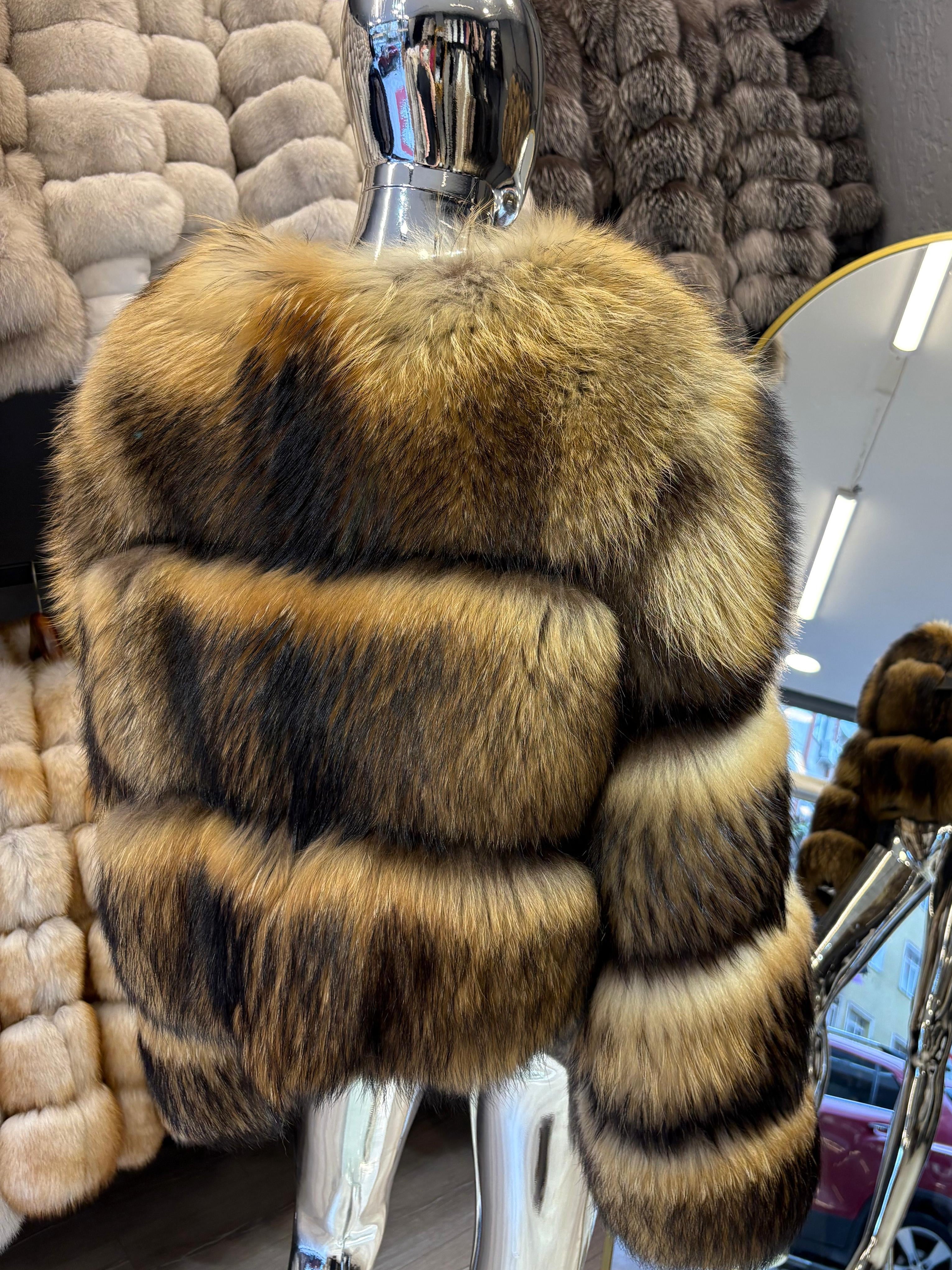 O piesă statement, spectaculoasă prin contrastul natural al culorilor și volumul perfect echilibrat. Această jachetă din blană naturală de vulpe este lucrată manual din blană de cea mai înaltă calitate, cu nuanțe bogate de maro auriu și negru, ce creează un efect vizual luxuriant. Croiala scurtă subliniază talia, oferind o siluetă elegantă și modernă.
