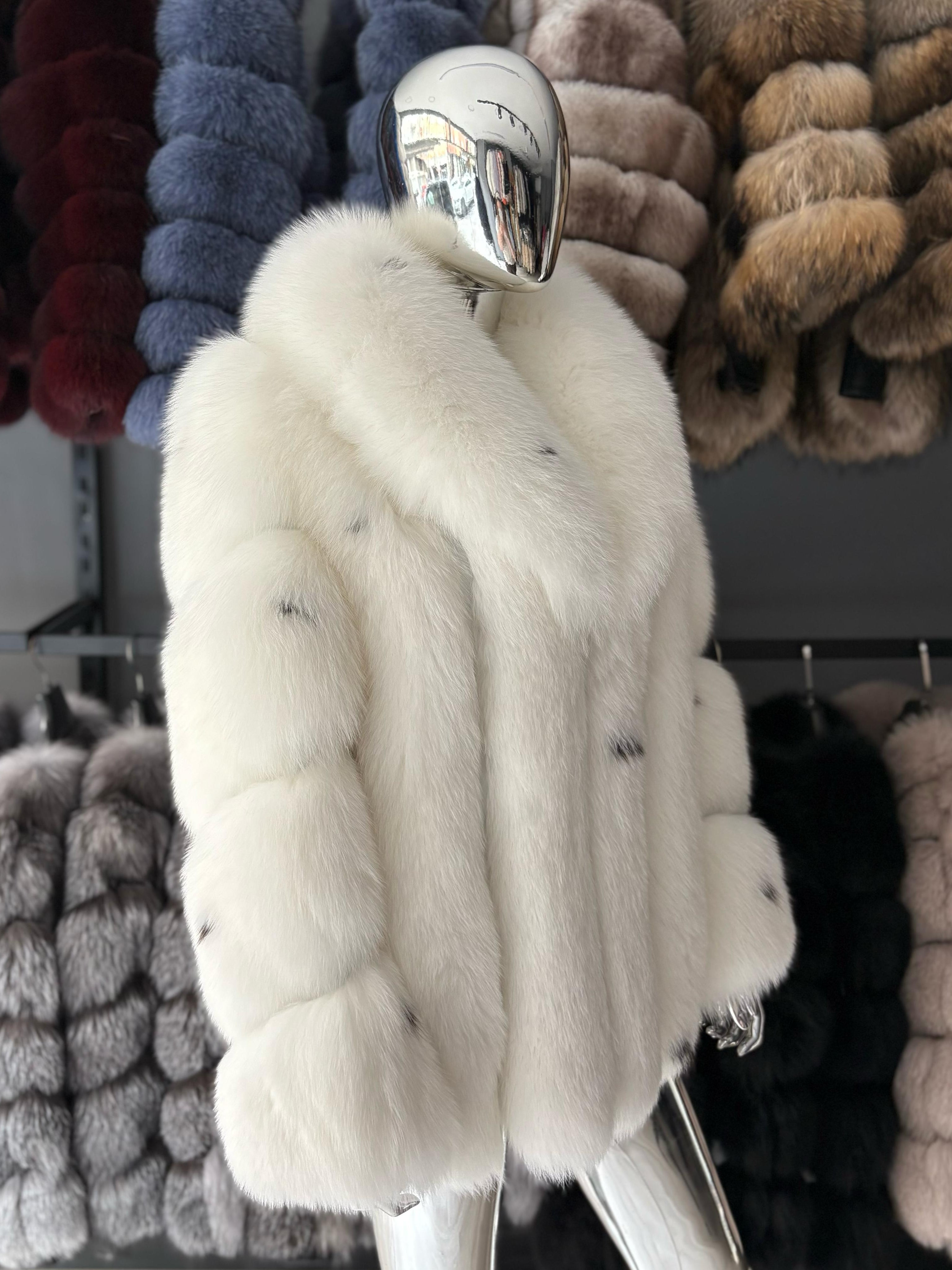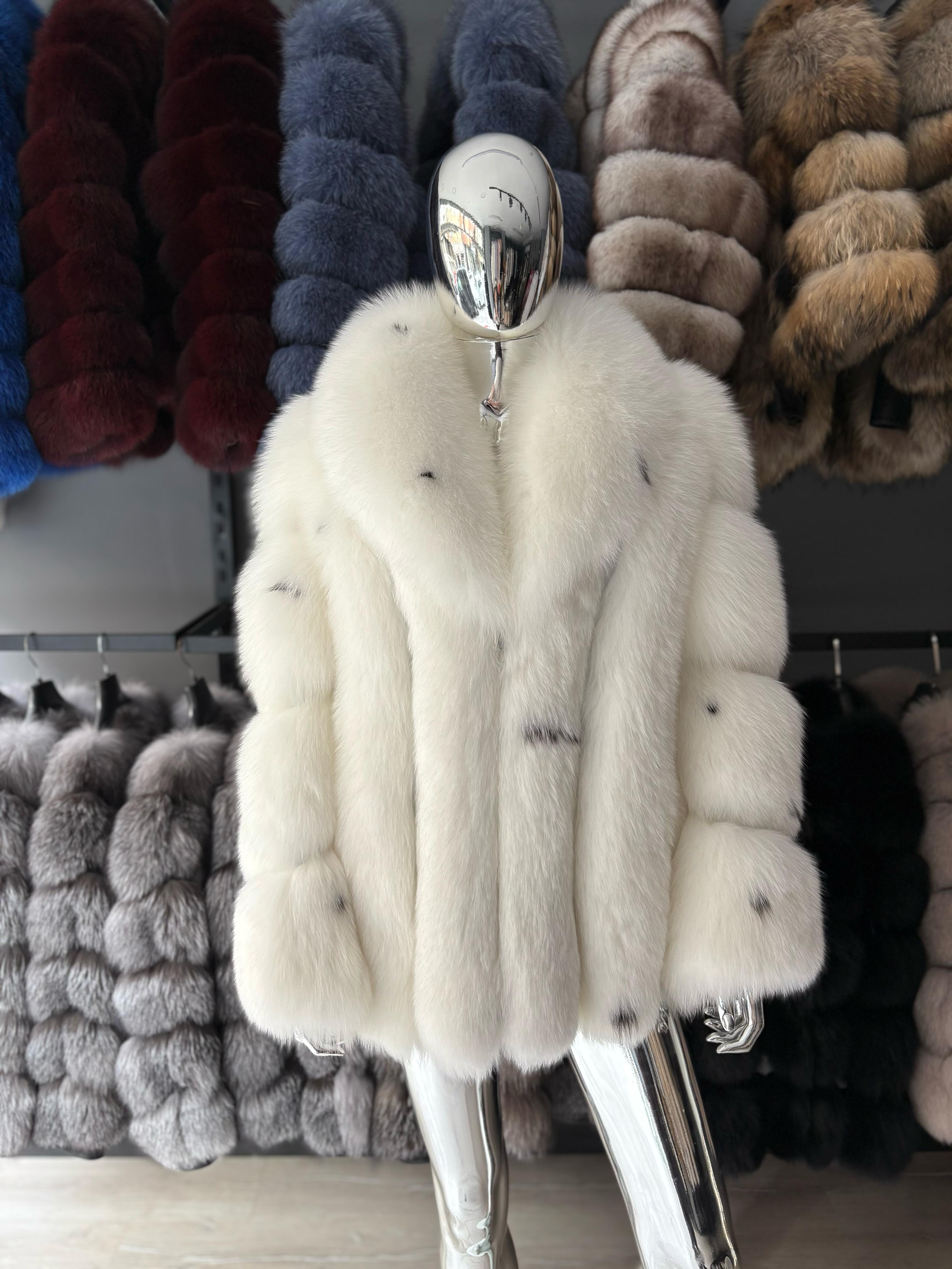 Eleganță, rafinament și lux autentic – toate reunite într-o piesă spectaculoasă, realizată din blană naturală de vulpe polară dispusă în fâșii orizontale. Textura moale și catifelată, completată de nuanța alb-imaculat cu accente naturale discrete, oferă o estetică sofisticată și atemporală.