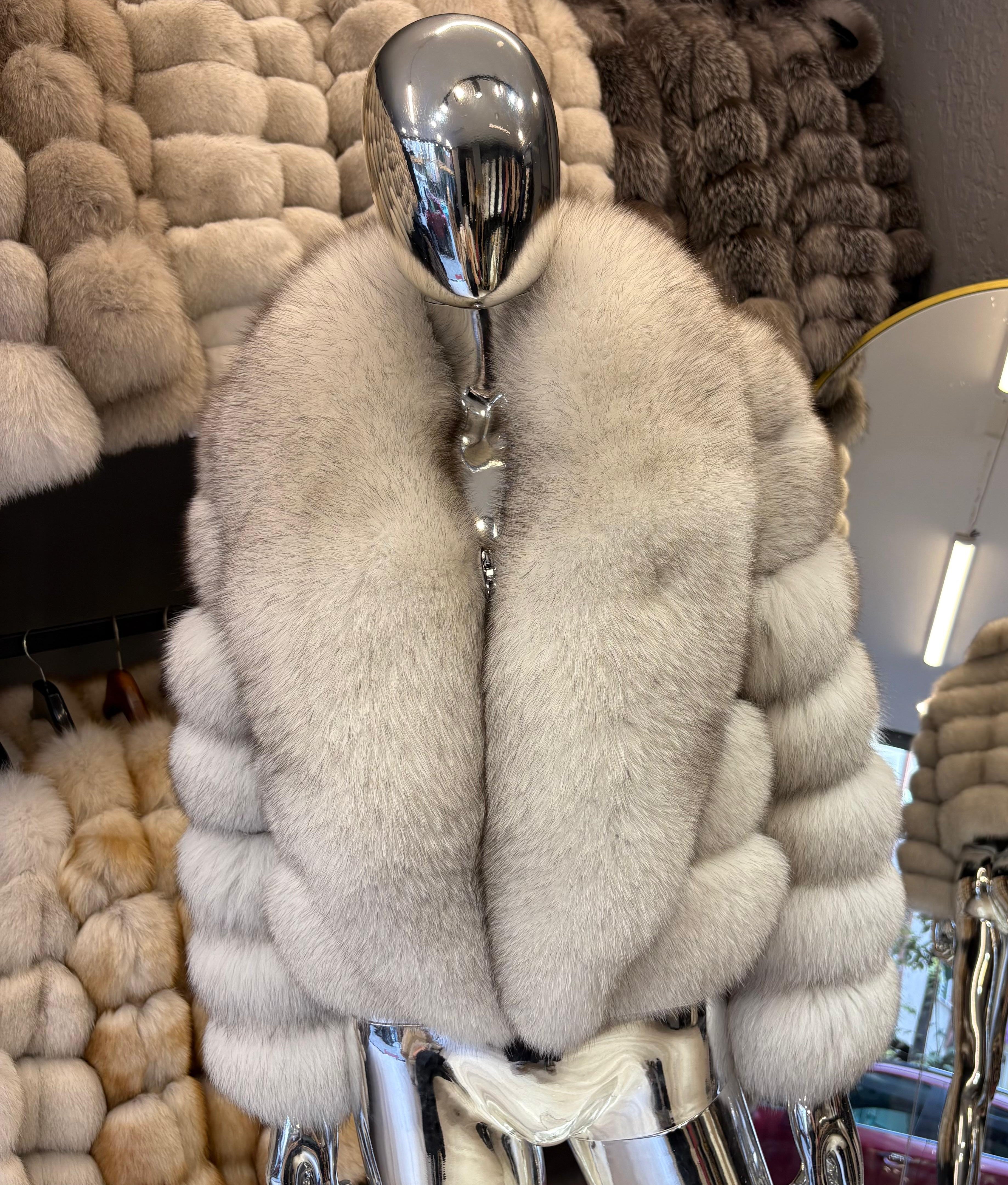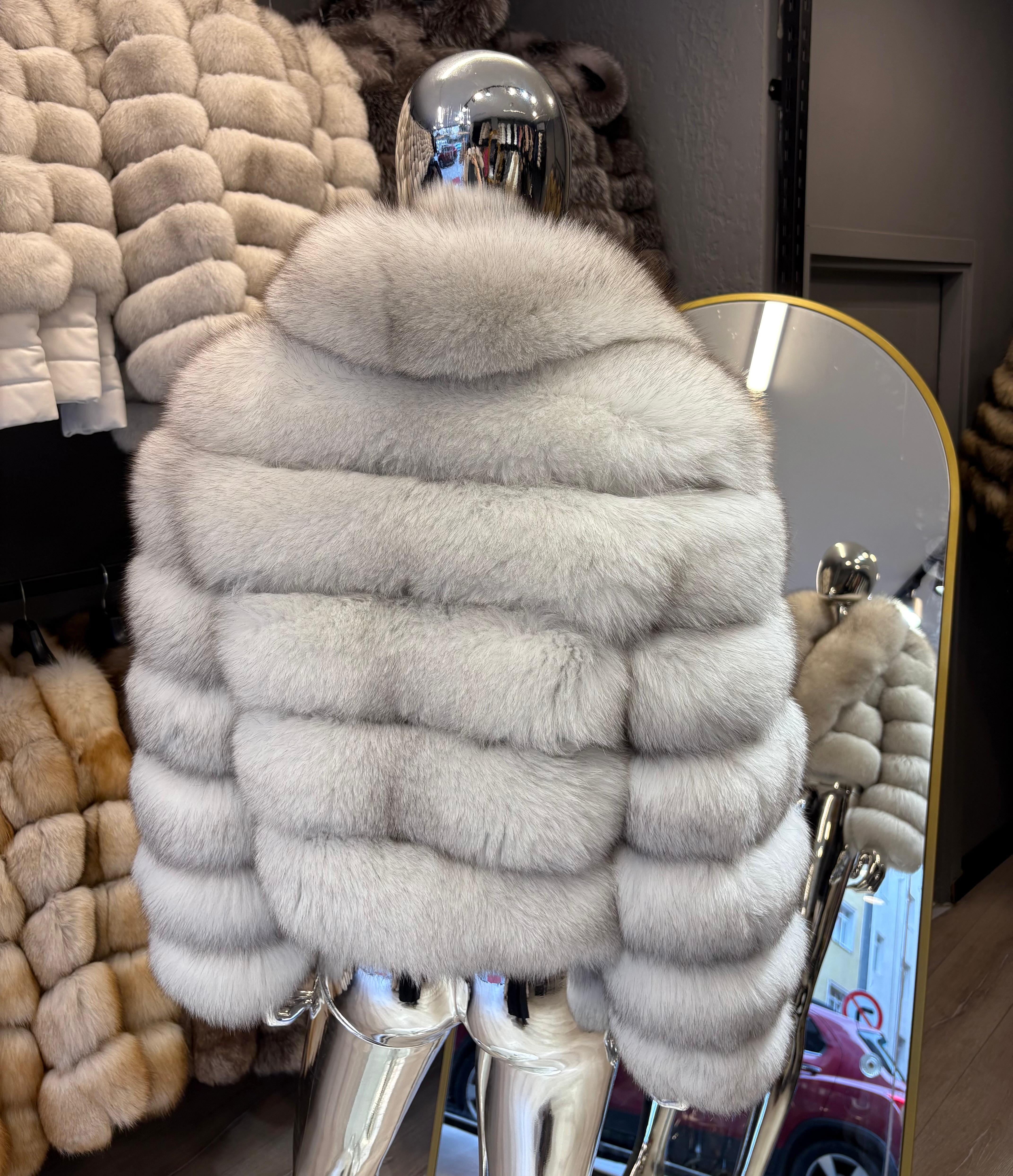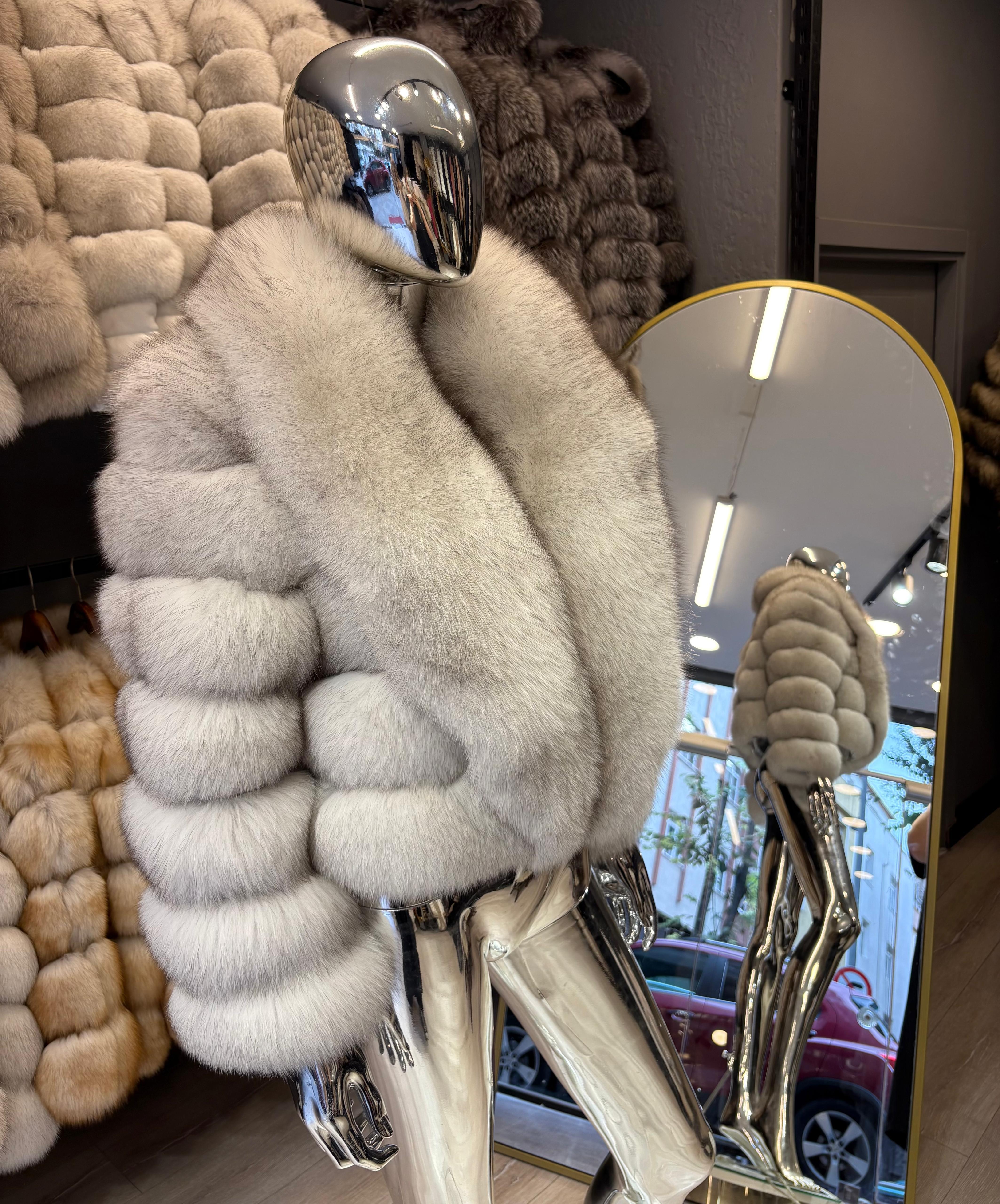 O piesă exclusivistă, creată pentru femeia care apreciază luxul autentic și eleganța atemporală. Această jachetă din blană naturală de vulpe polară impresionează prin volumul spectaculos și textura sa fină, catifelată. Nuanța alb-gri cu reflexii argintii oferă un aer sofisticat și rafinat, perfect pentru ținute elegante de iarnă.