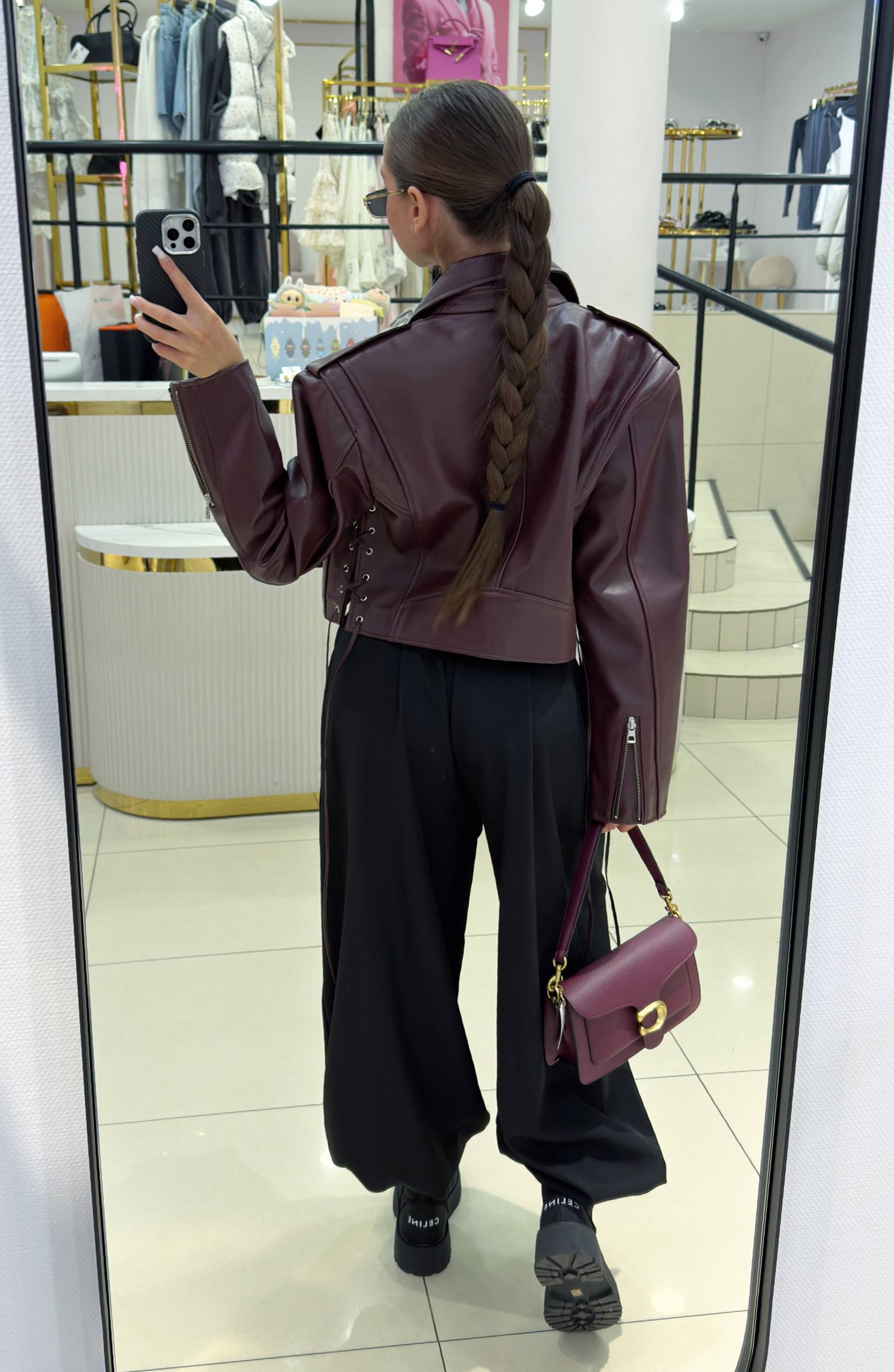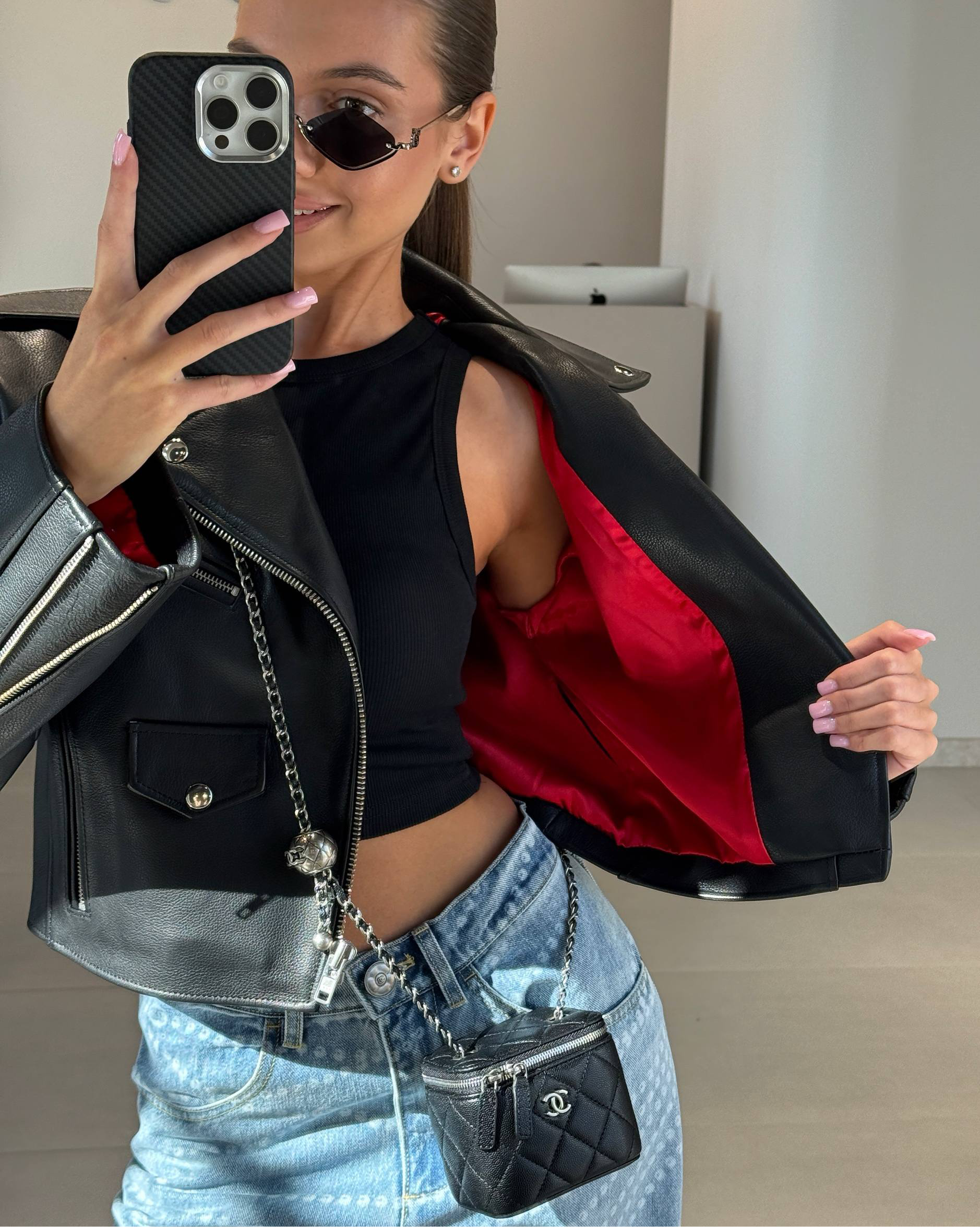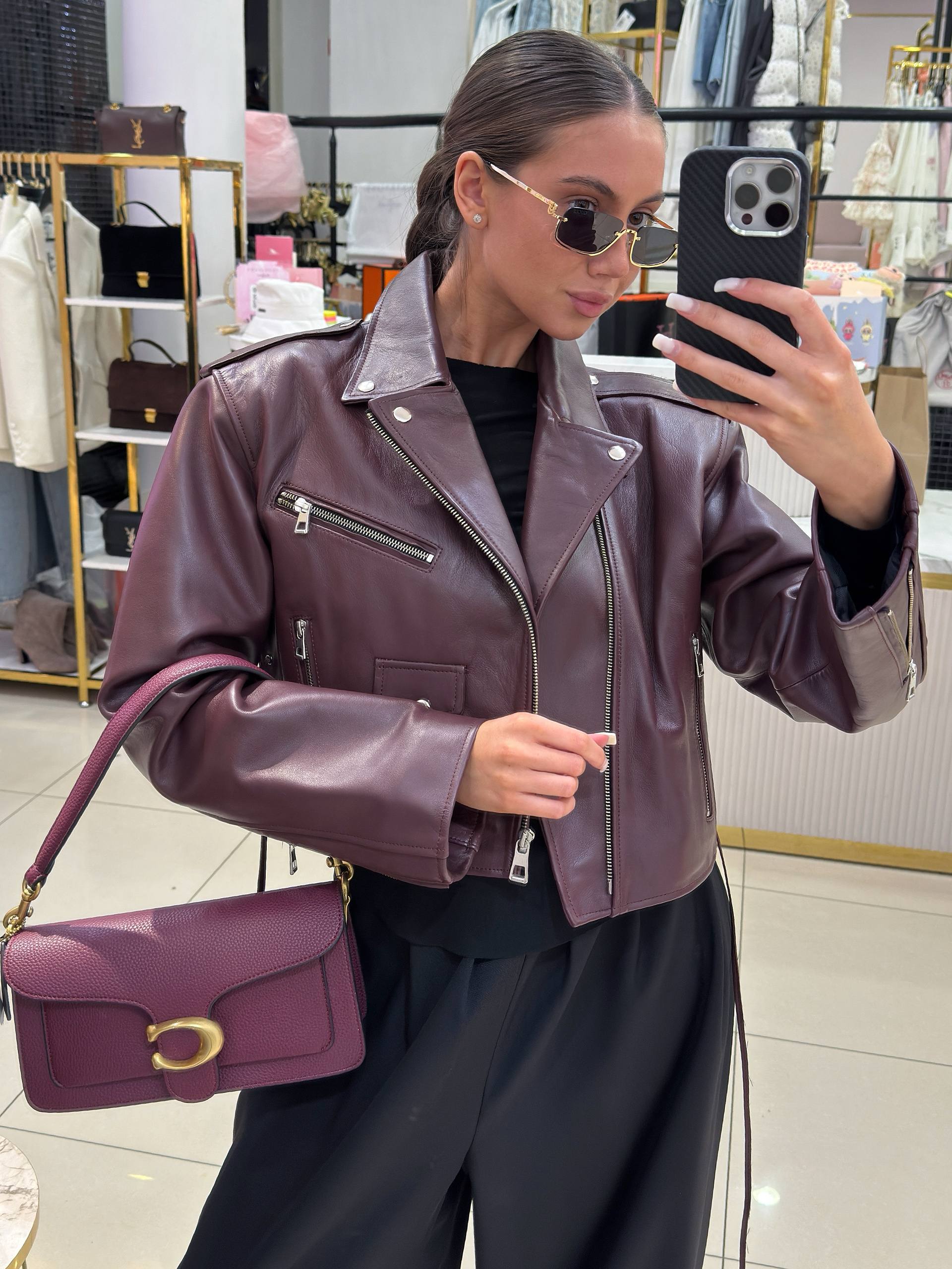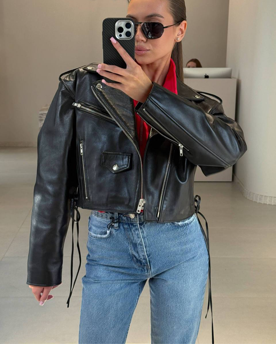 Este o geacă de piele naturală, scurtă, tip biker, cu un design modern și detalii statement.