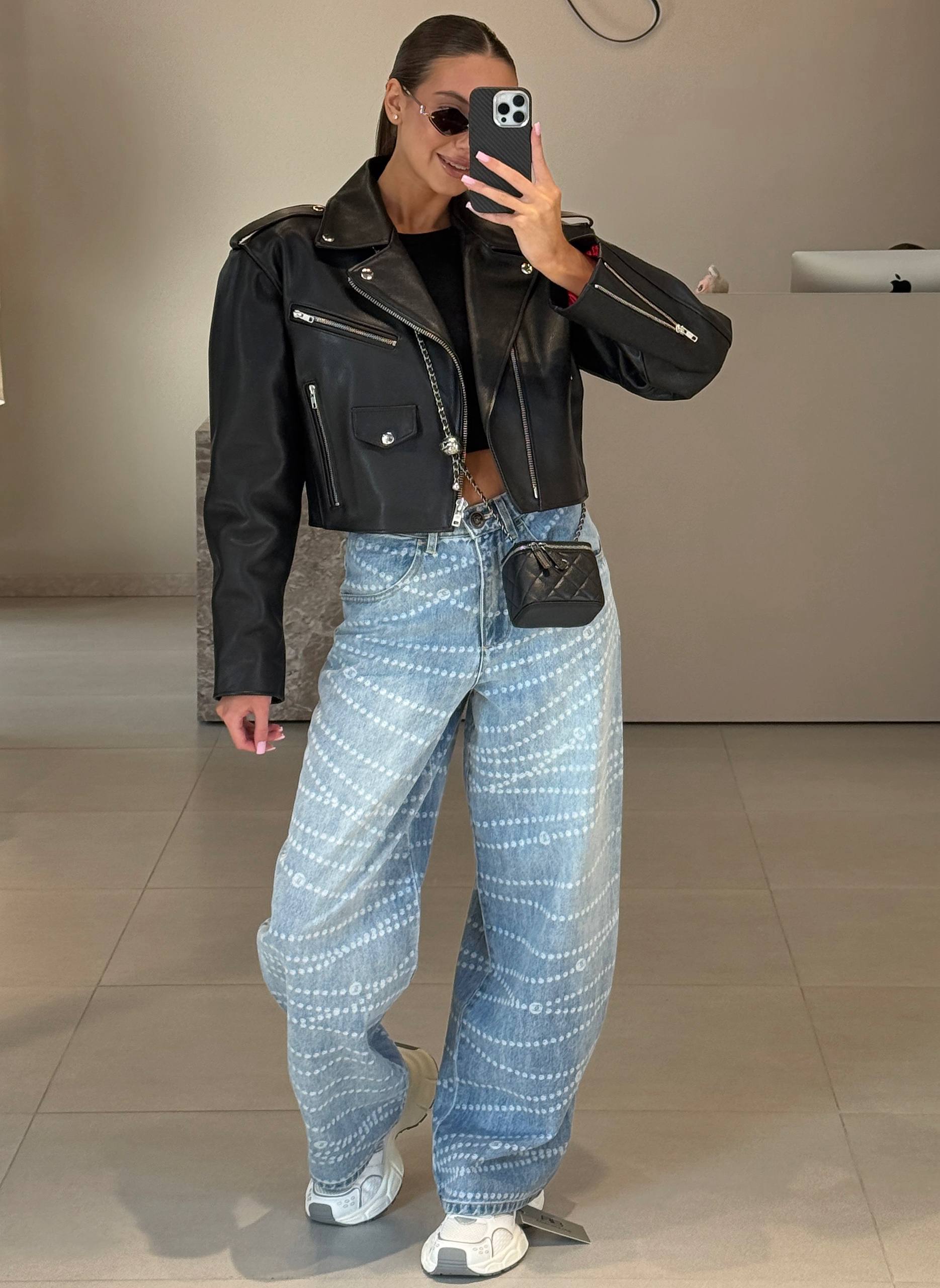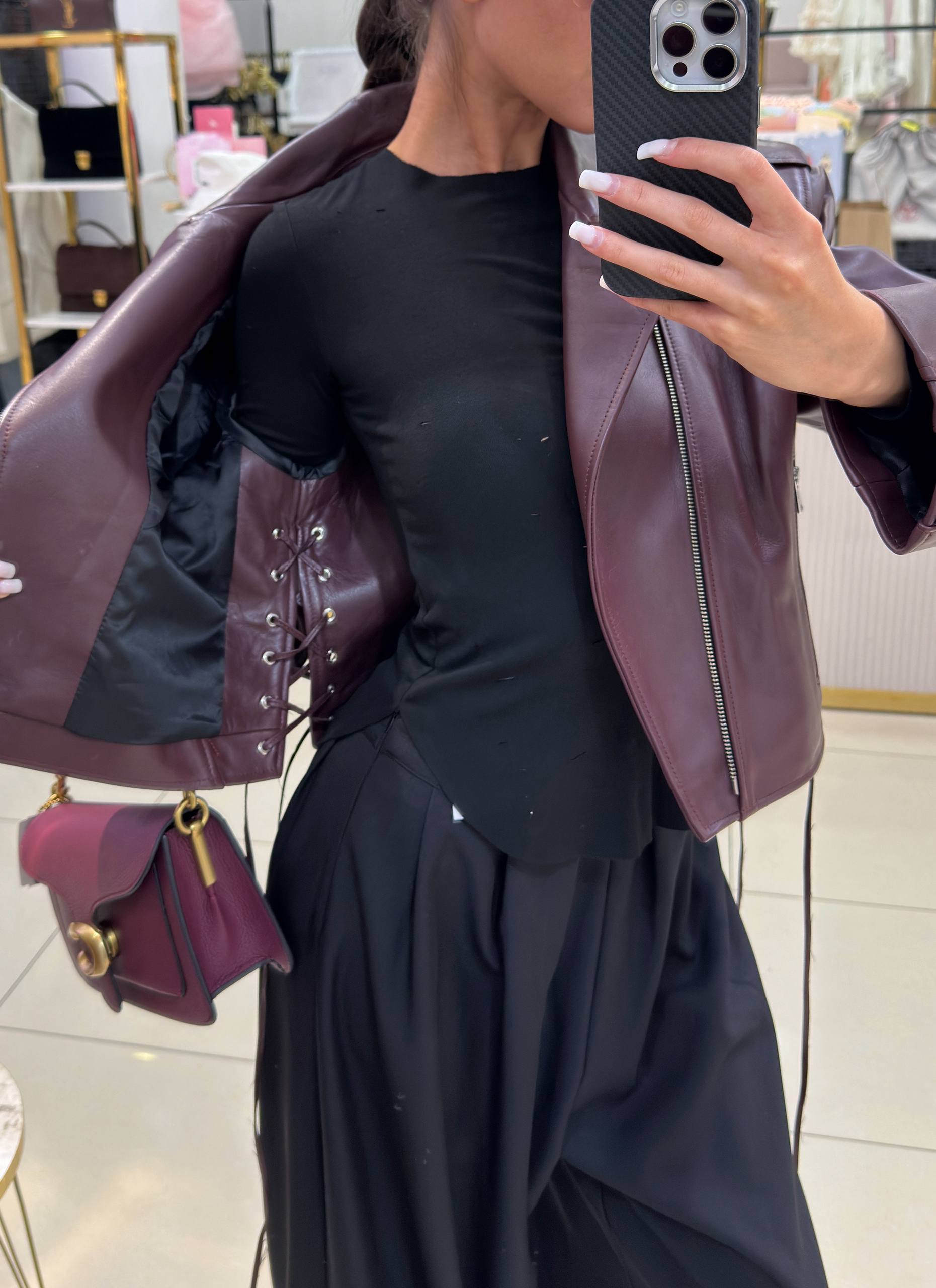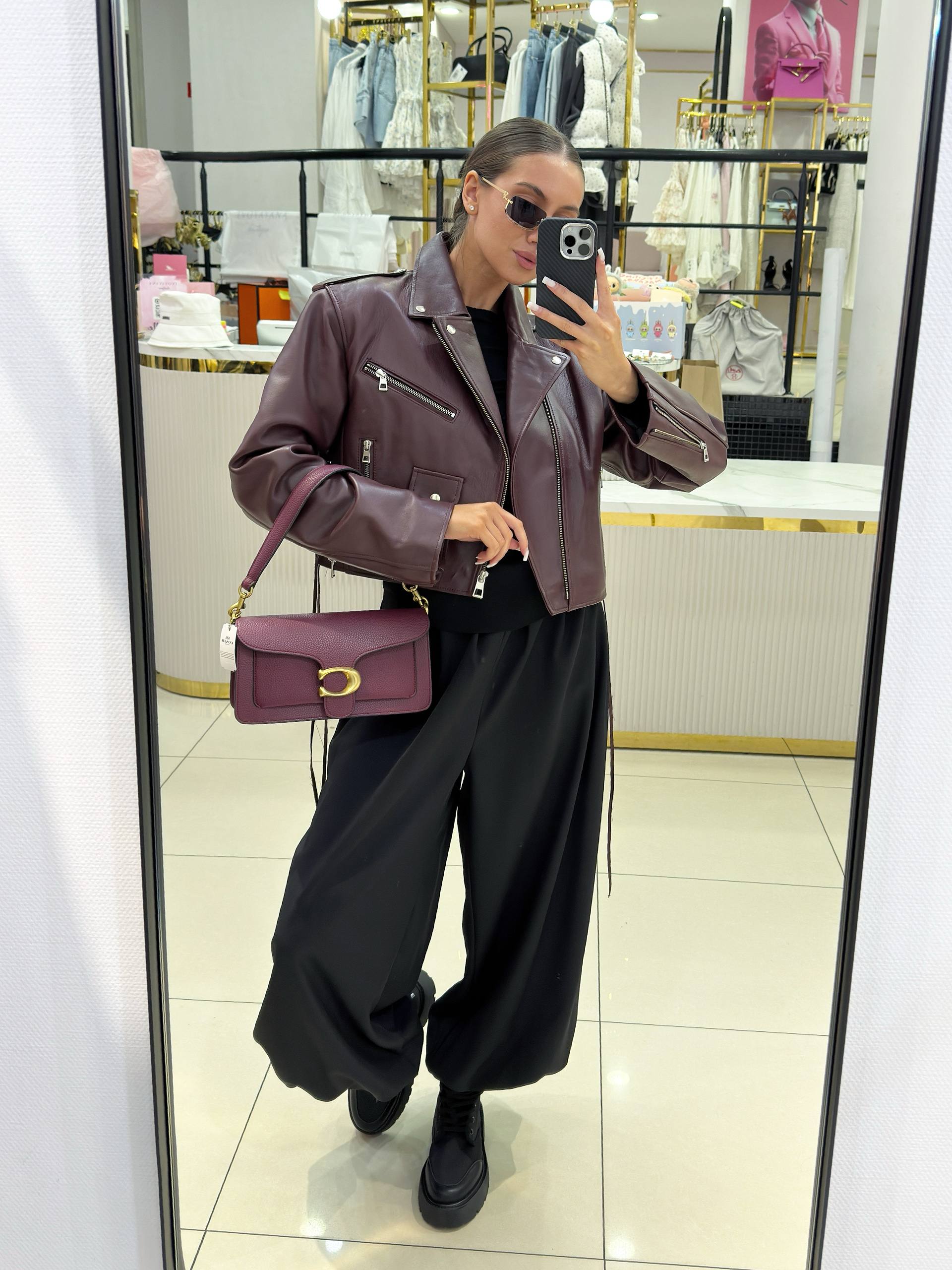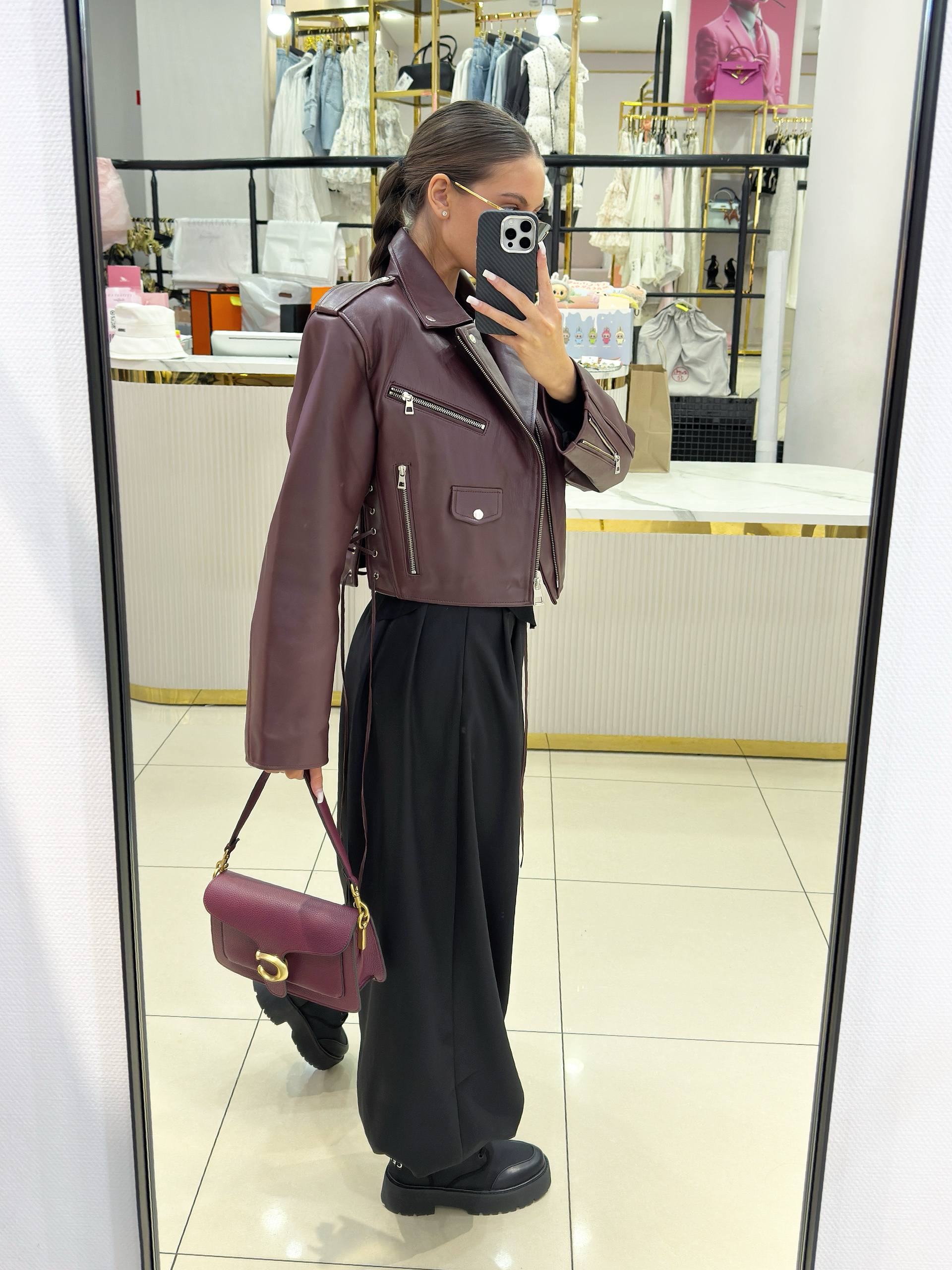 Este o geacă de piele naturală, scurtă, tip biker, cu un design modern și detalii statement.