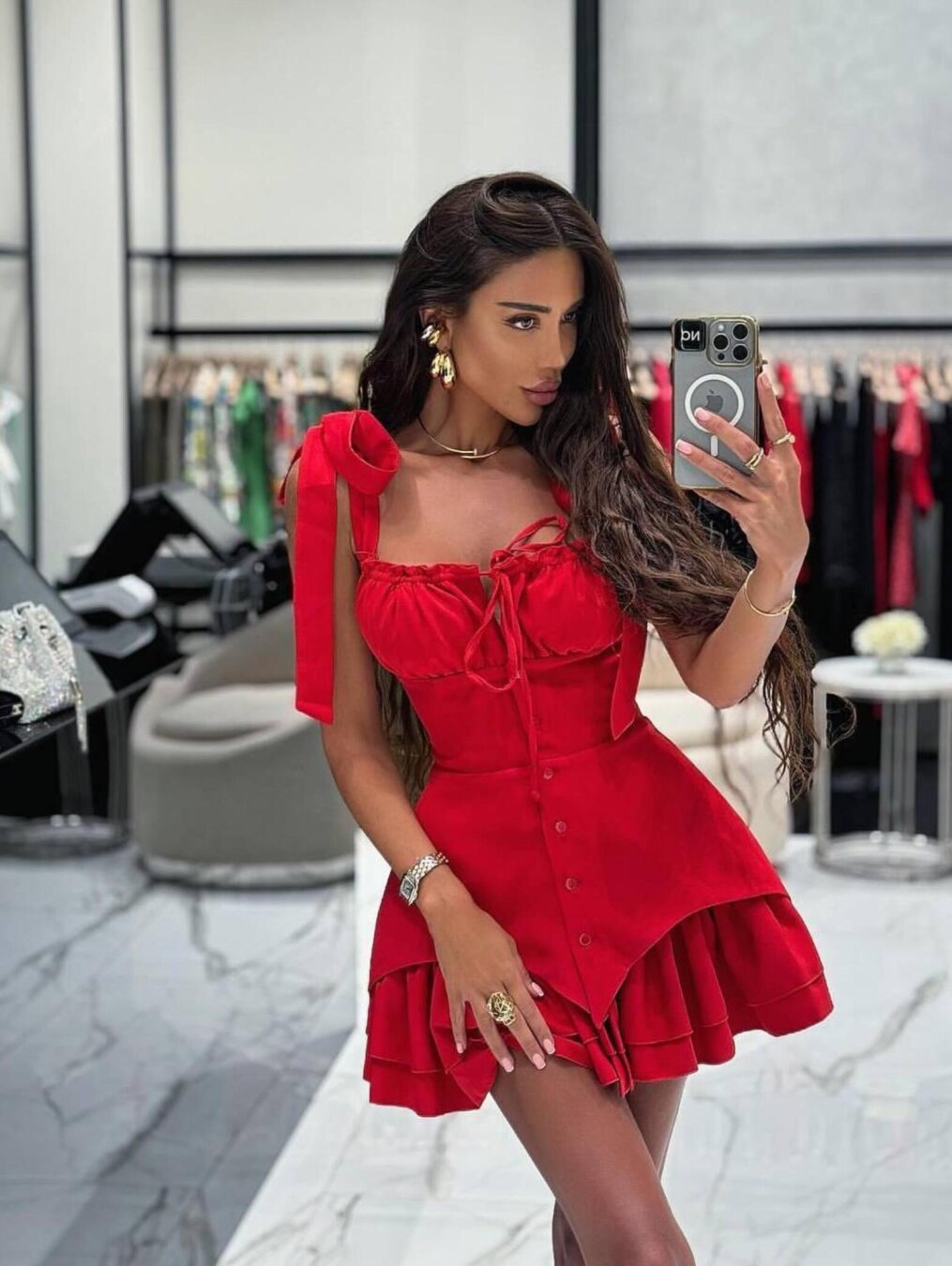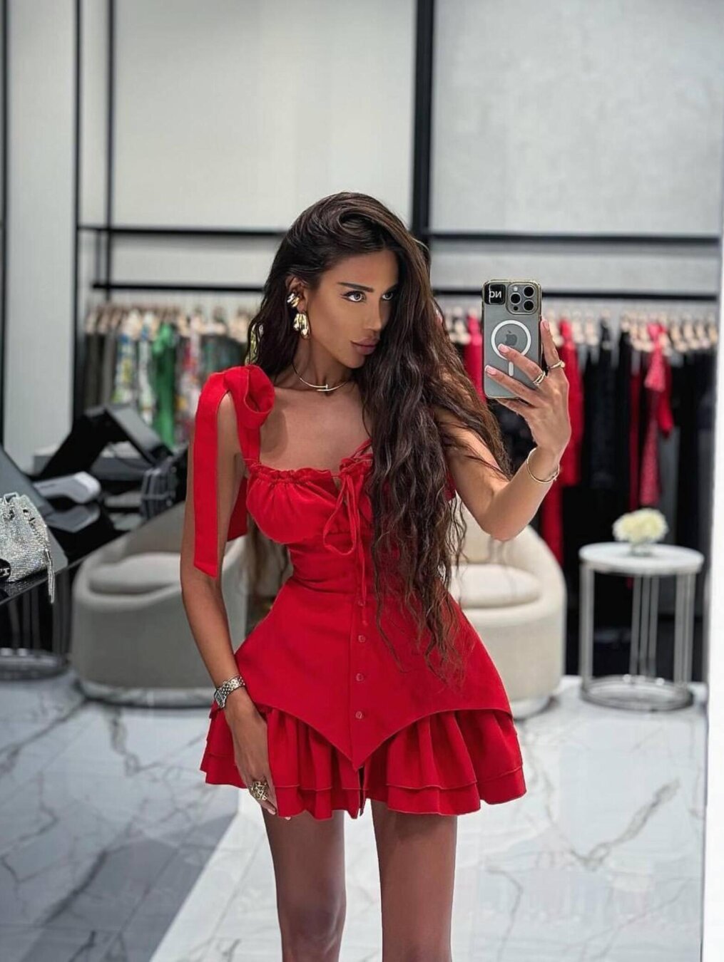 Rochia Lilly este o piesă statement, perfectă pentru evenimente speciale sau ieșiri de seară. Este o rochie mini, într-o nuanță vibrantă de roșu, cu un design asimetric și detalii feminine: