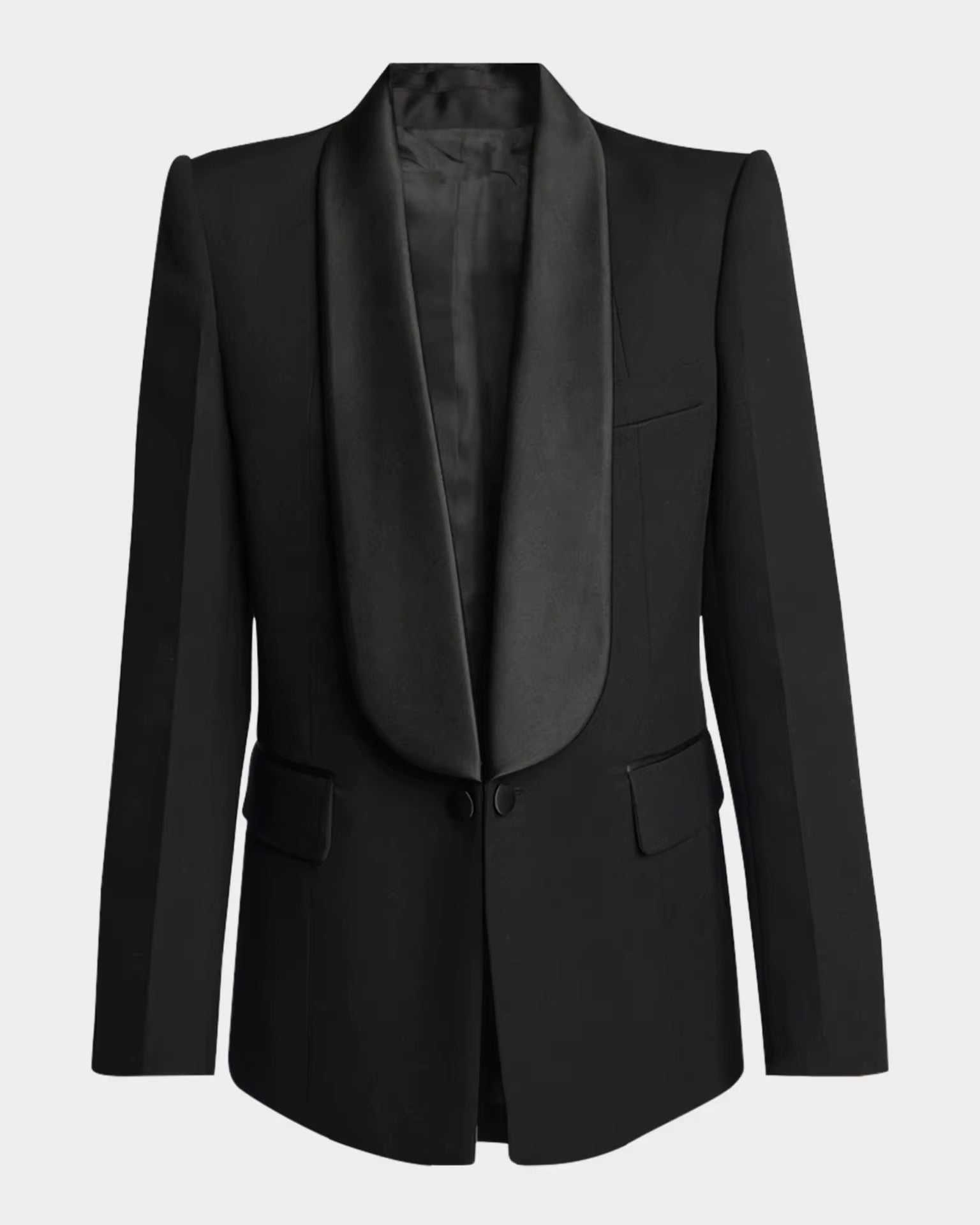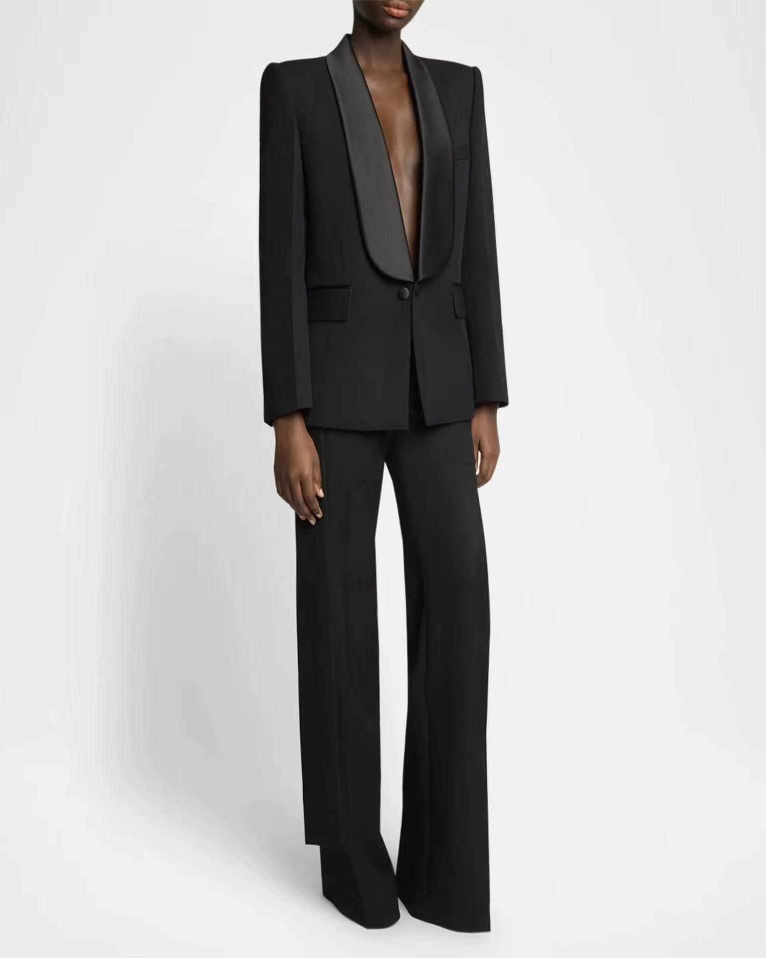 Sacou negru elegant, cu rever satinat lucios și croială cambrată. O piesă clasică reinterpretată pentru un look glam sofisticat.