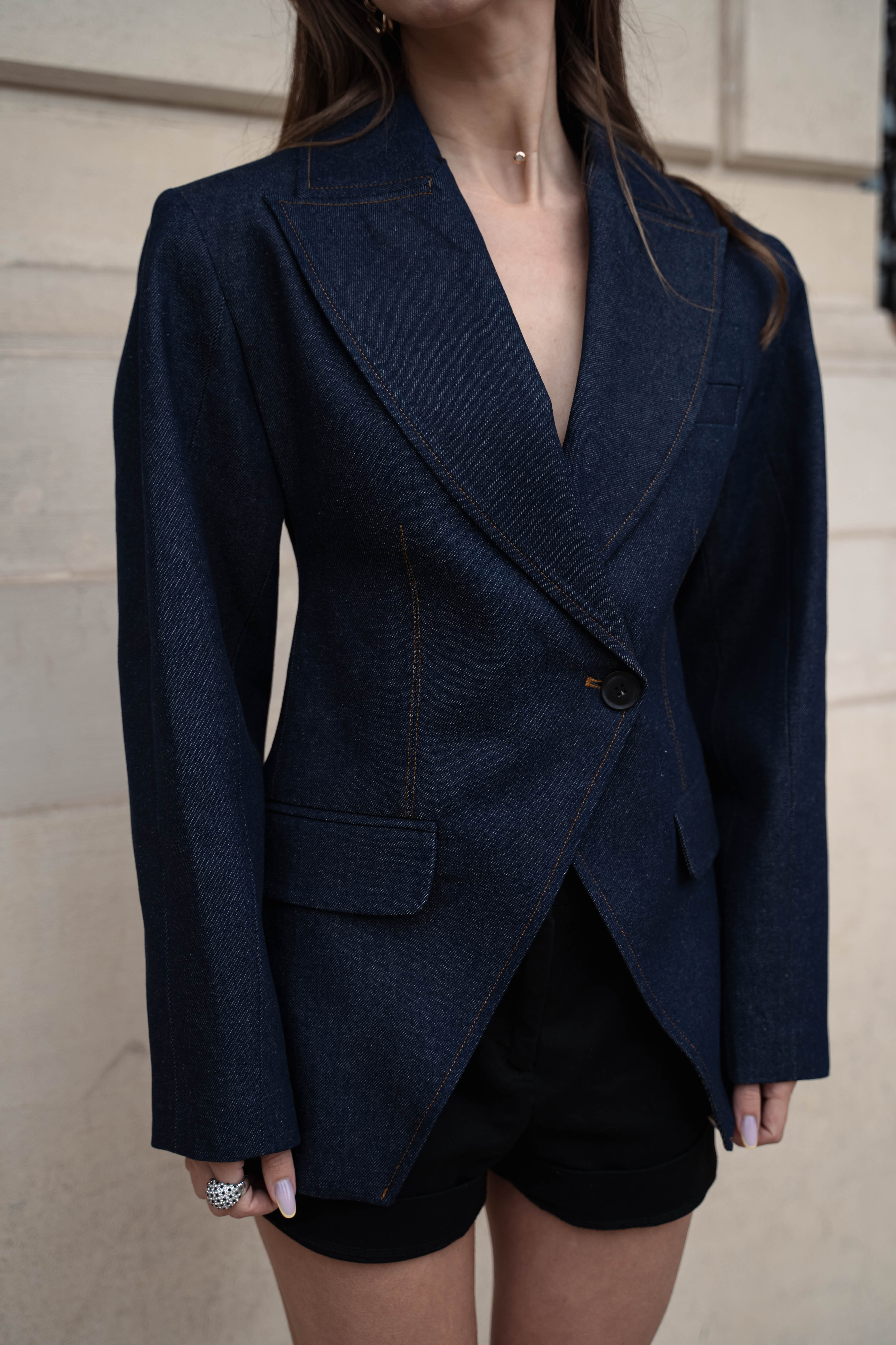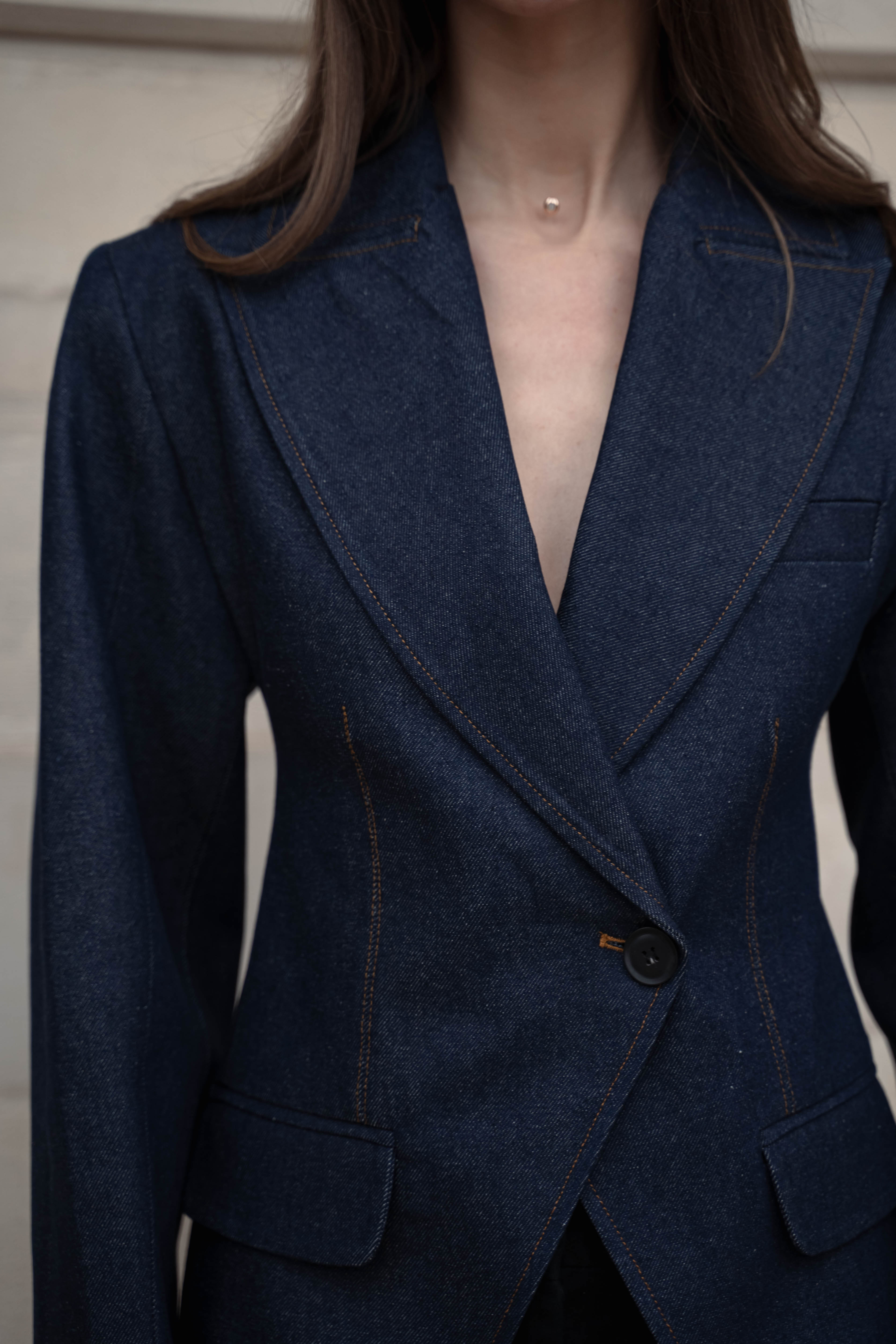 Sacoul din denim are o croială care se potrivește perfect pe corp, accentuând silueta fără a fi prea strâmt. Designul său ușor ajustabil și liniile curate fac din acest sacou o piesă care poate fi purtată atât la birou, cât și într-un cadru mai relaxat.