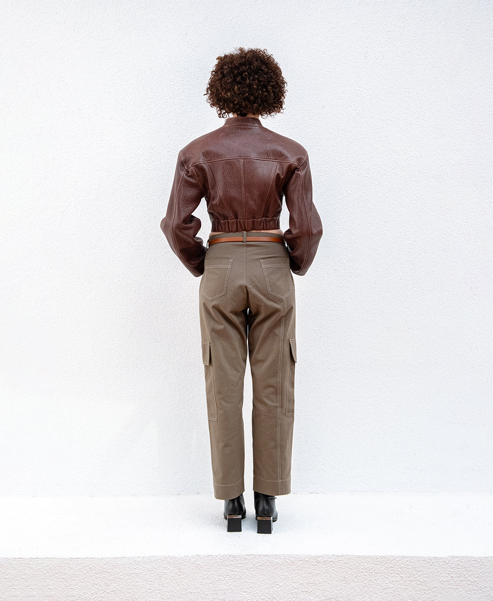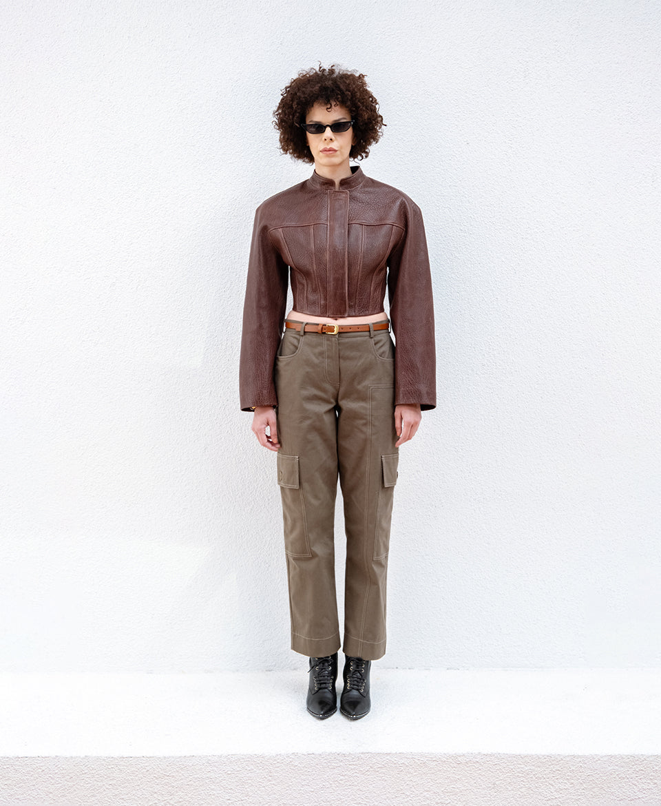 Această geacă scurtă din piele naturală este o piesă statement ce redefinește stilul urban printr-un design minimalist și elegant. Realizată din piele autentică de cea mai bună calitate, are o croială structurată ce pune în valoare talia și umerii, oferind o siluetă puternică și modernă.