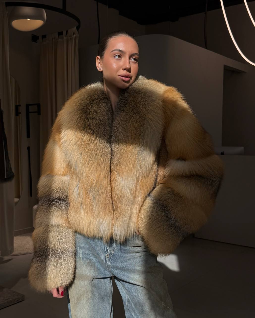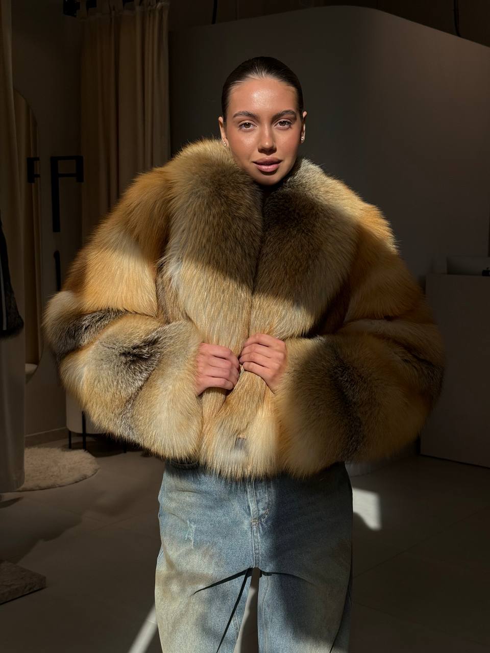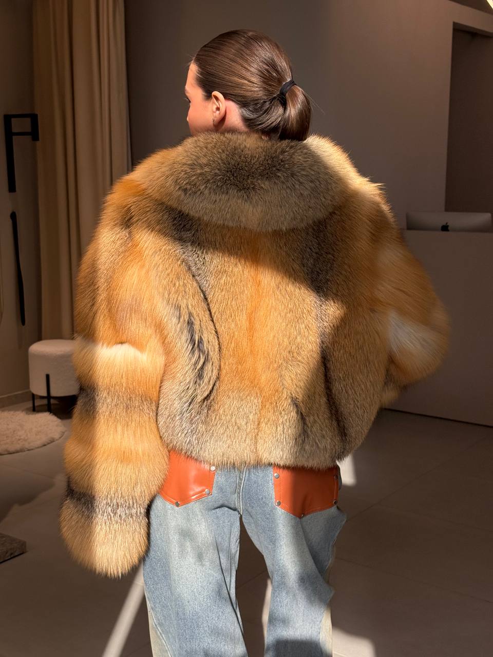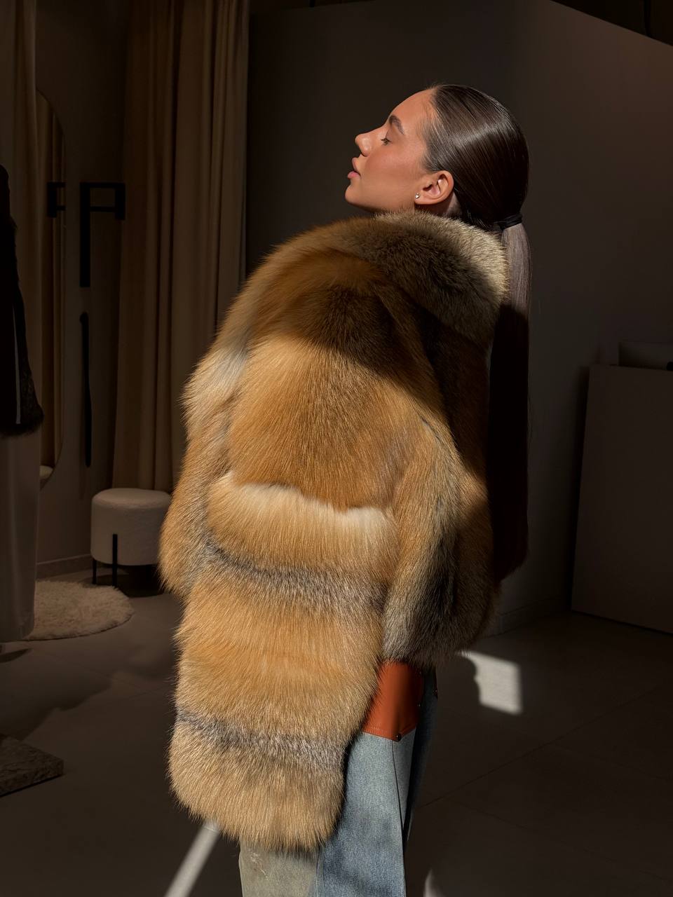 Această haină elegantă este realizată din blană naturală de vulpe, având o textură bogată și un luciu natural care conferă un aer luxos și sofisticat.
