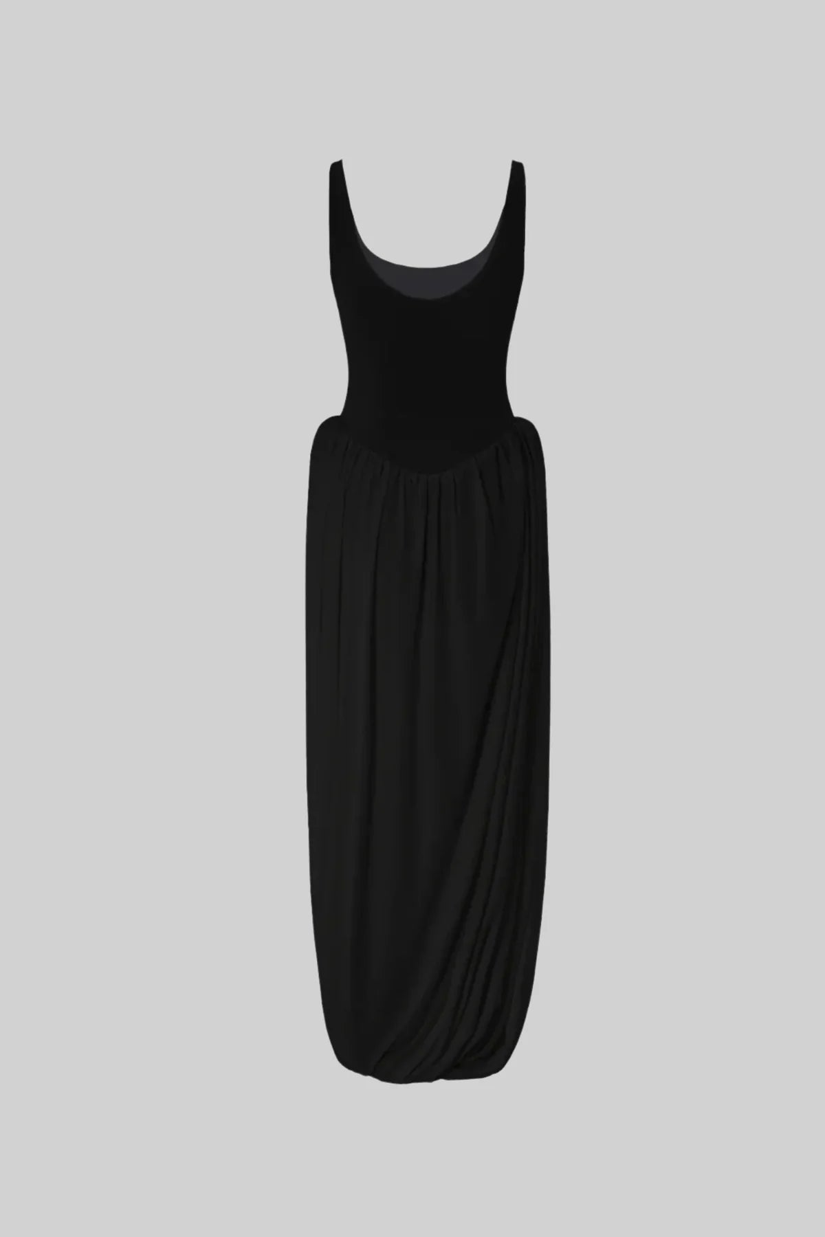Îndrăznește să cucerești privirile cu această rochie albă spectaculoasă, un statement al eleganței moderne. Realizată dintr-un material elastic și lejer, rochia îmbină perfect confortul cu rafinamentul. Partea superioară, tip maiou, urmează linia corpului, în timp ce fusta amplă, drapată, adaugă fluiditate și mister fiecărui pas.