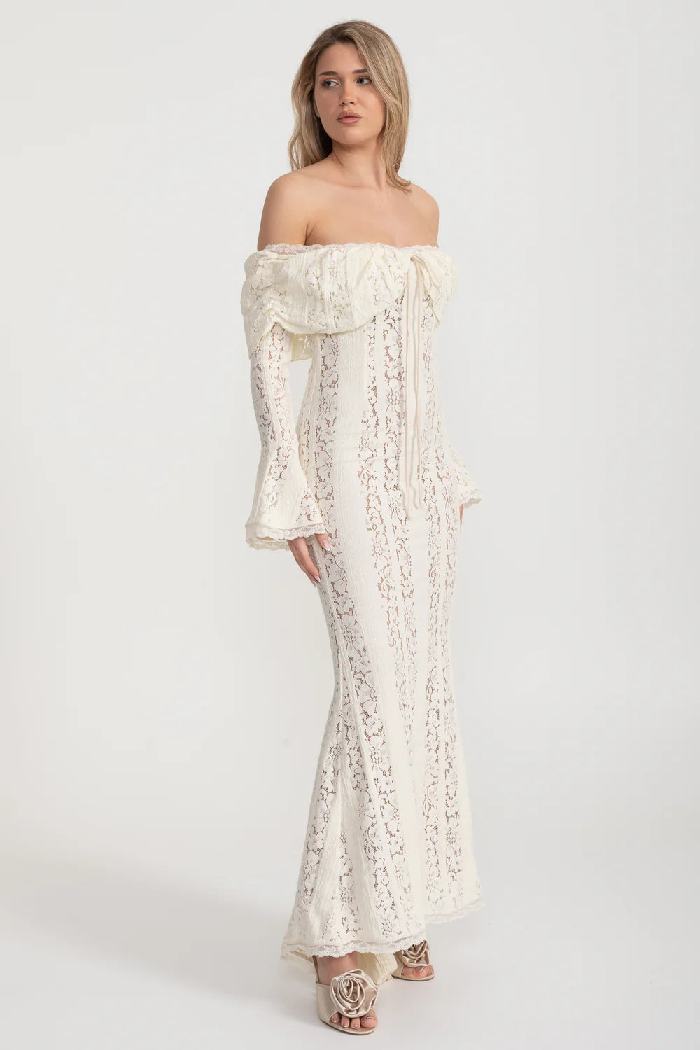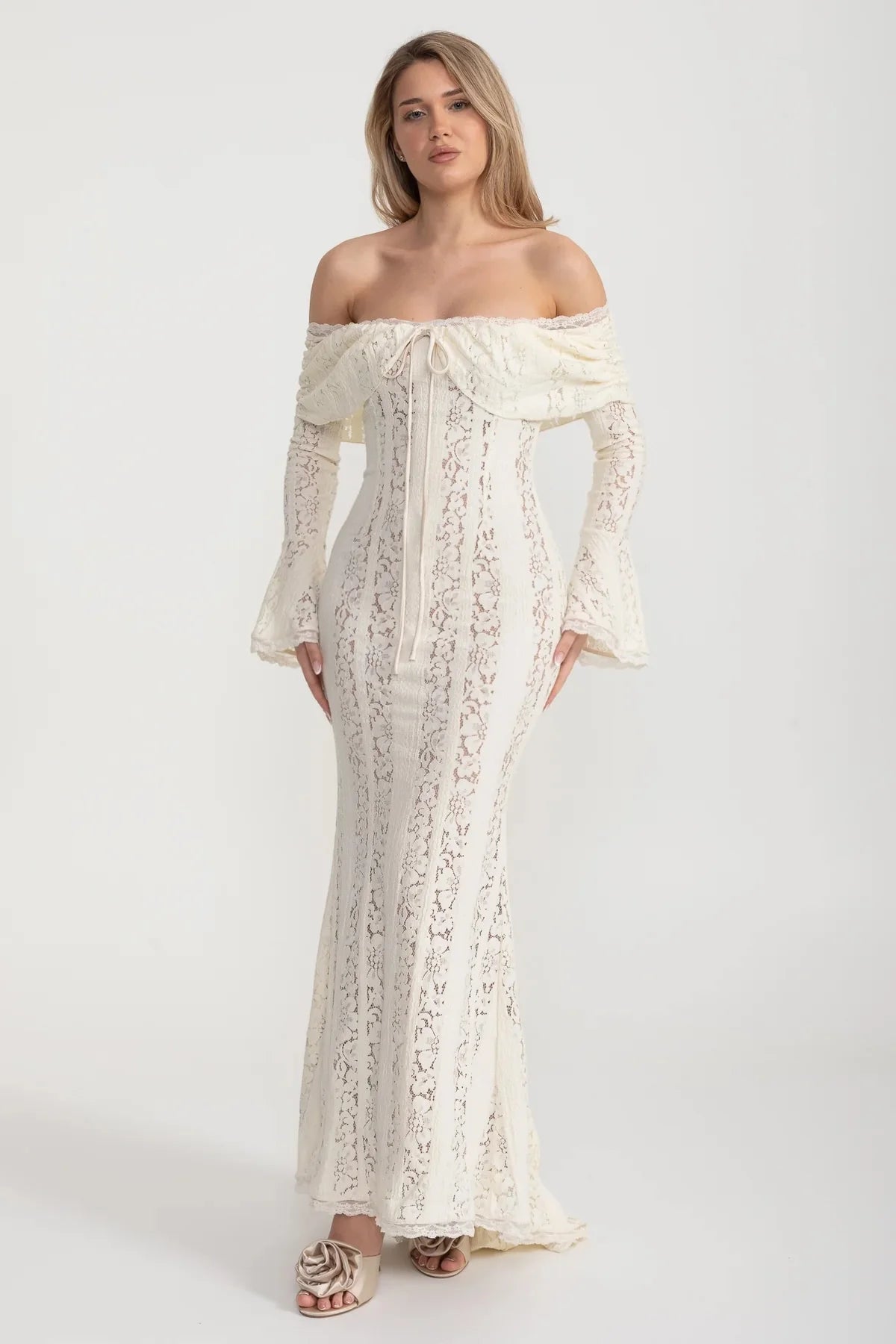 Aceasta este o rochie lungă, elegantă, de culoare crem/ivoire, realizată dintr-un material delicat de dantelă. Croiala este tip sirenă, mulată pe corp, accentuând silueta. Rochia are un design romantic și feminin, cu umerii goi (off-shoulder) și mâneci lungi, evazate la încheieturi. Partea superioară este decorată cu un volan delicat și o panglică subțire care se leagă în față, adăugând un detaliu subtil și rafinat.