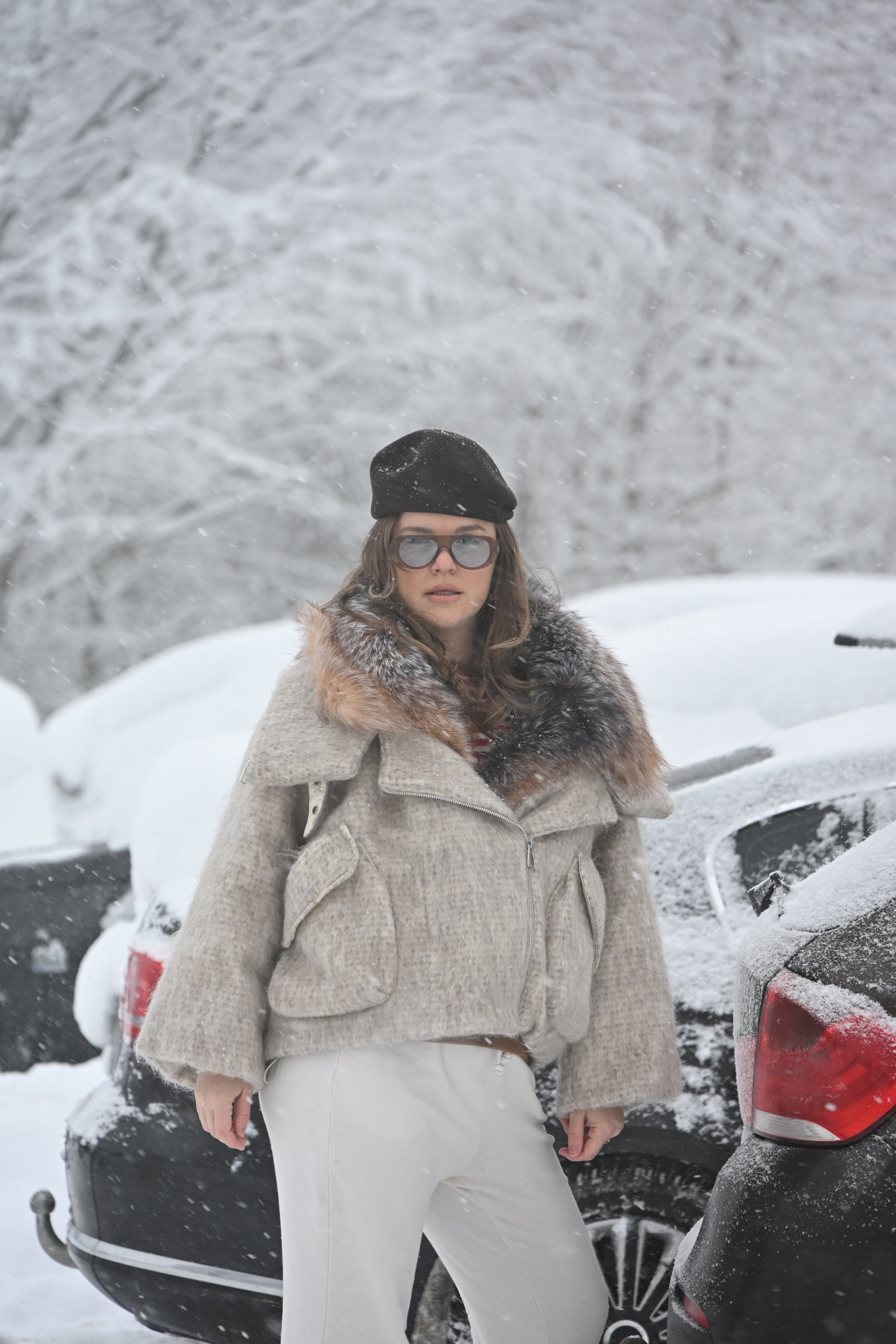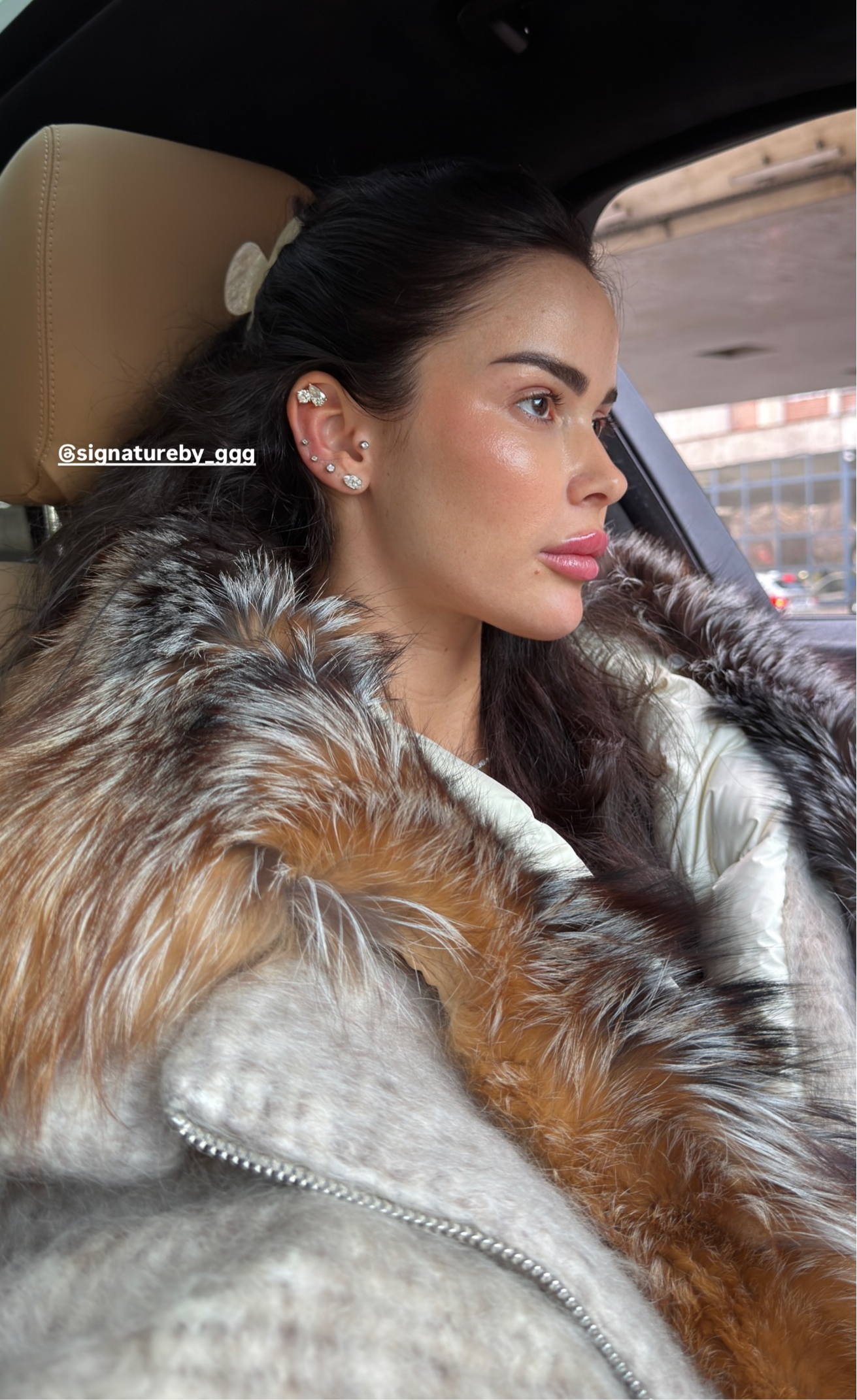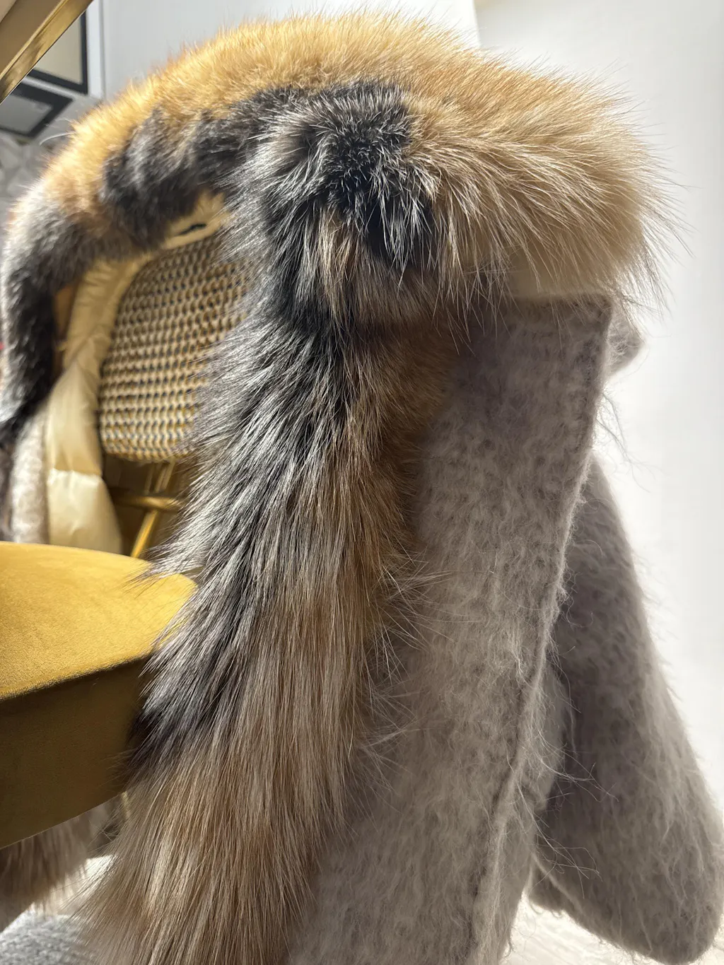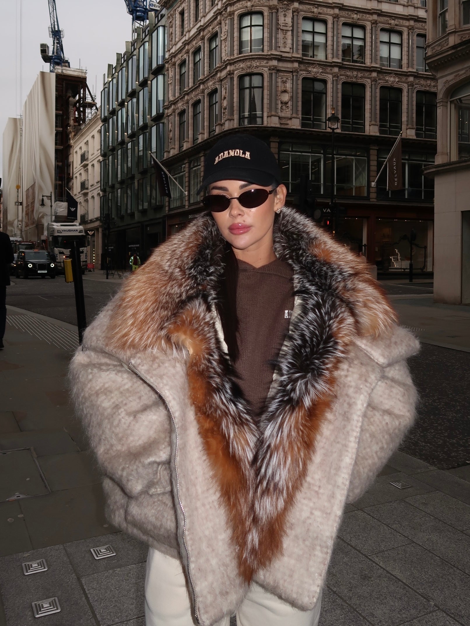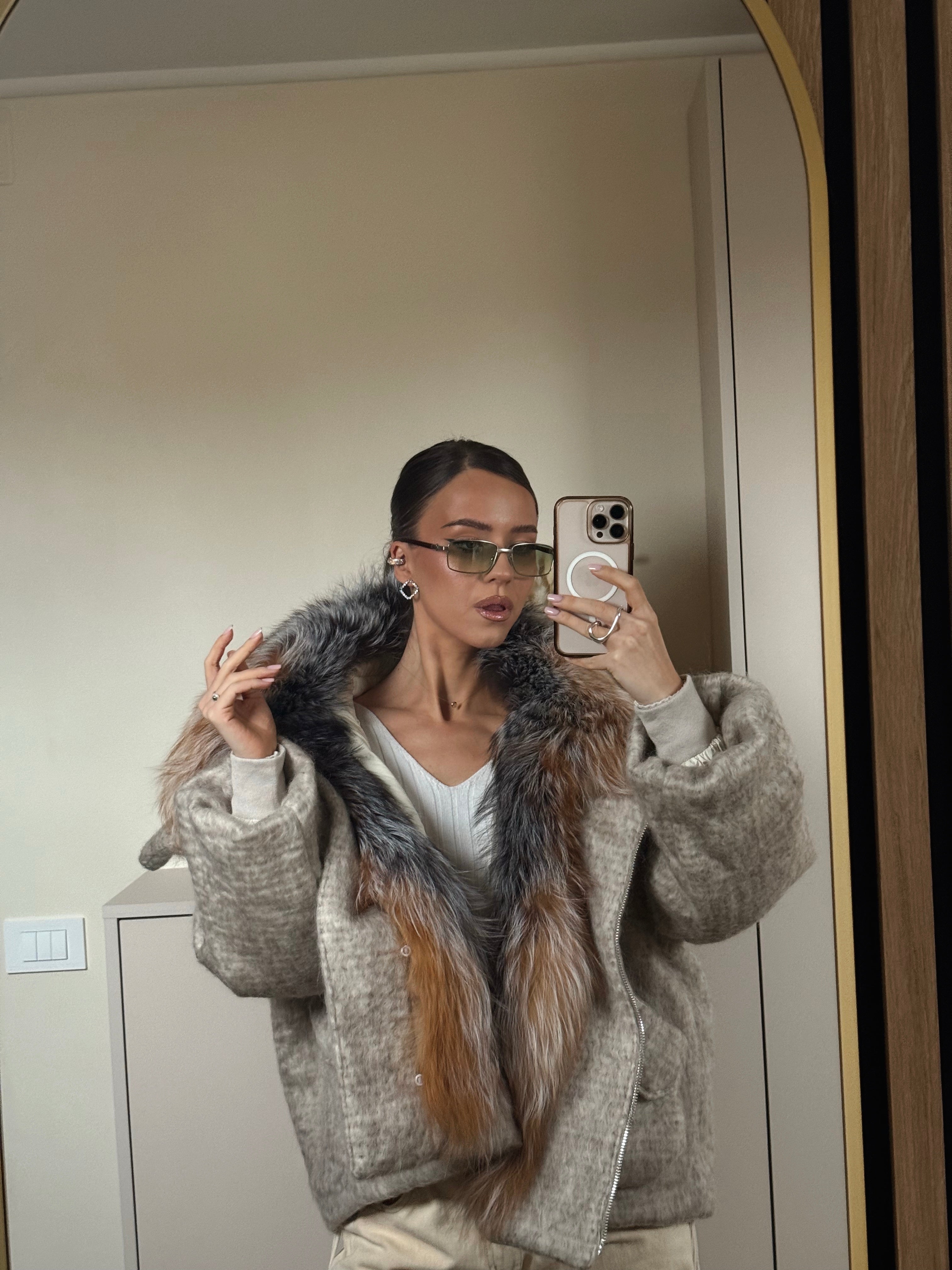 Jachetă oversize confecționată din stofă groasă premium, cu guler amplu din blană naturală de vulpe în nuanțe calde de maro și gri. Croiala voluminoasă oferă un aer modern, perfect echilibrat între eleganță și atitudine urbană.