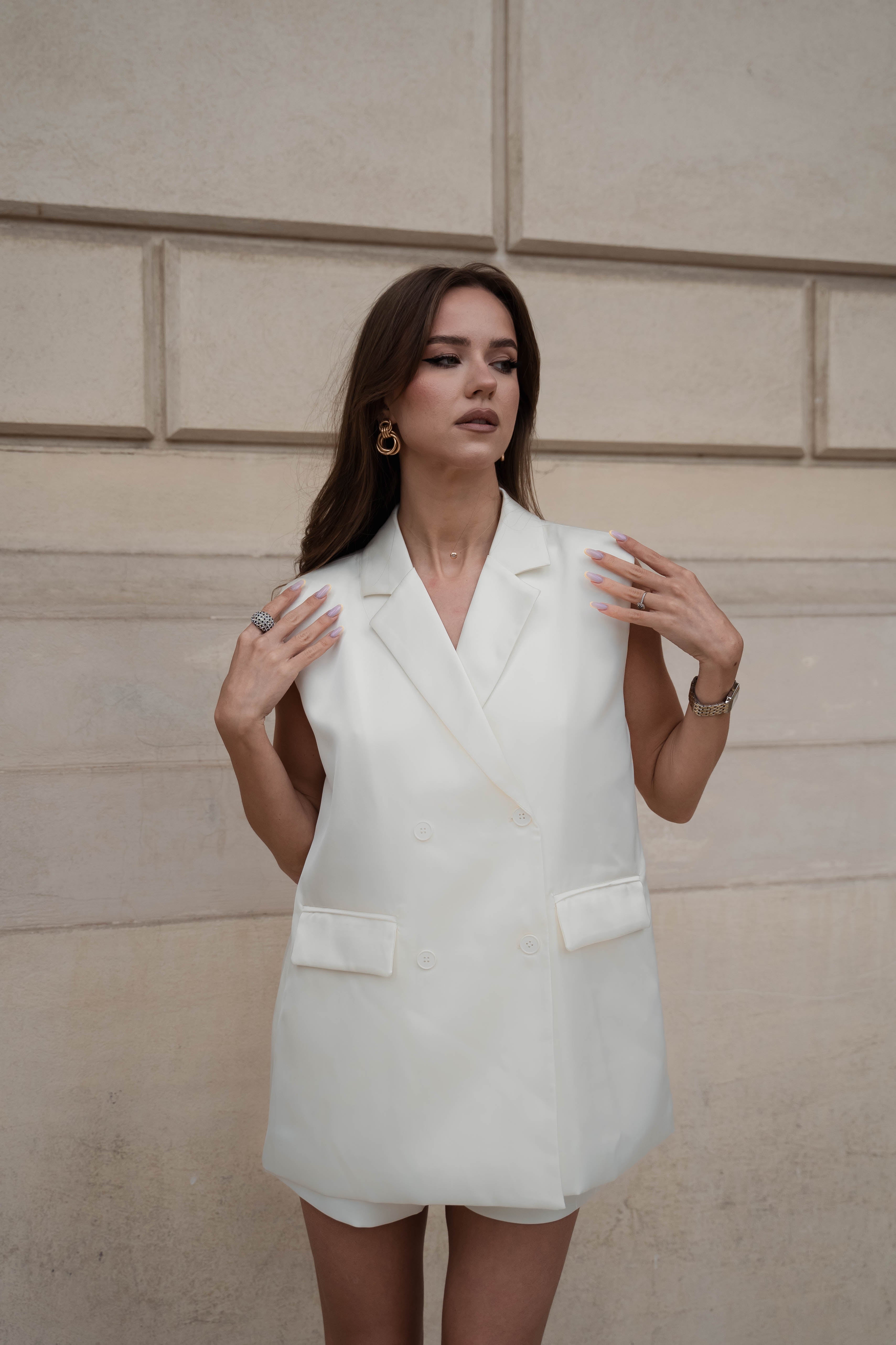 Acest set compus din sacou fără mâneci și pantaloni scurți este expresia perfectă a eleganței moderne cu un twist feminin. Realizat dintr-un material fin, cu aspect satinat, setul este ideal pentru evenimente de zi, brunch-uri stylish sau apariții sofisticate în oraș.