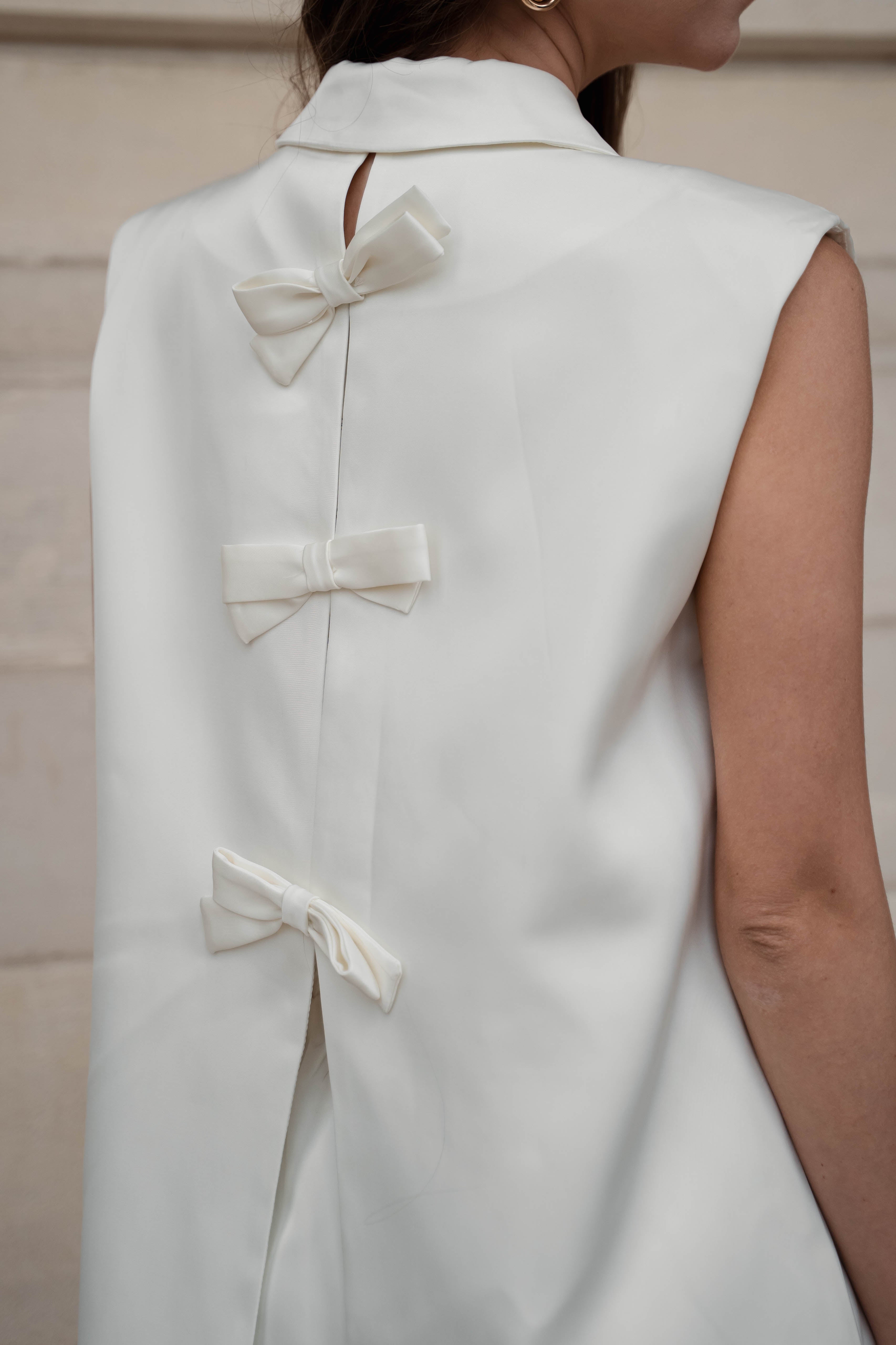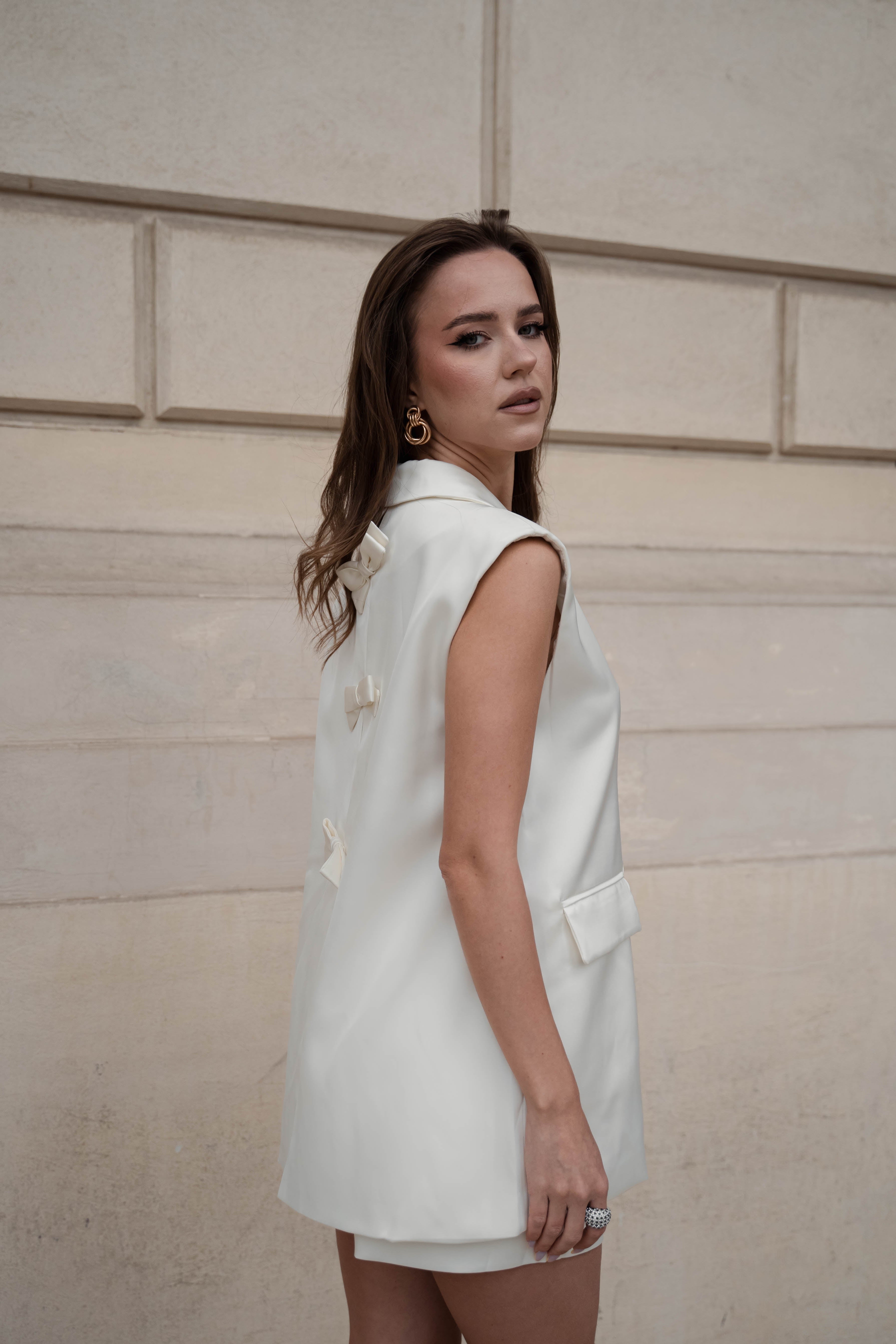 Sacoul lung, cu croială dublu rând de nasturi, impresionează prin detaliile cu funde decorative pe spate, adăugând o notă romantică și neașteptată. Pantalonii scurți au o talie înaltă și buzunare laterale, oferind confort și stil fără efort.