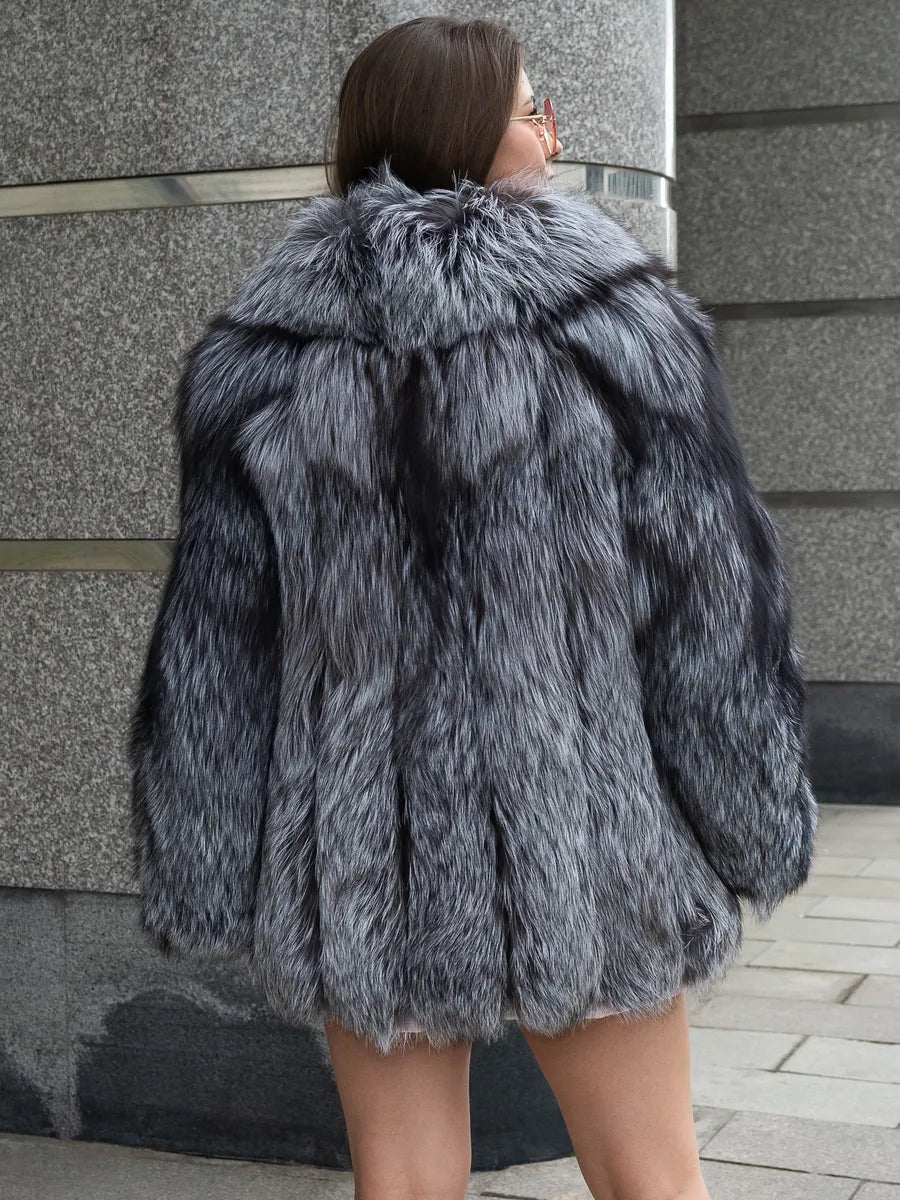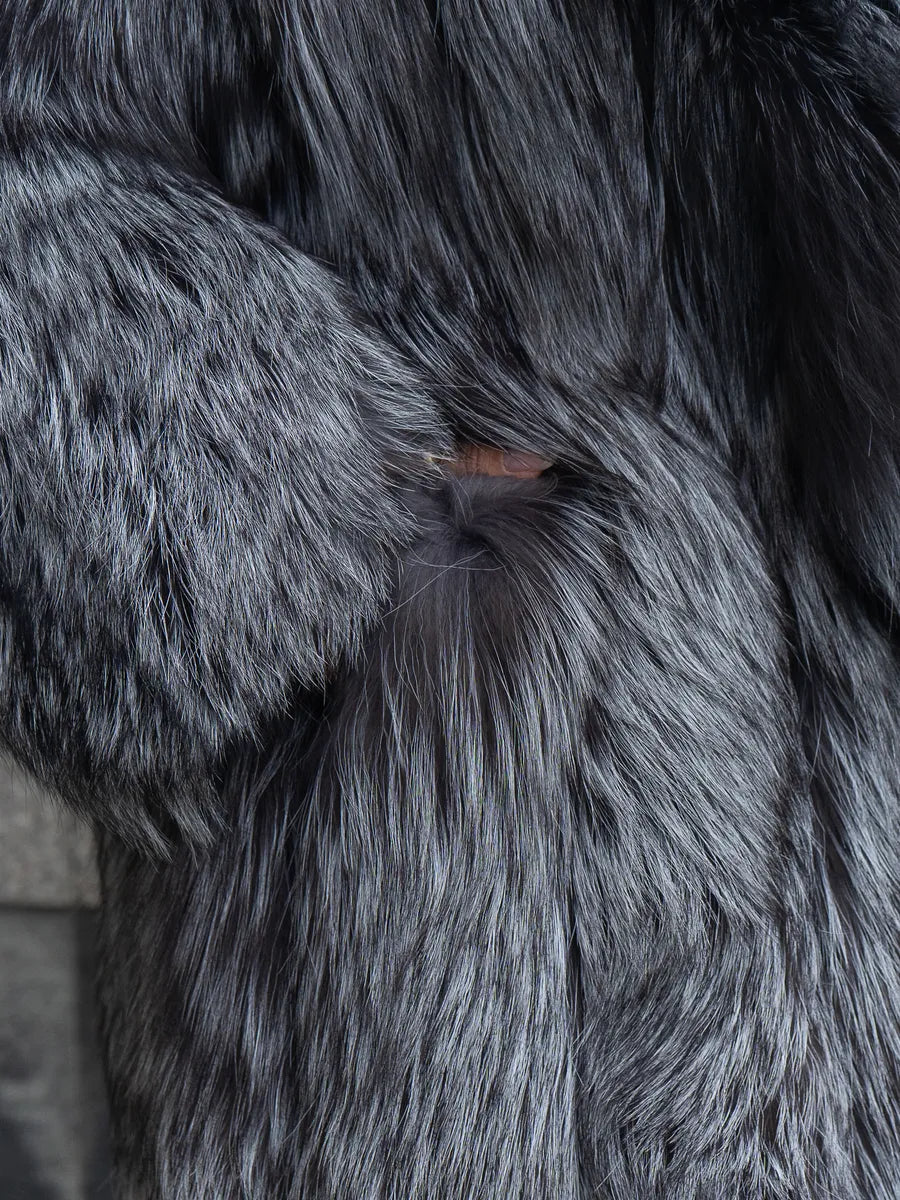 Diana este o haină spectaculoasă, realizată din blană naturală de vulpe argintie, care emană eleganță și lux atemporal. Cu o textură bogată, luciu natural și o croială feminină, această piesă este alegerea ideală pentru femeia care își dorește rafinament și impact vizual în fiecare apariție.